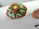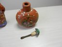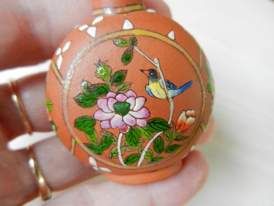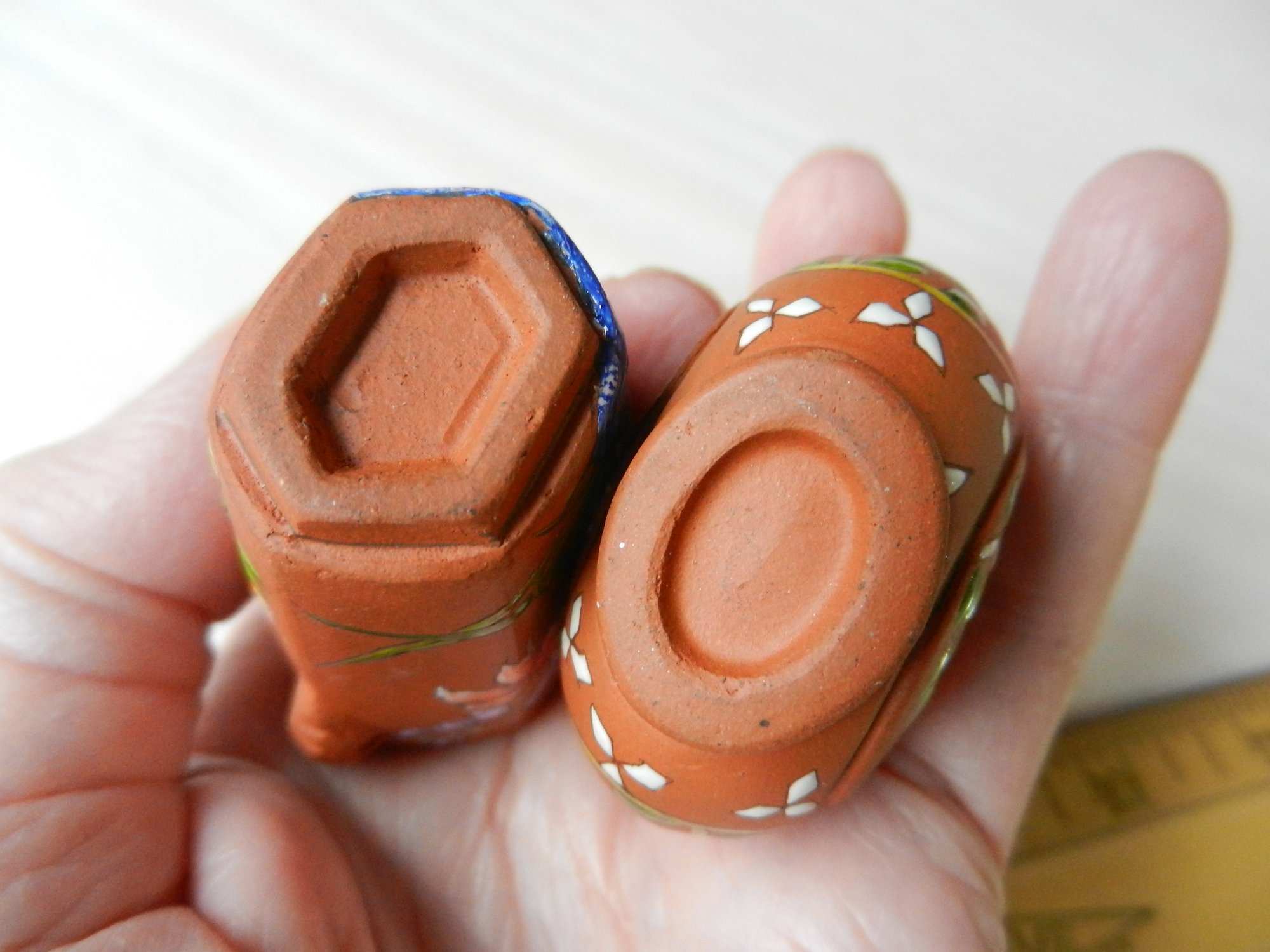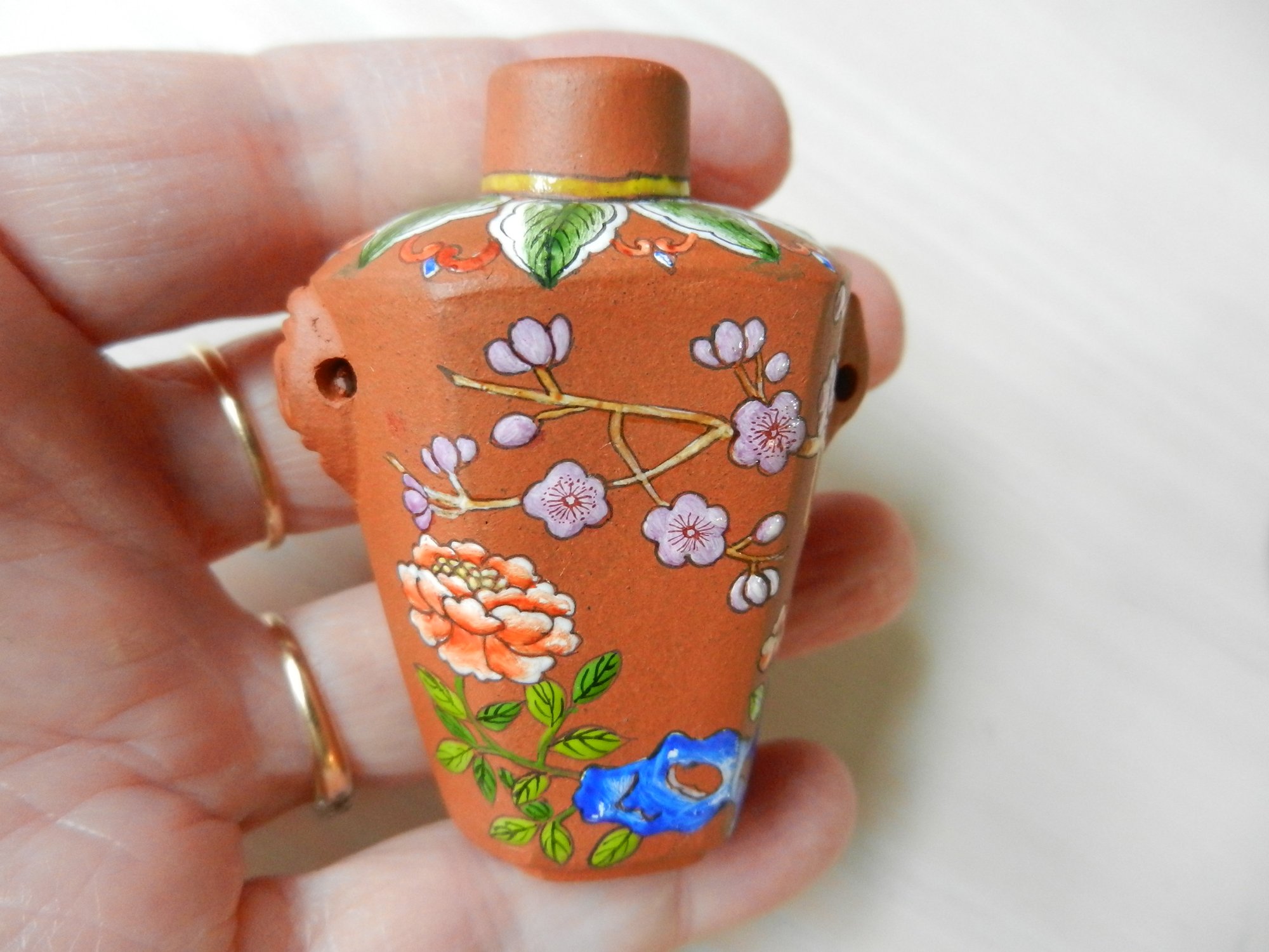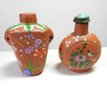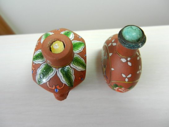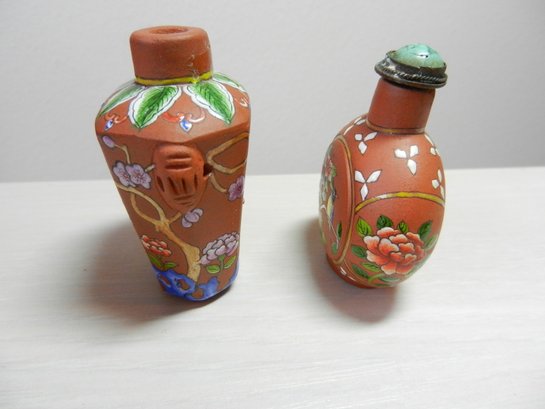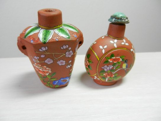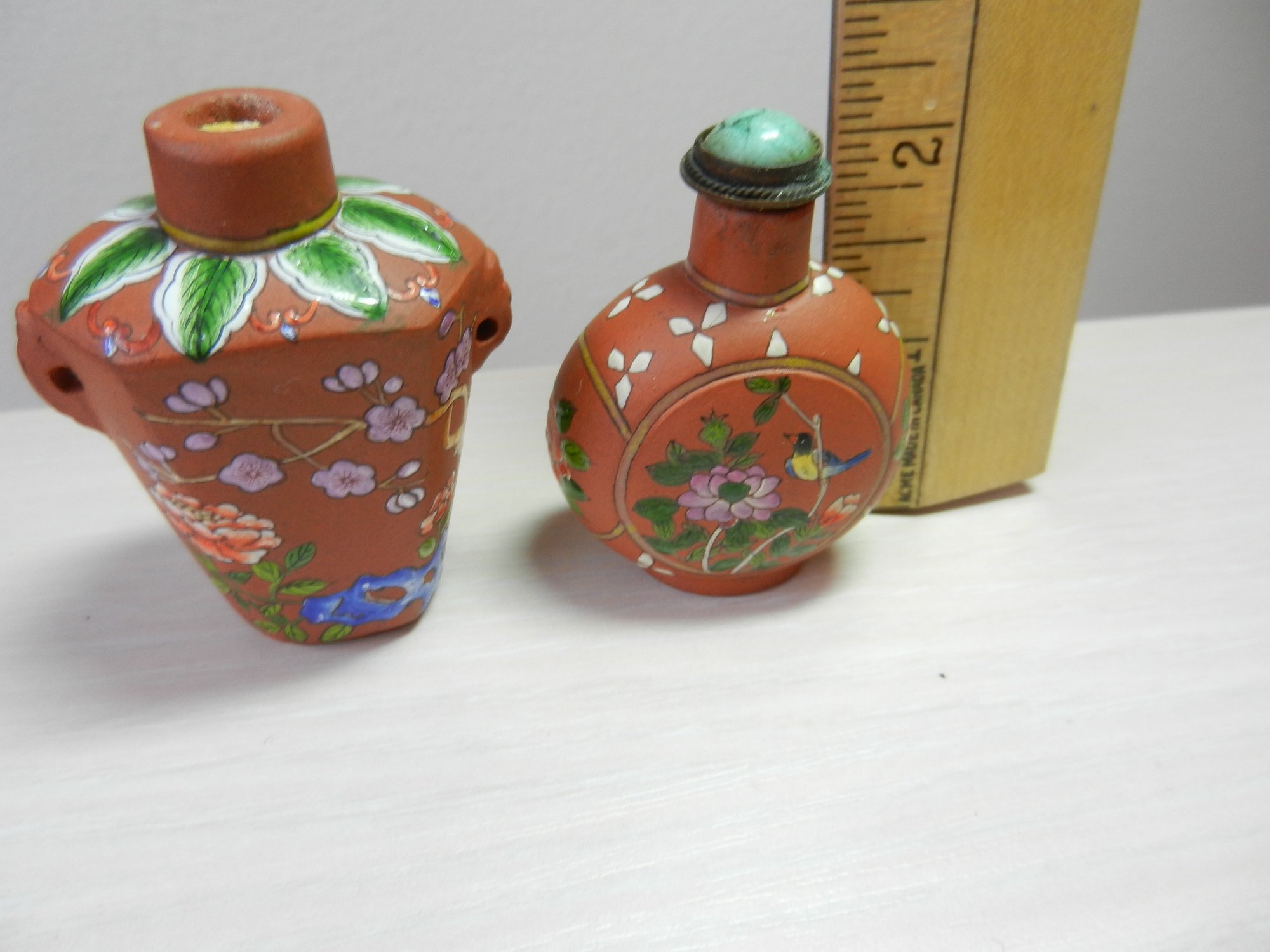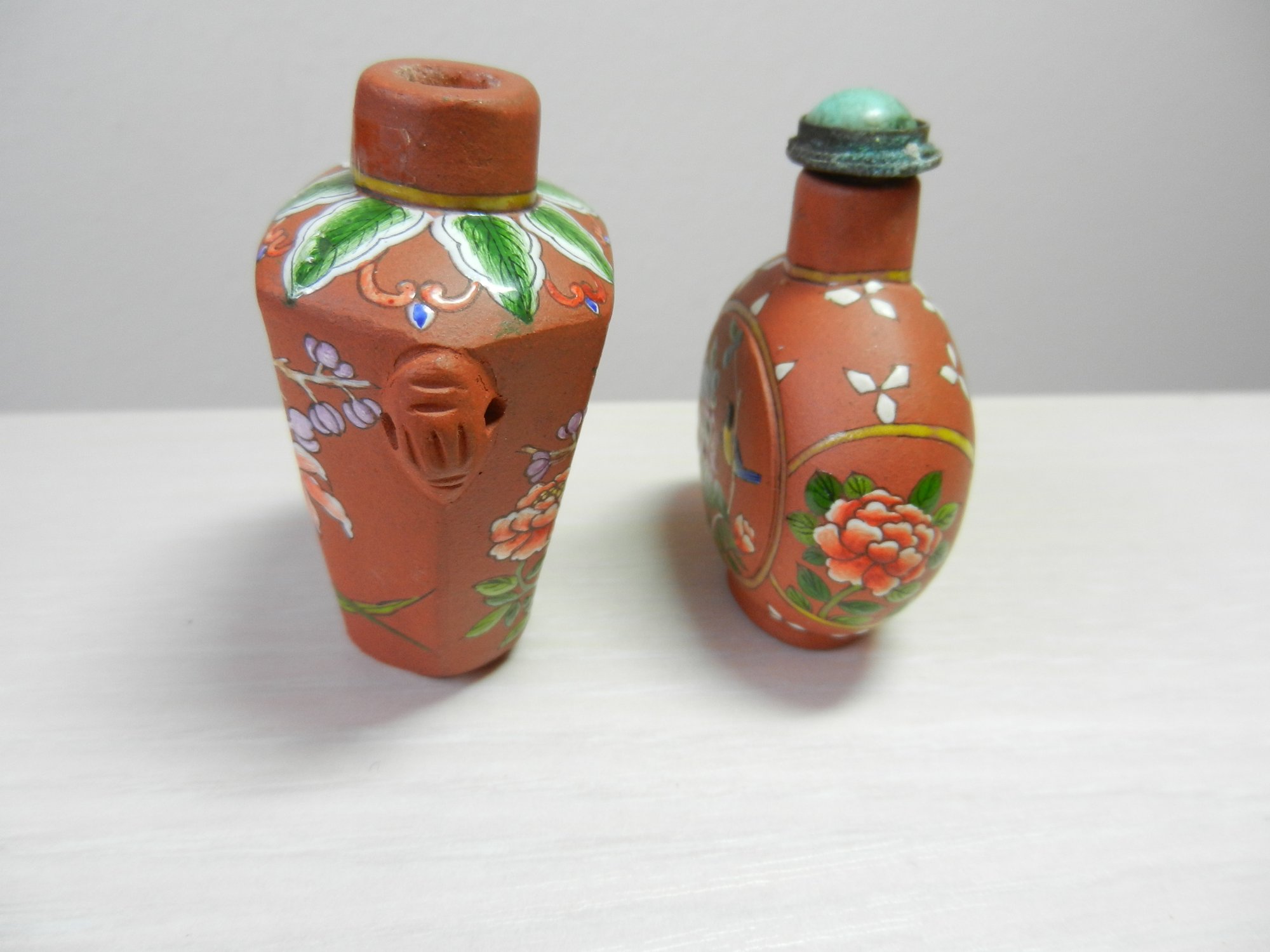 Vintage 2 earthenware snuff bottles with glazed flowers and birds (DP30)