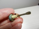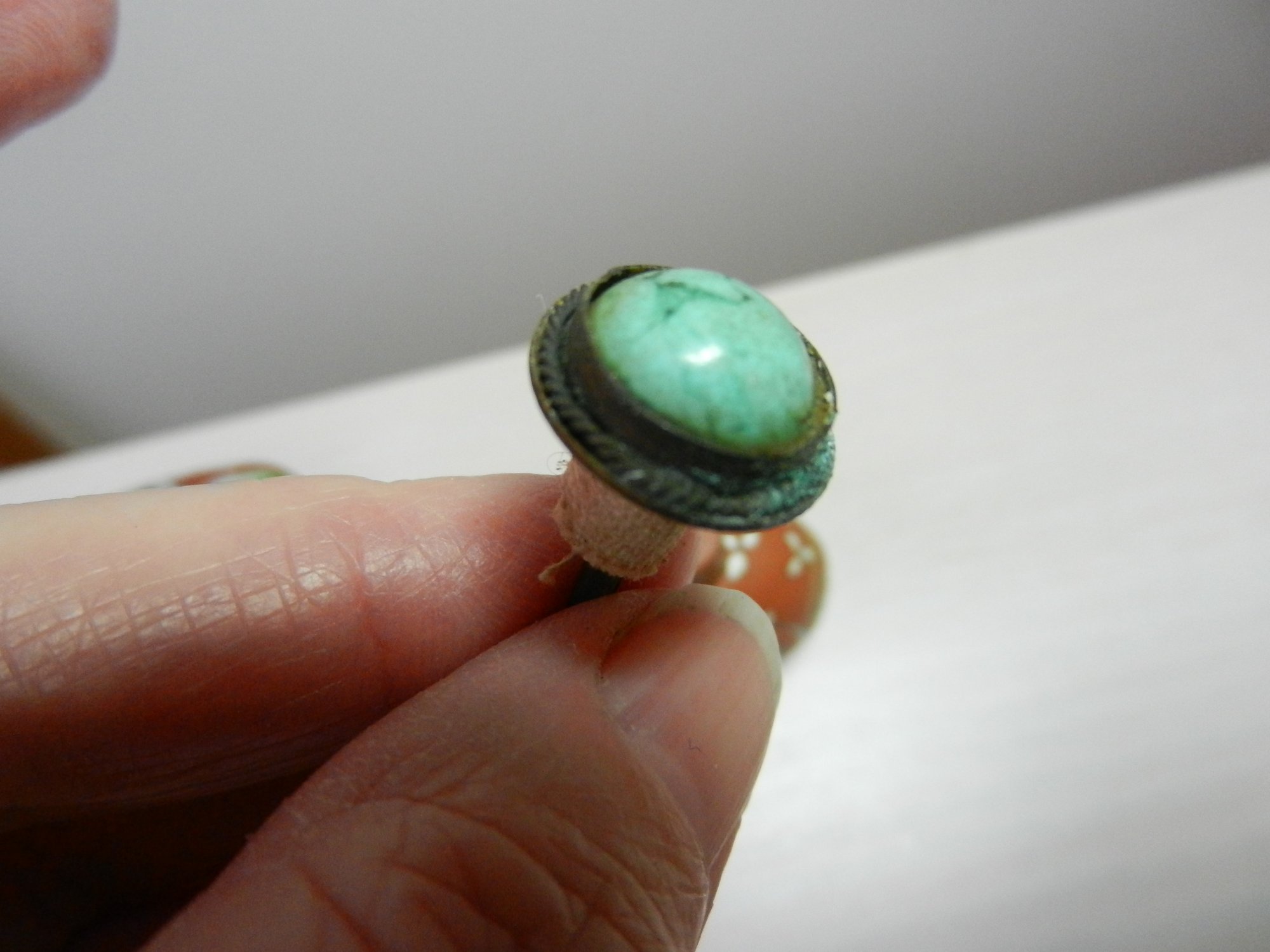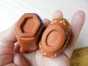 Approx. 2 1/8” high. The design is in a shiny glaze which looks great against the matt terracotta. The taller one does not have a lid and the remnant of its stopper is still stuck in its neck.