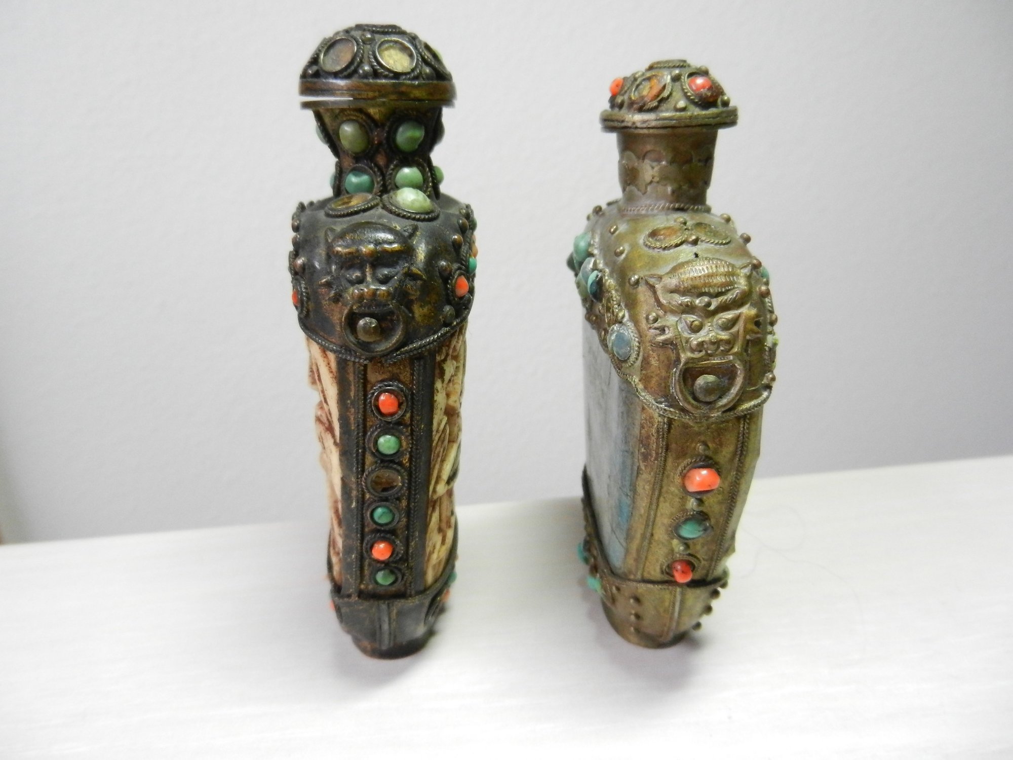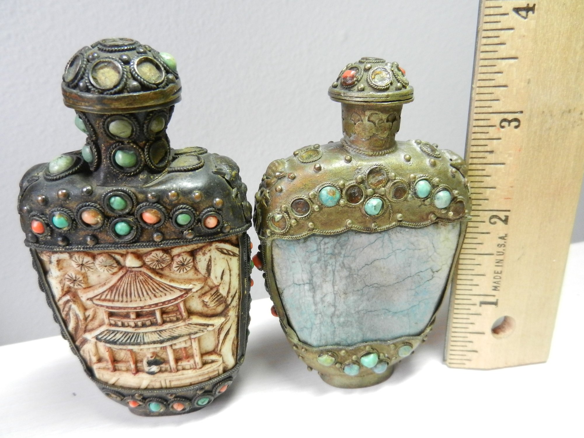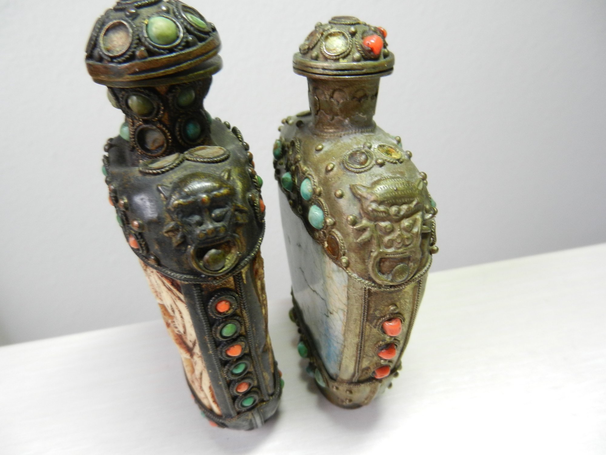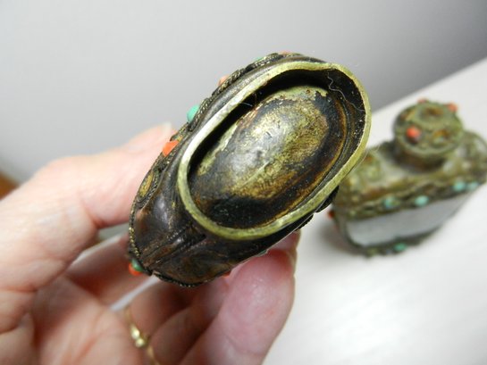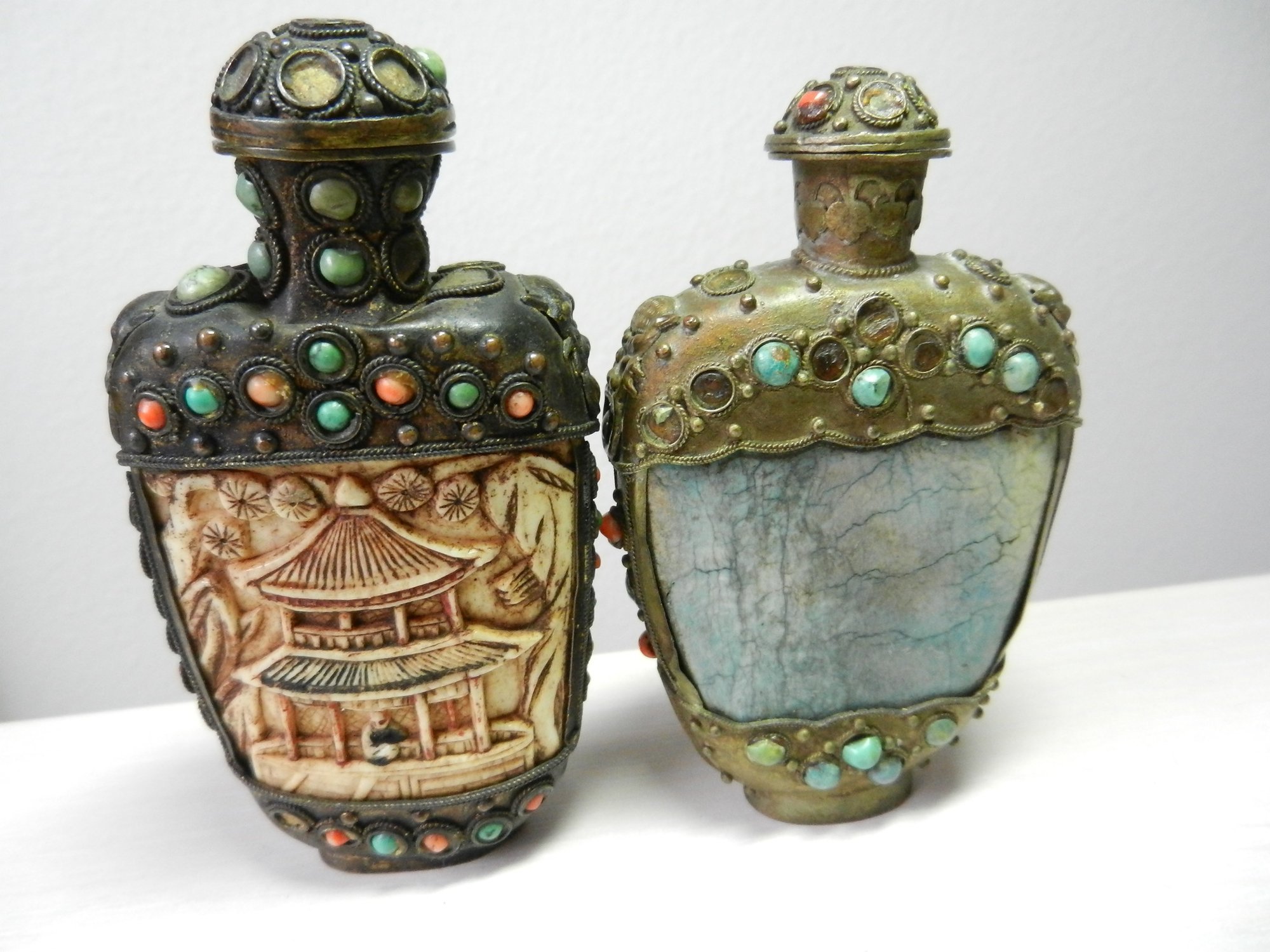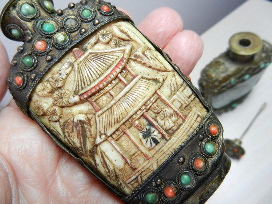 Vintage 2 metal and stone and carved resin snuff bottles (DP53)