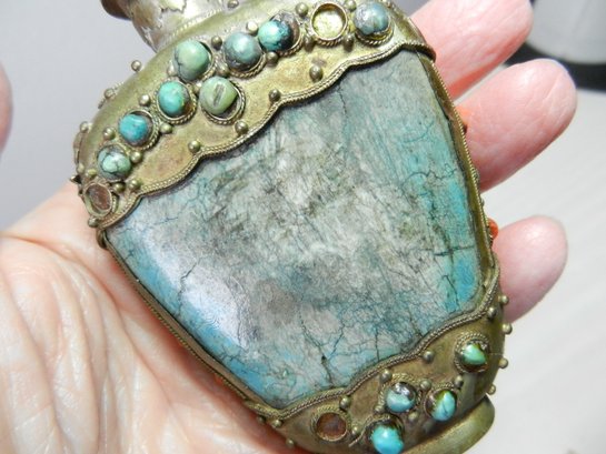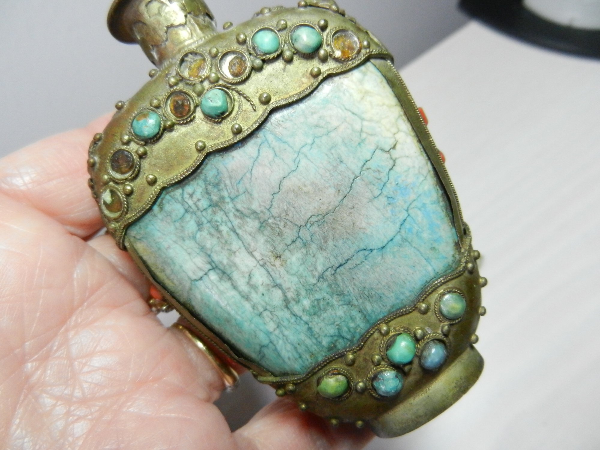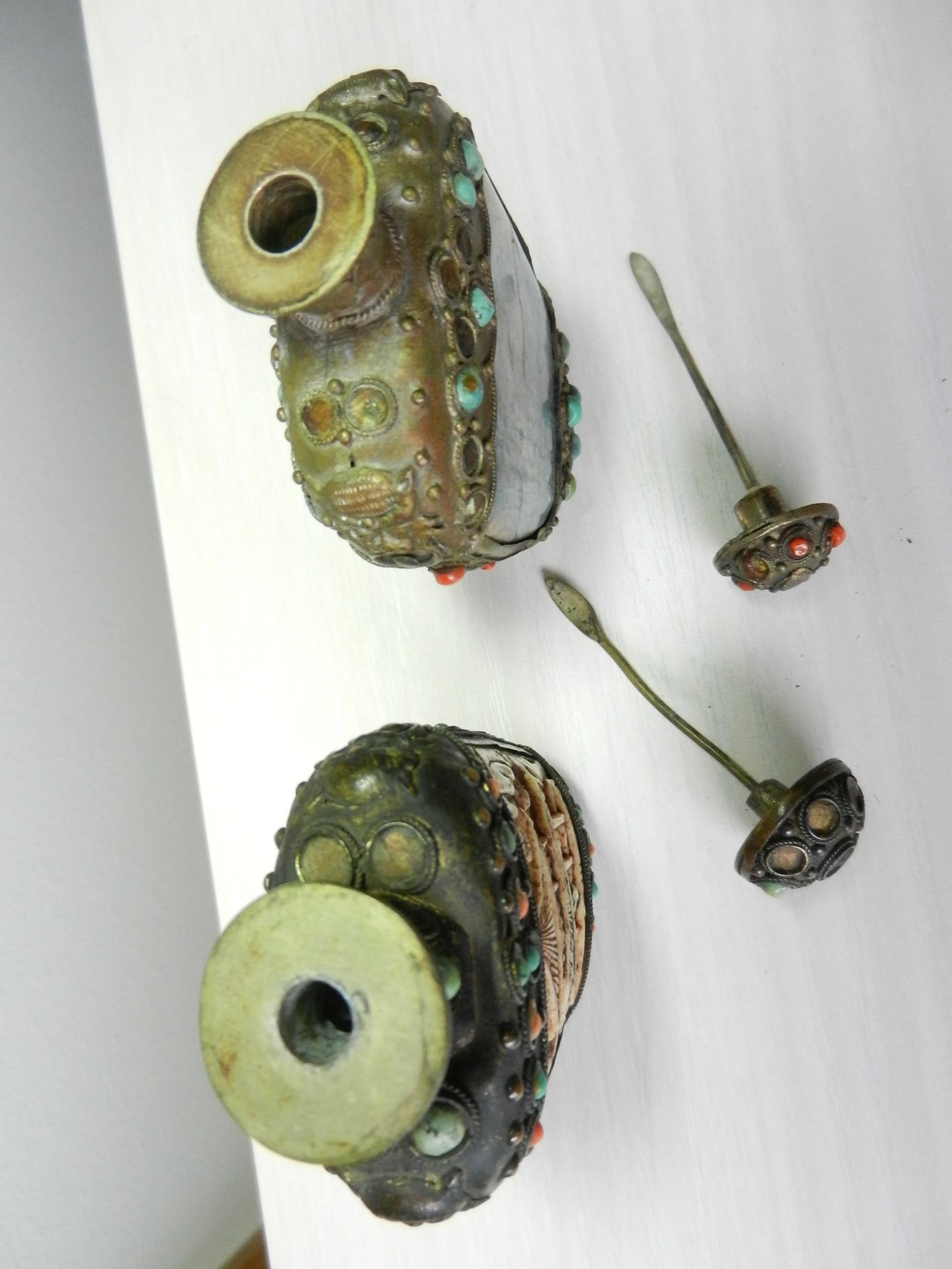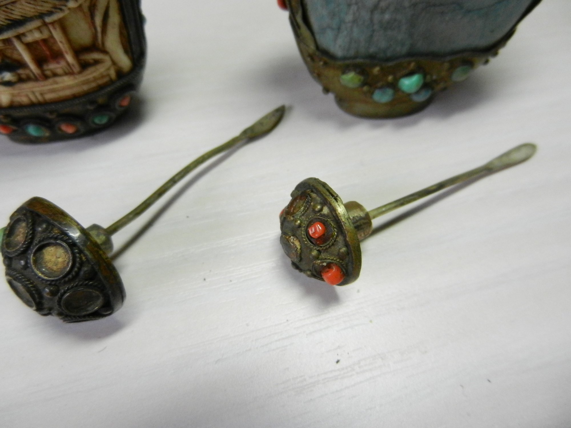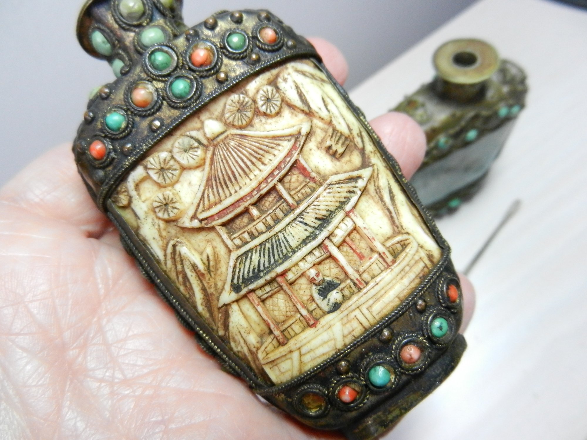 Vintage 2 metal and stone and carved resin snuff bottles (DP53)