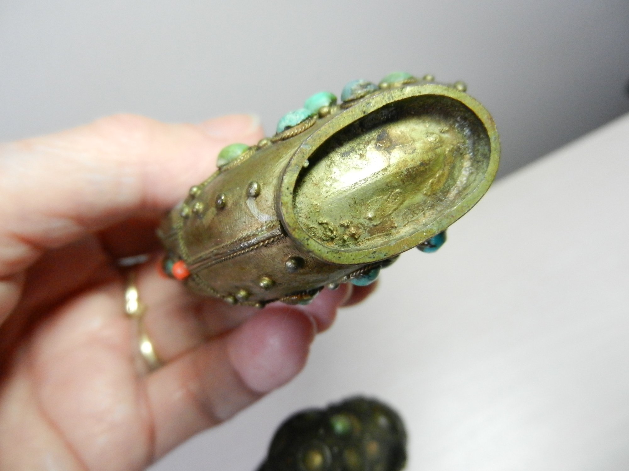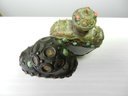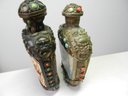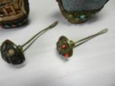 Approx 3 ¾” high. Both of these have some colored stones missing, One has a carved design of what looks like a temple. I believe it might be some form of resin. The other one looks like it is a blue type of stone as it is cold to the touch.