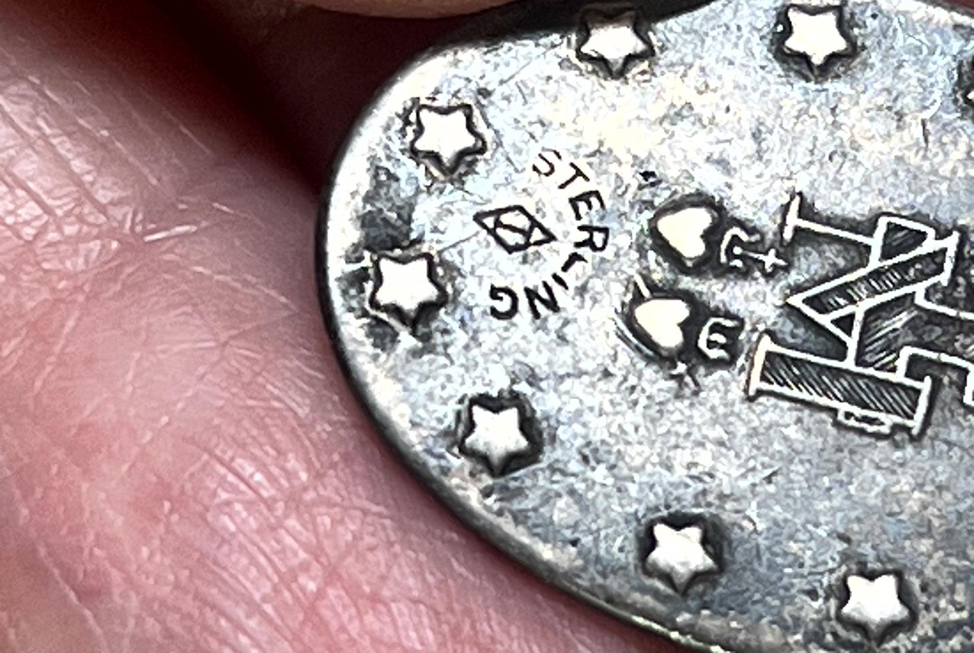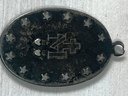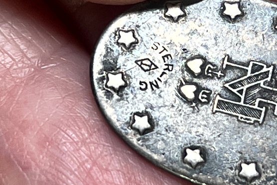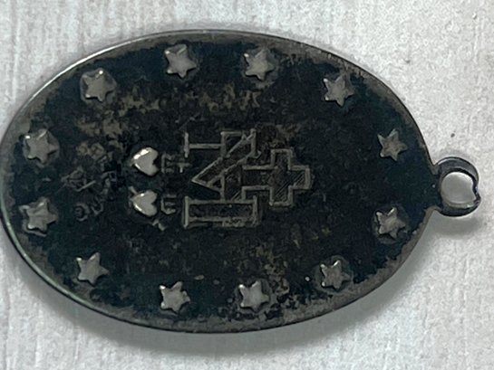 Oval medallion has 1830 on the front and Sterling on the back. Approx 1” high. The hanging loop is worn.