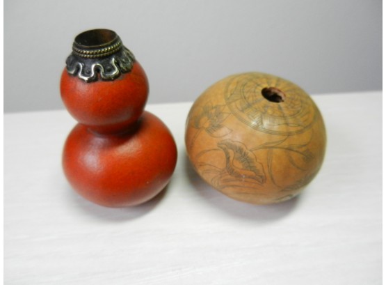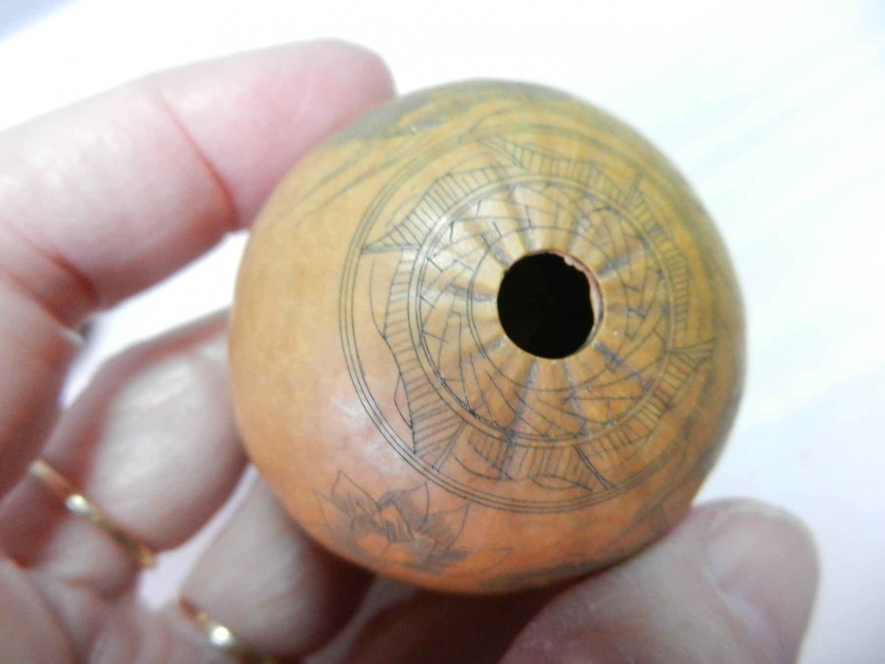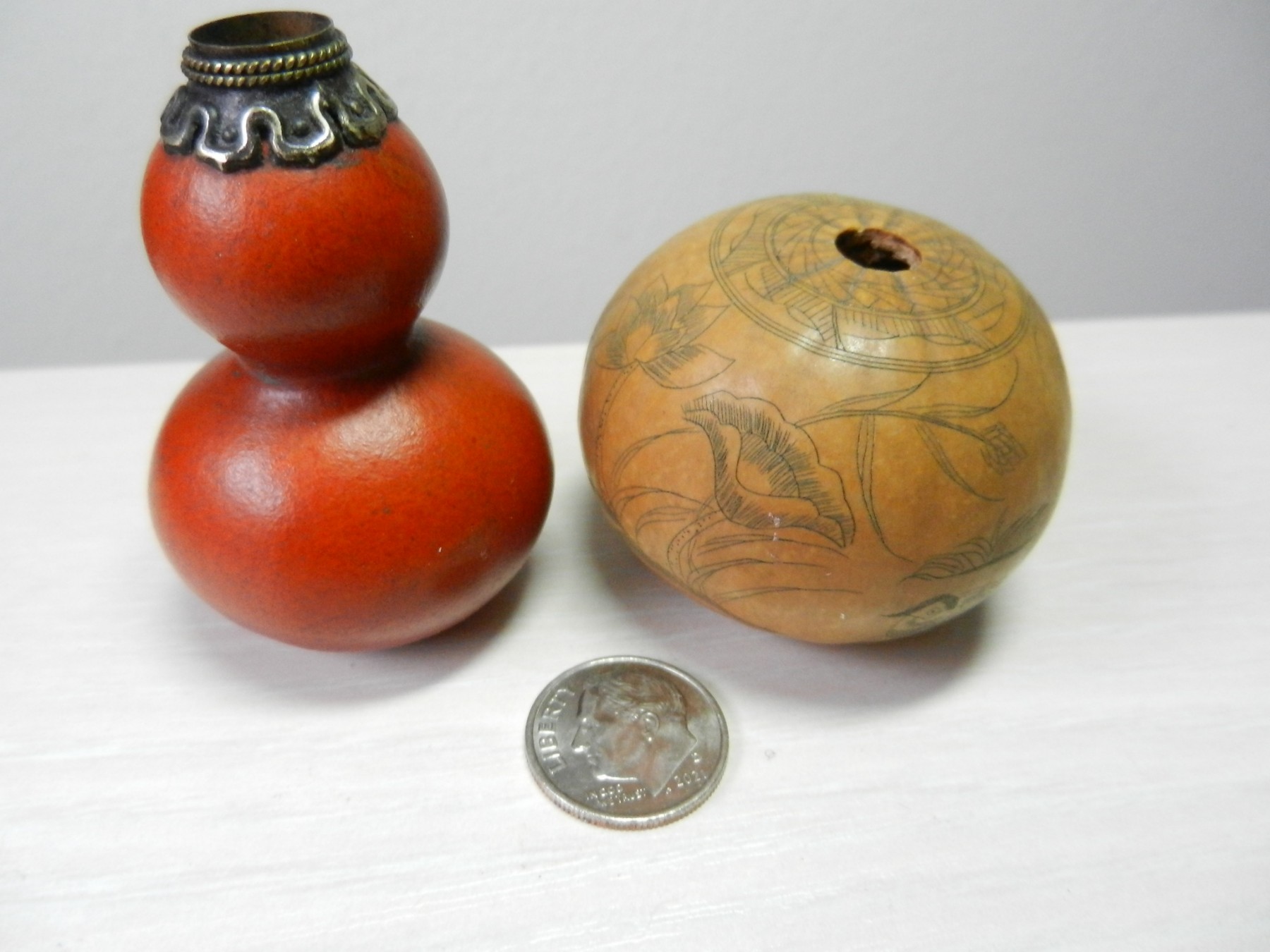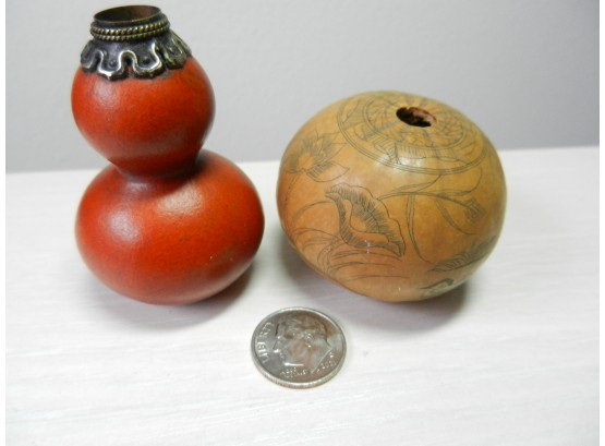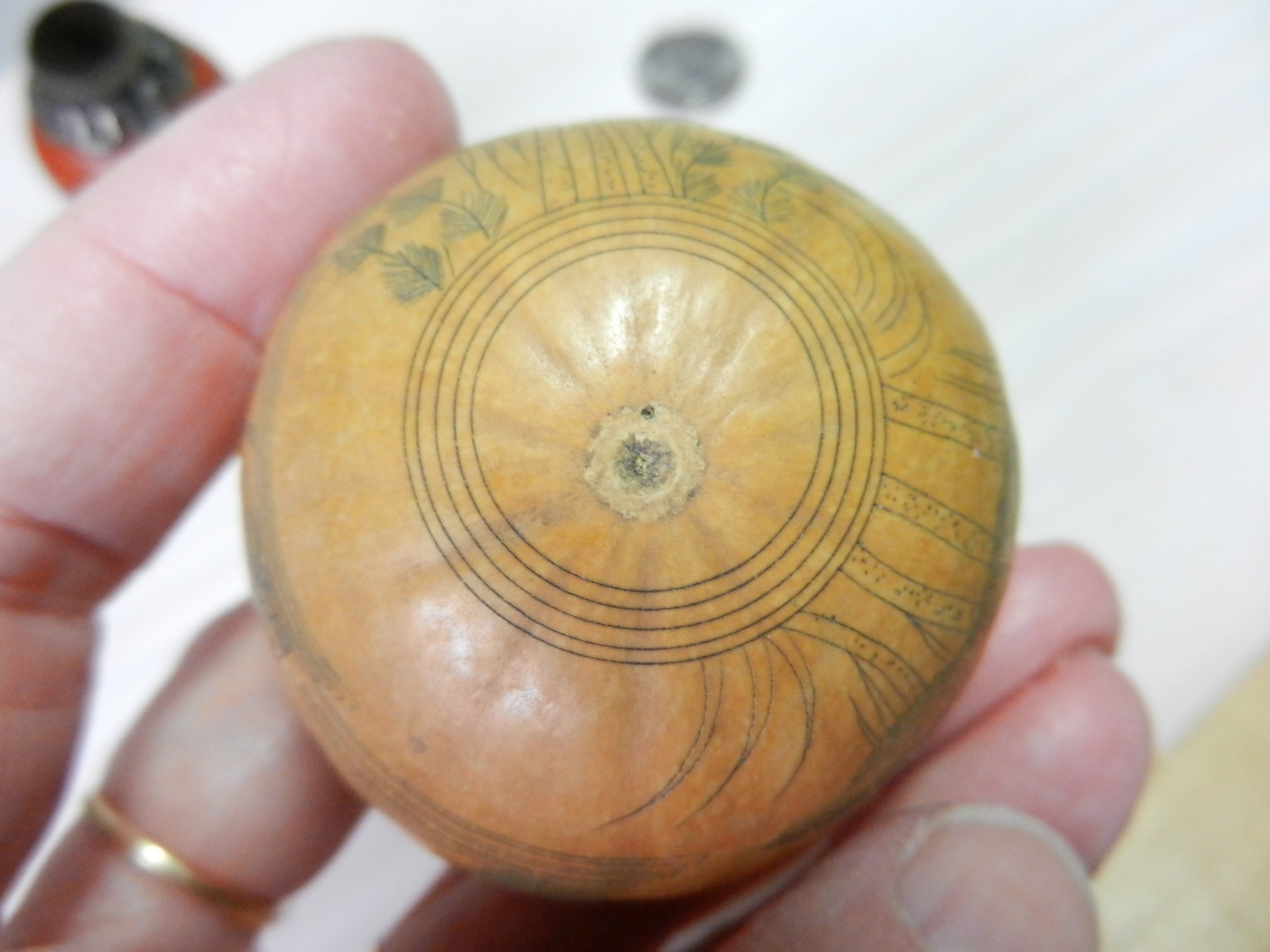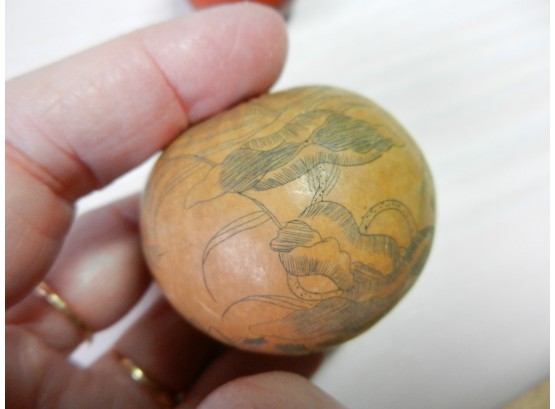 Vintage 2 tiny seed pod? calabash/gourds? one with engraved design (DP60)