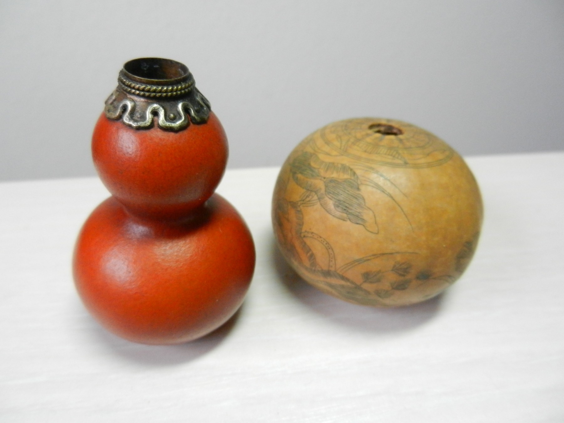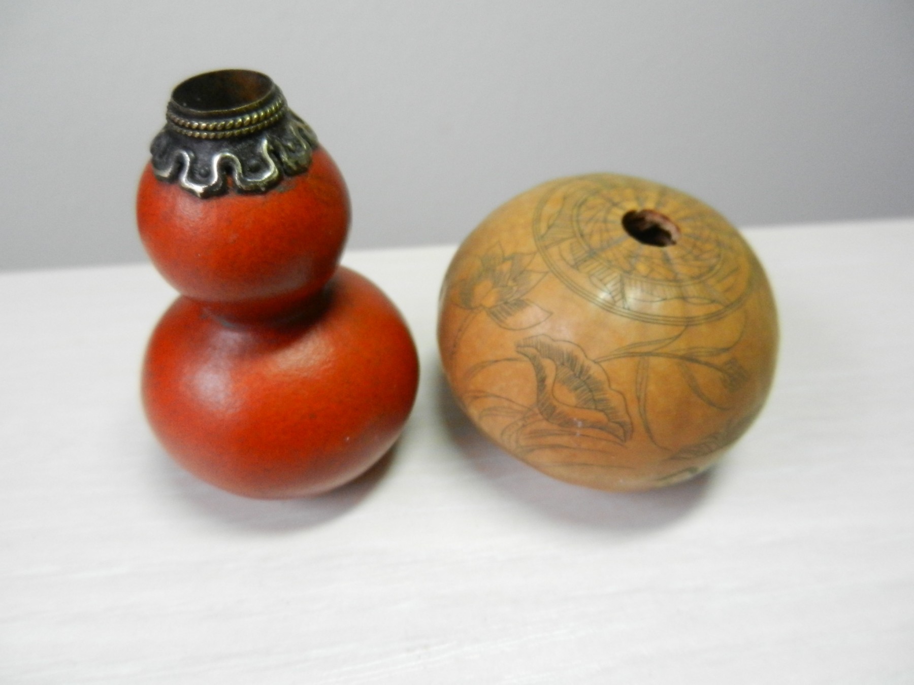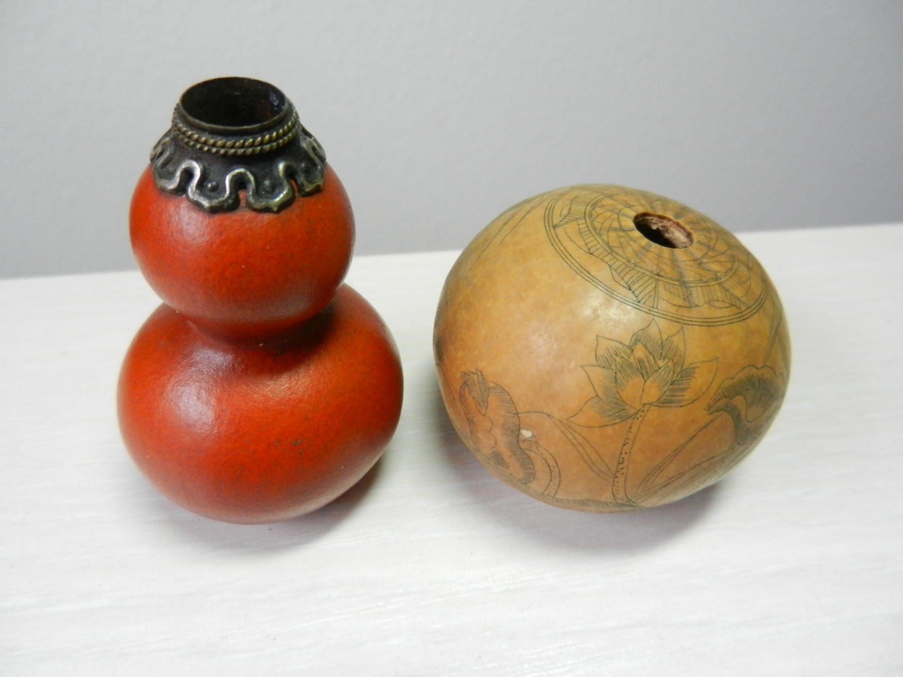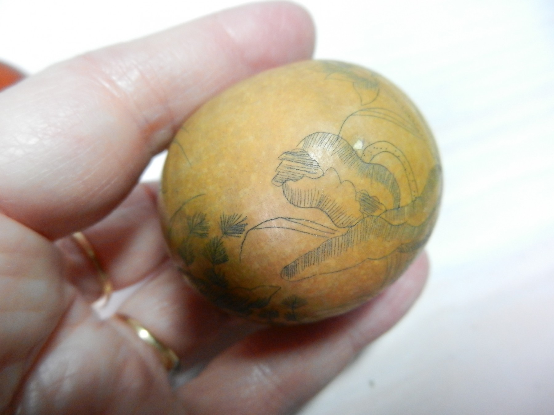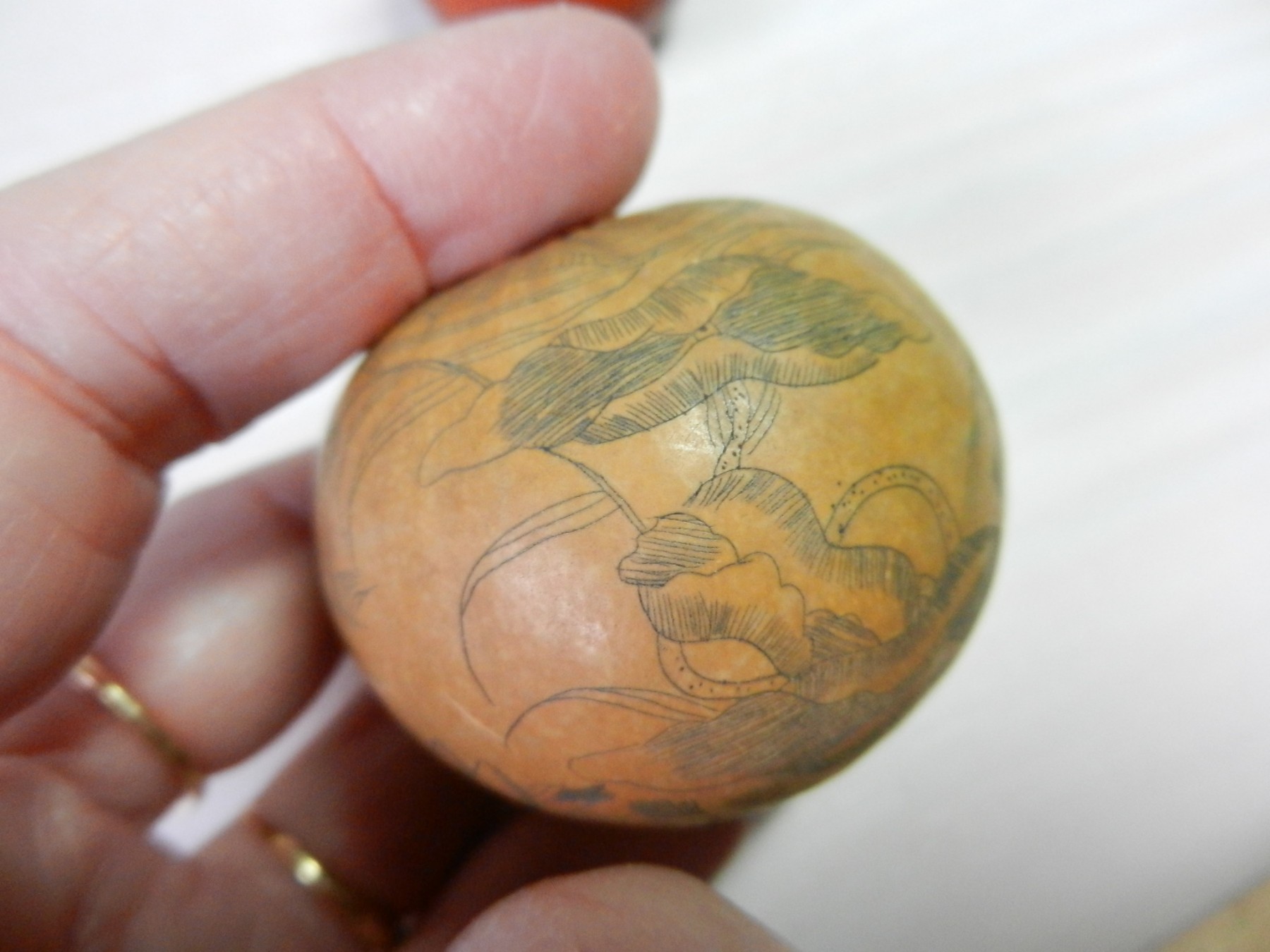 The rounder one has a very delicate picture of waterfowl, trees and foliage incised into it. It is executed very well. It rattles so there is obviously something inside it. Approx 1 ½” high.
