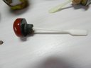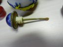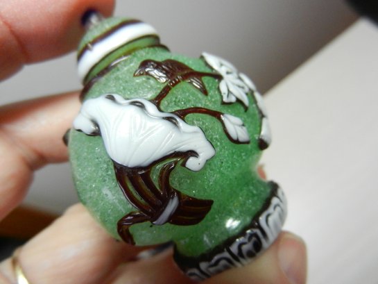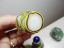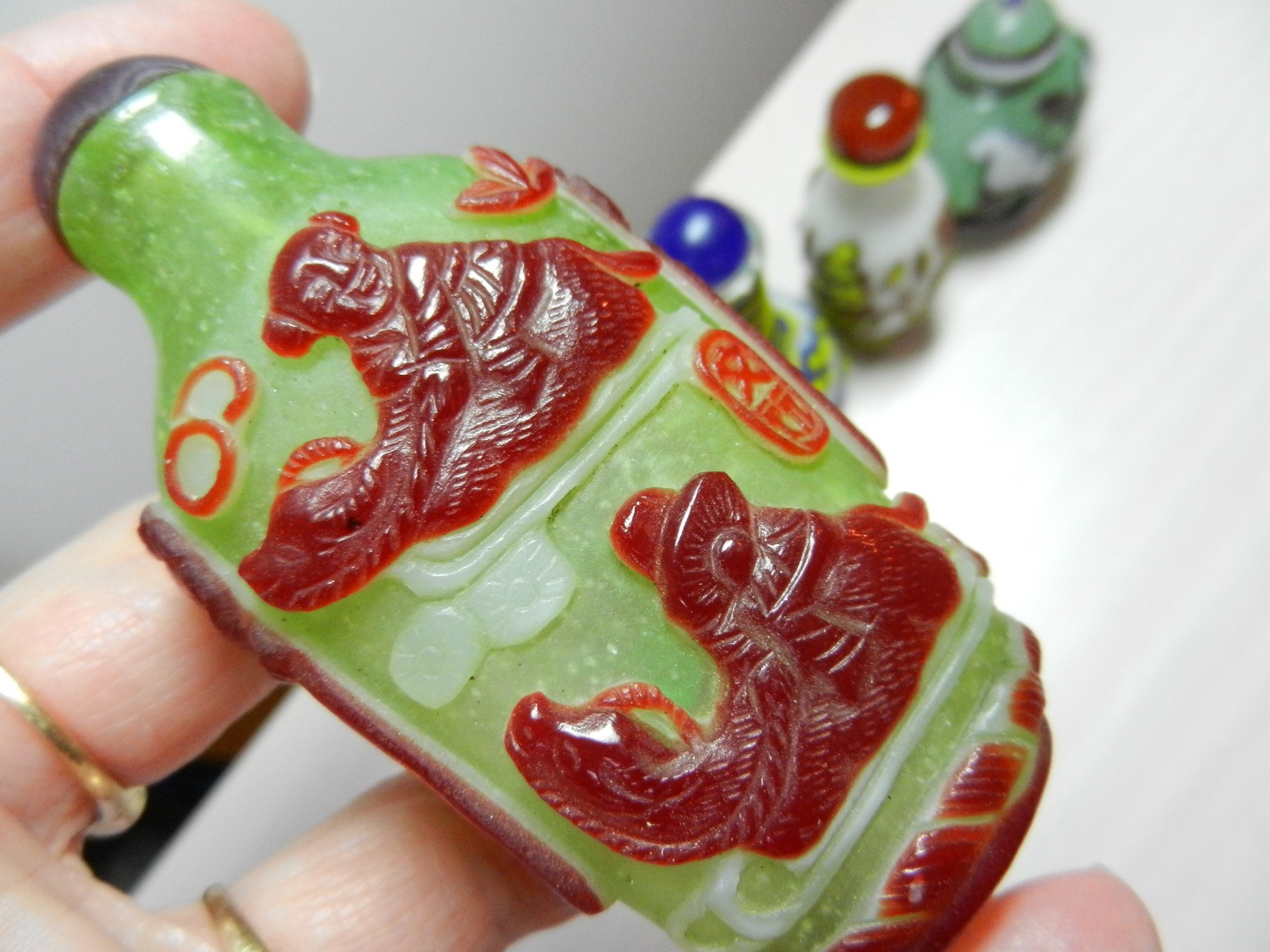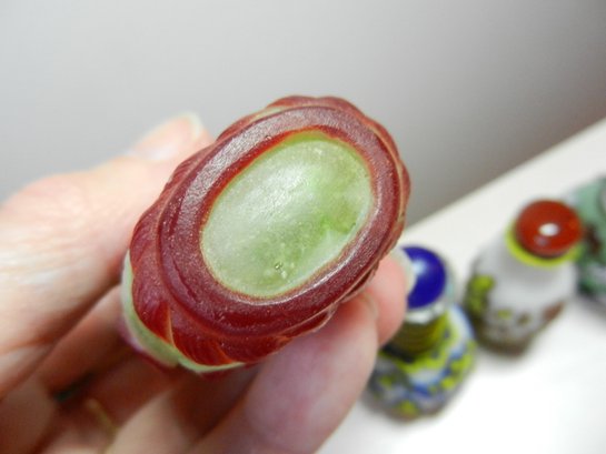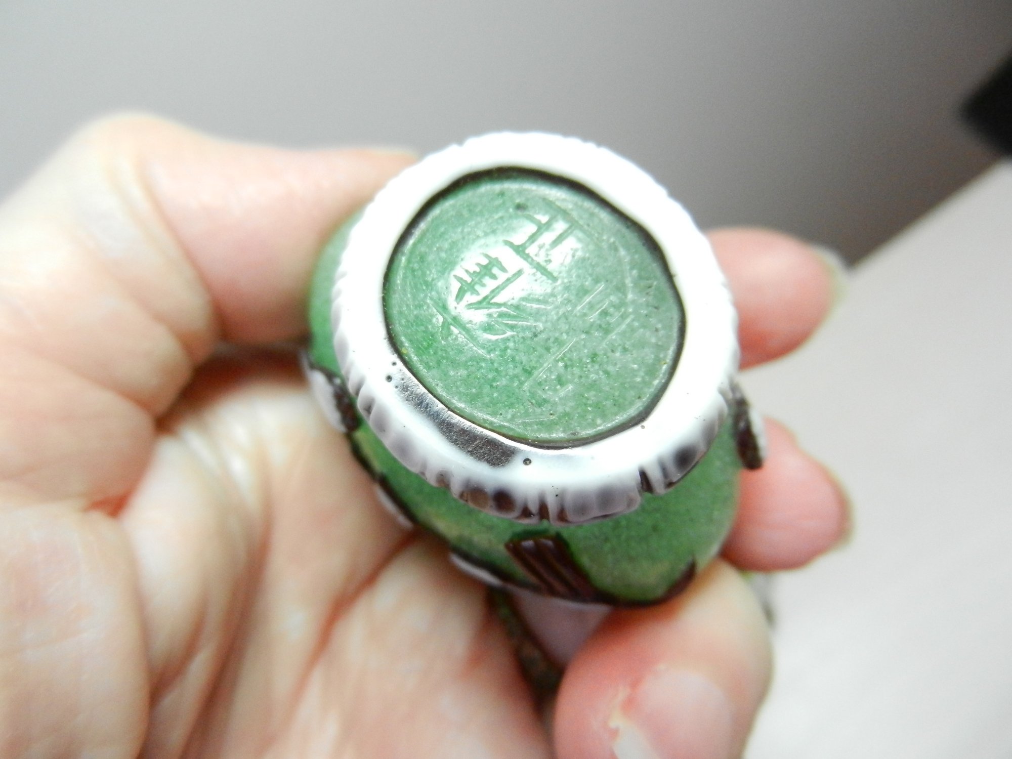 The blue and white one has a stopper that doesn’t really fit it but it looks good. The stopper on the yellow and brown one is cold to the touch, so probably stone. The green and red one has a lid that is probably a resin of some kind. Two have some maker’s info or something on their sides. The smaller green one has a very faint incised mark on its base but it’s impossible to make out