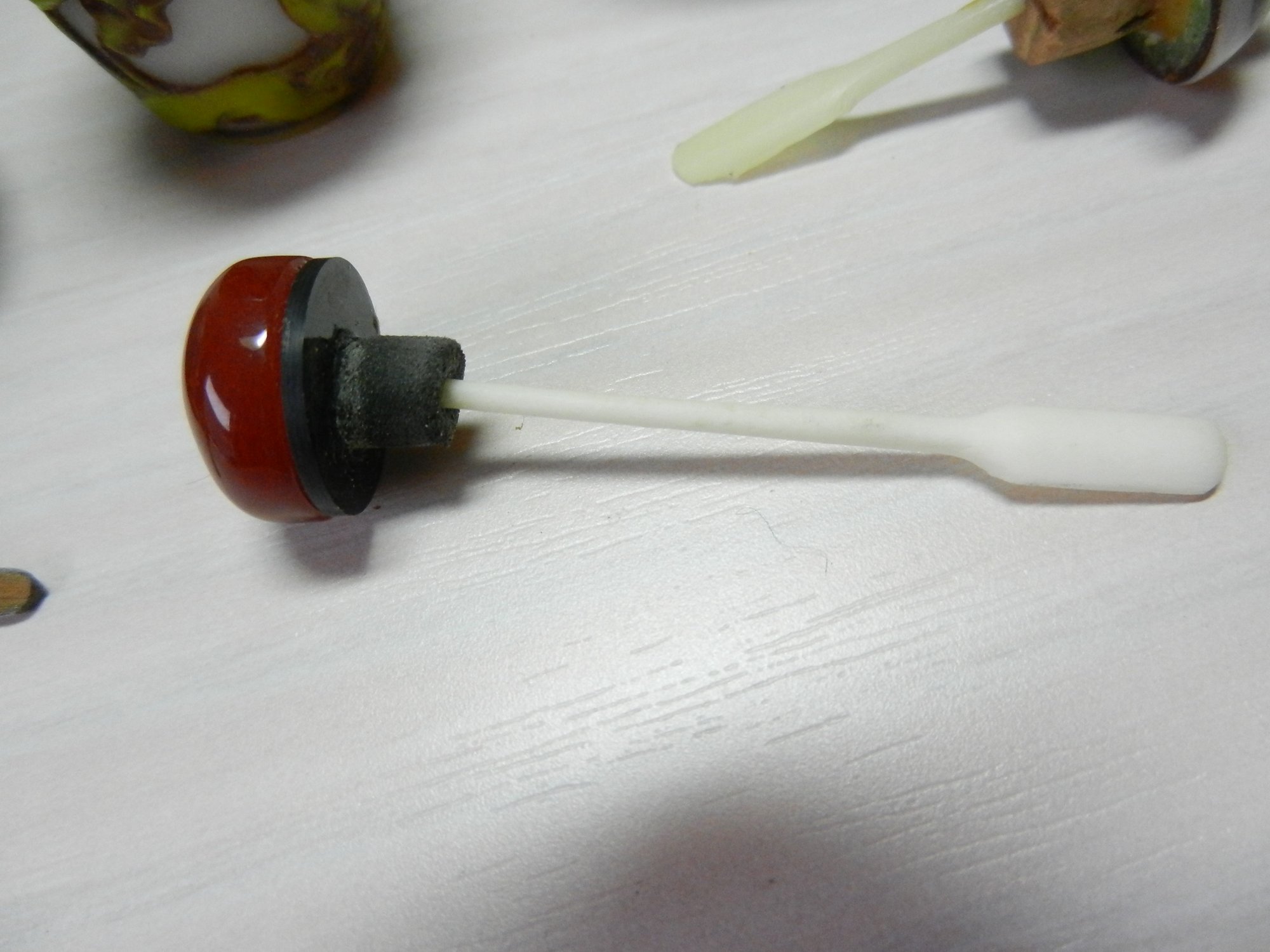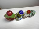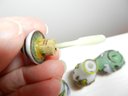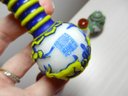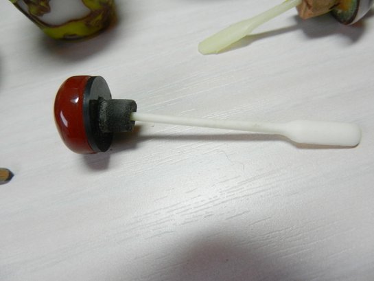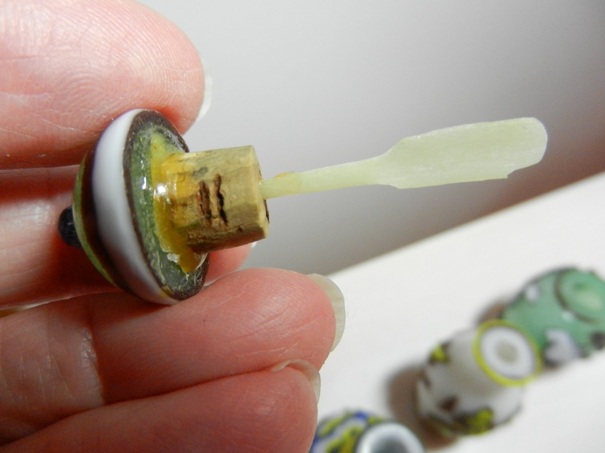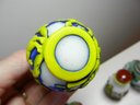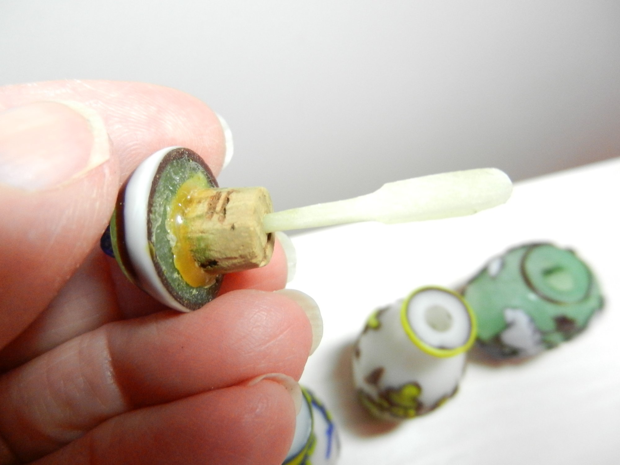 The blue and white one has a stopper that doesn’t really fit it but it looks good. The stopper on the yellow and brown one is cold to the touch, so probably stone. The green and red one has a lid that is probably a resin of some kind. Two have some maker’s info or something on their sides. The smaller green one has a very faint incised mark on its base but it’s impossible to make out