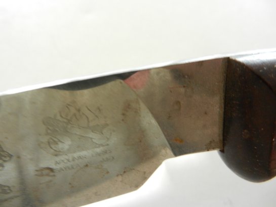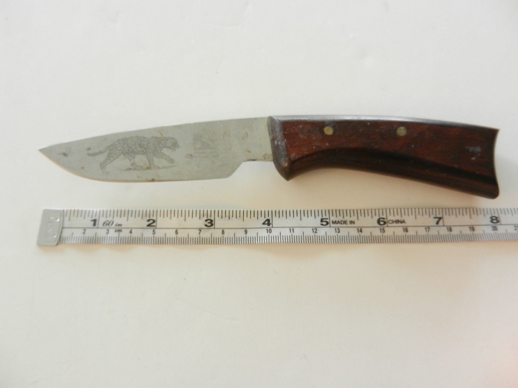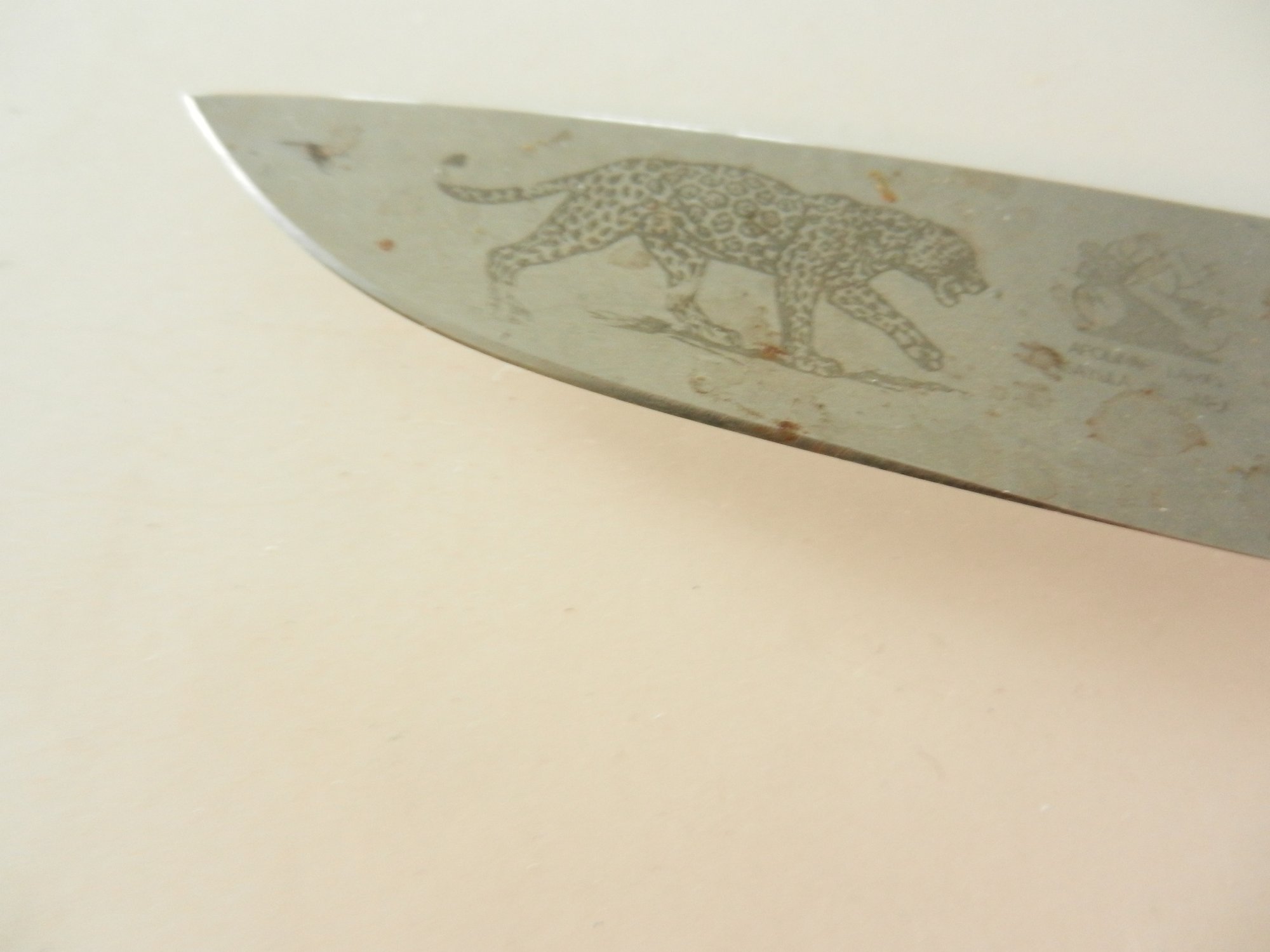 Approx 8” long. A cheetah is etched on the blade with the words ‘APOLINAR LARISSAYULA JAL MEX’.