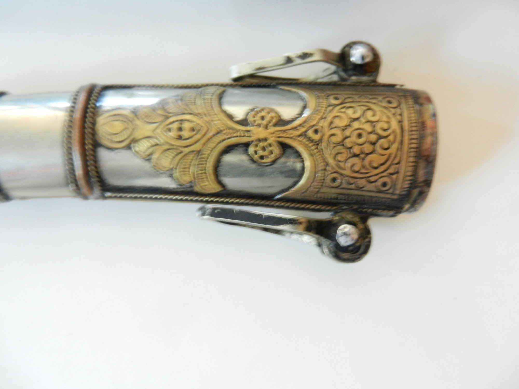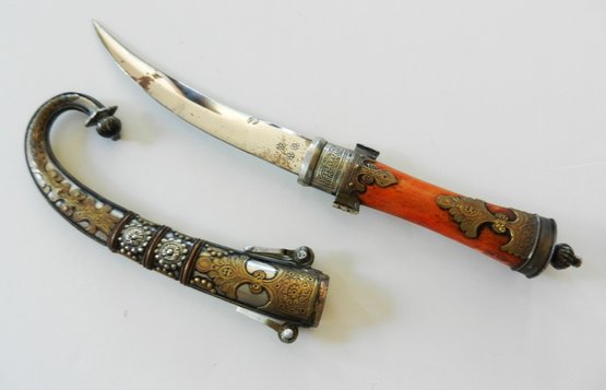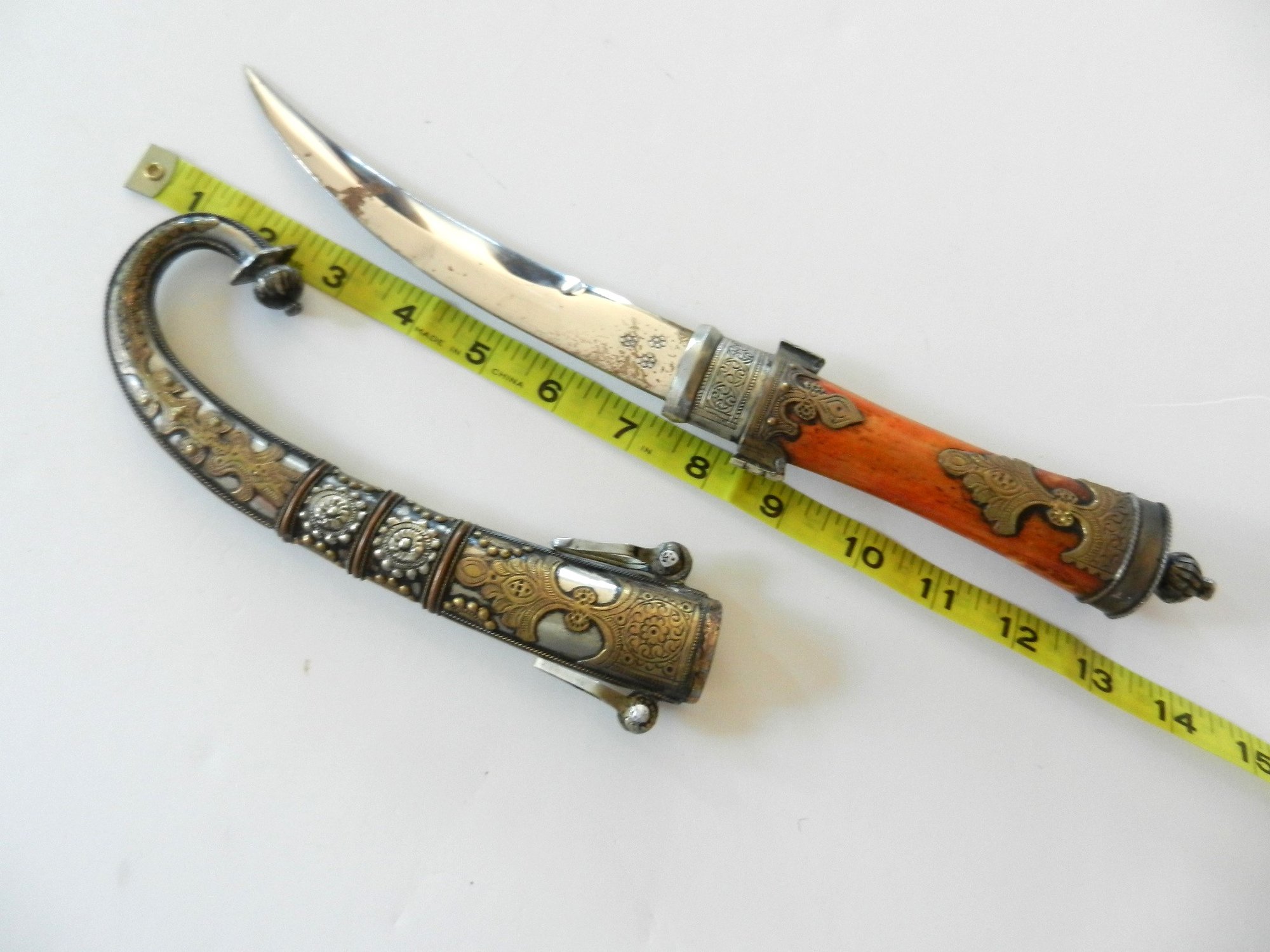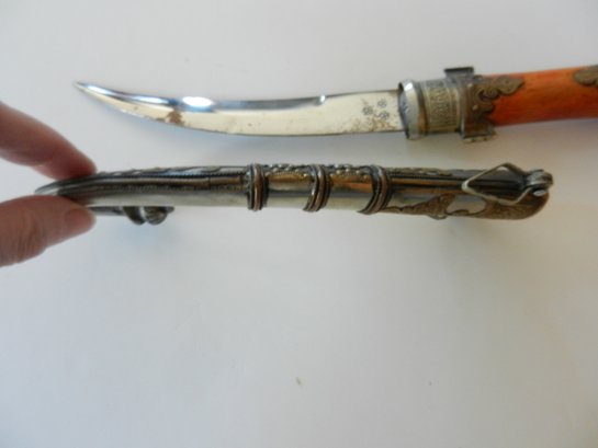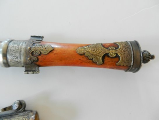 The handle may be stained bone. The sheath is silver toned metal with brass decorative overlay.