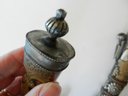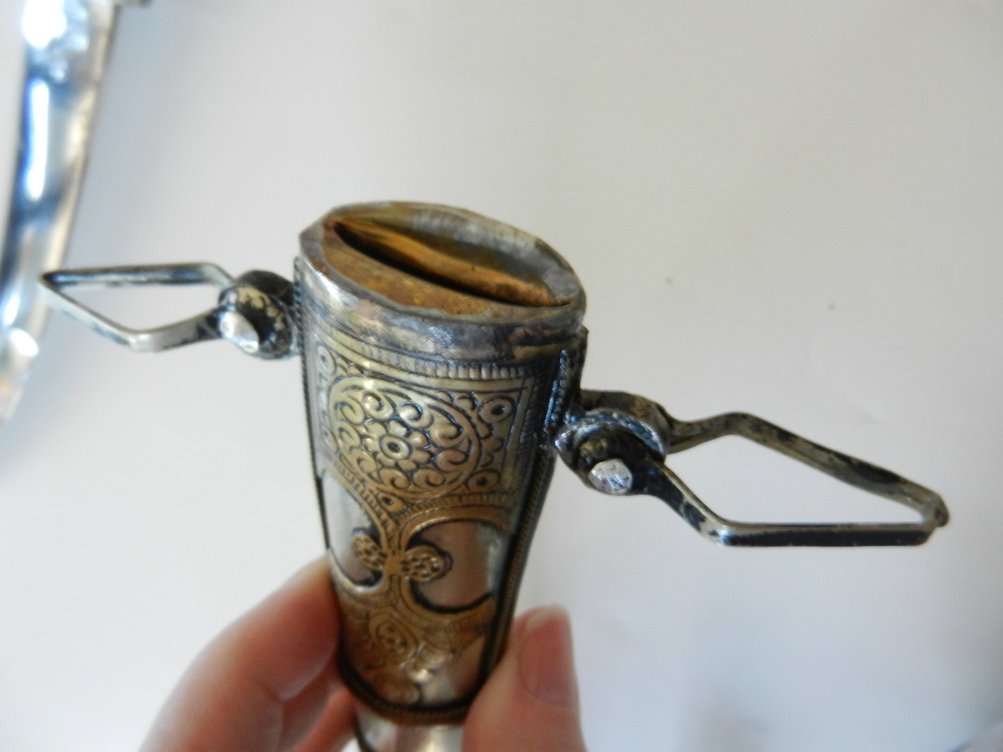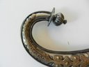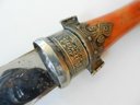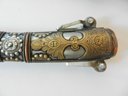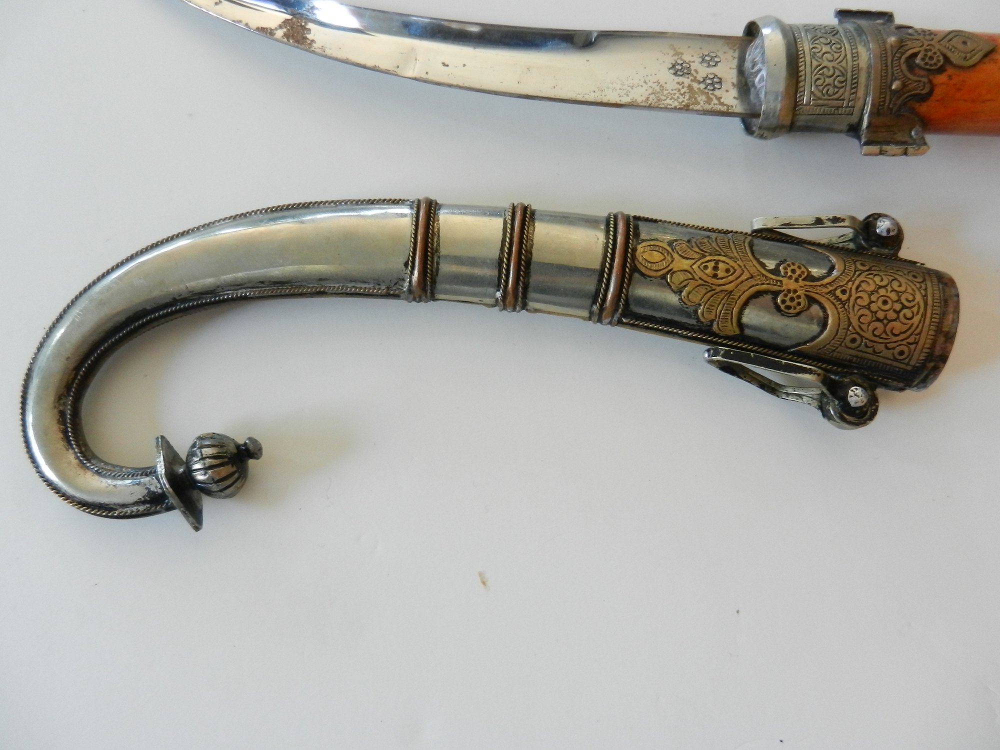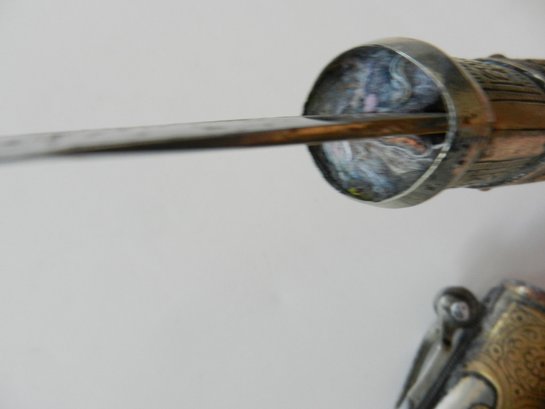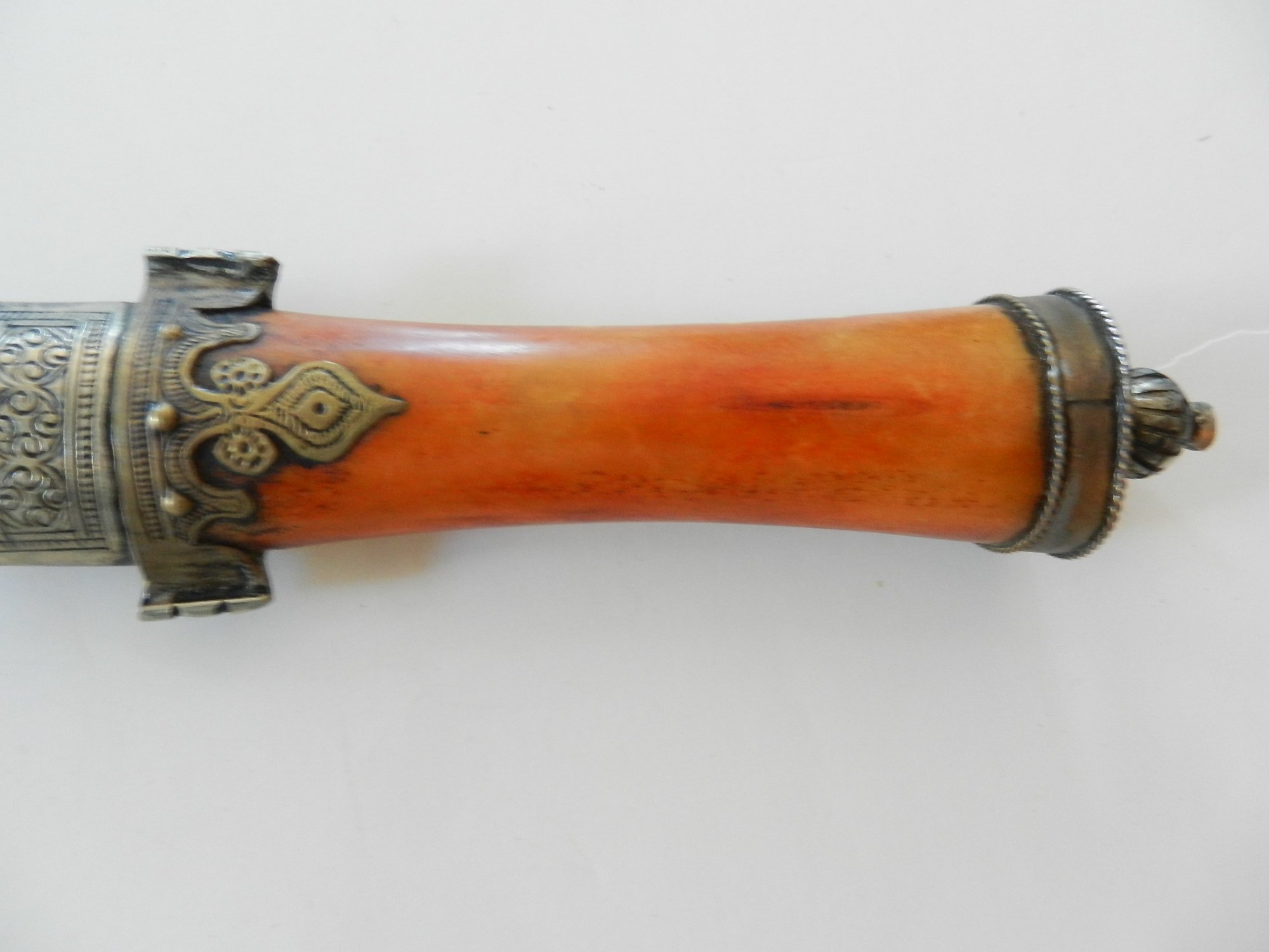The handle may be stained bone. The sheath is silver toned metal with brass decorative overlay.