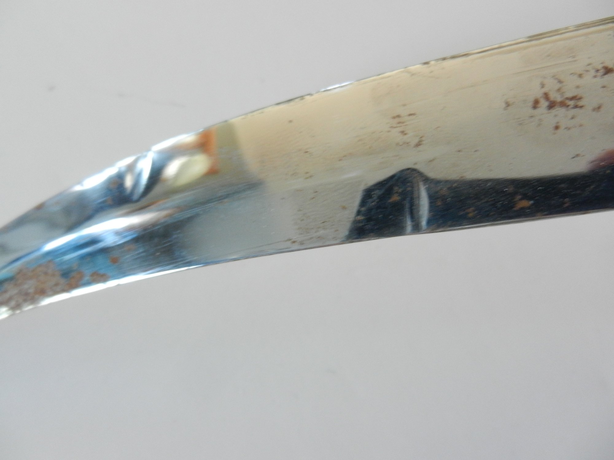 The blade fits very snuggly in the sheath. The blade has some little patches of rust. 3 symbols stamped into the top of the blade – they almost look like flowers but they aren’t. There are 2 dimples in the metal of the blade.