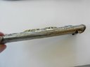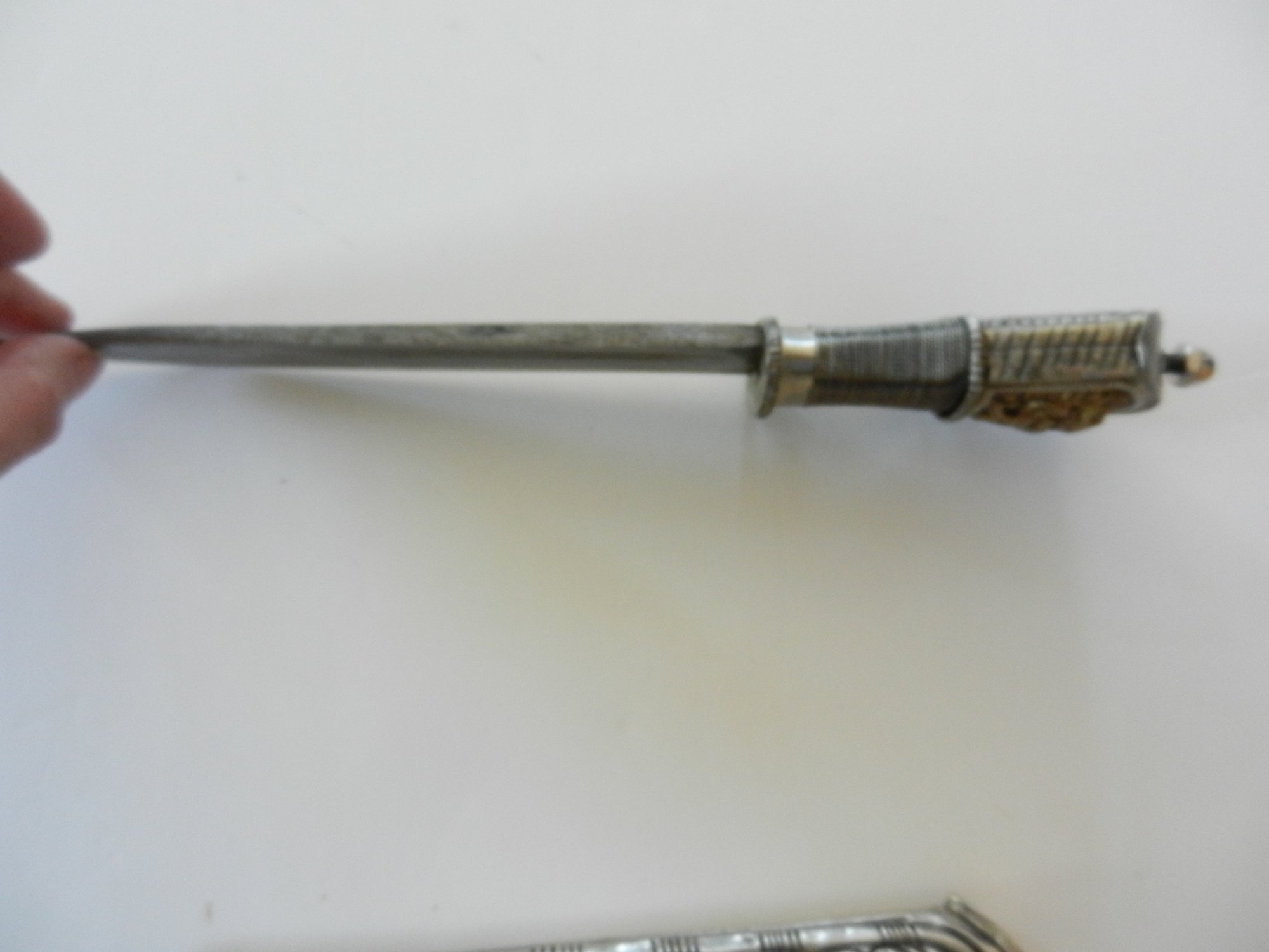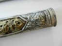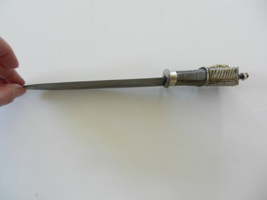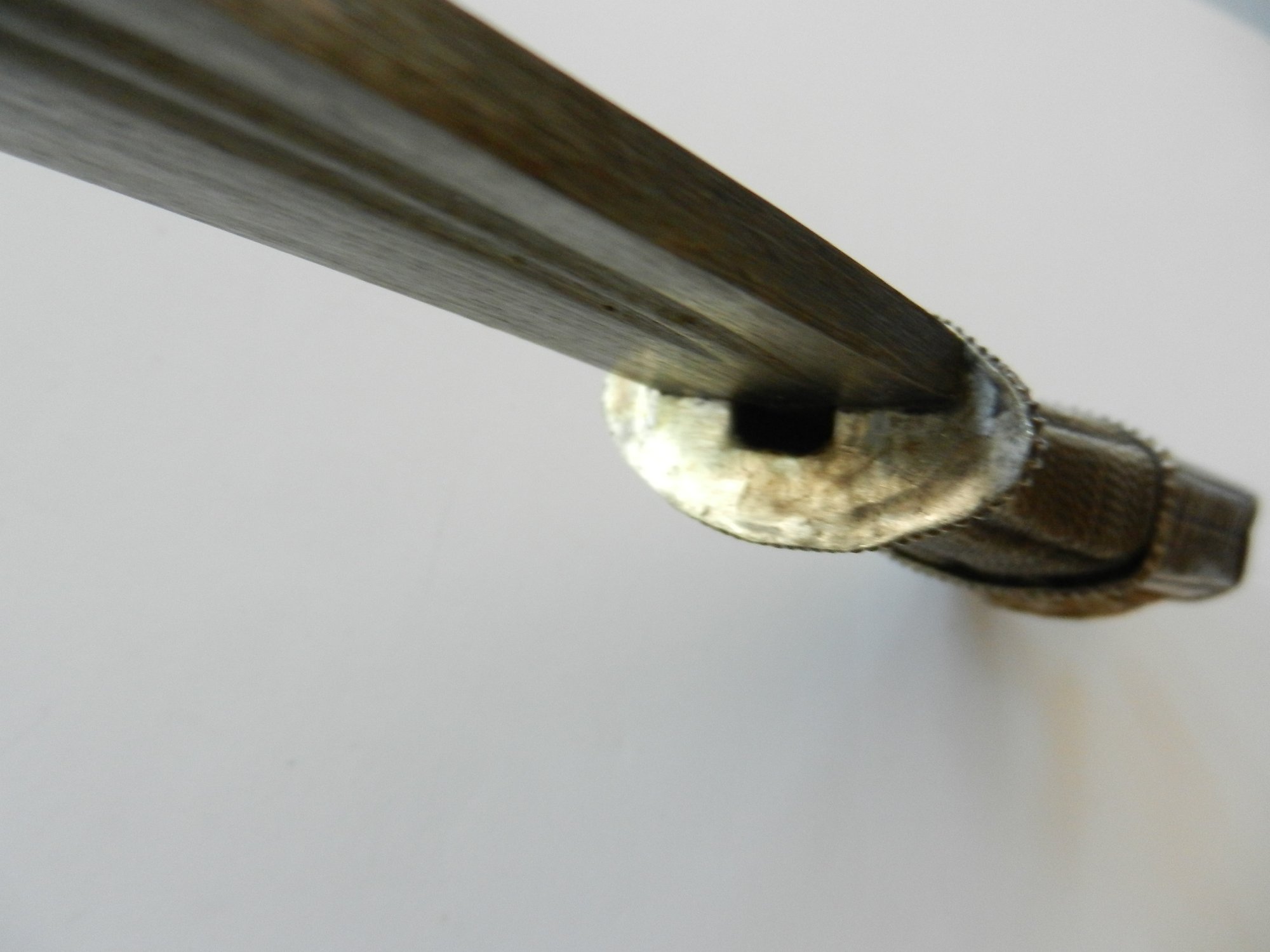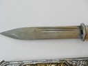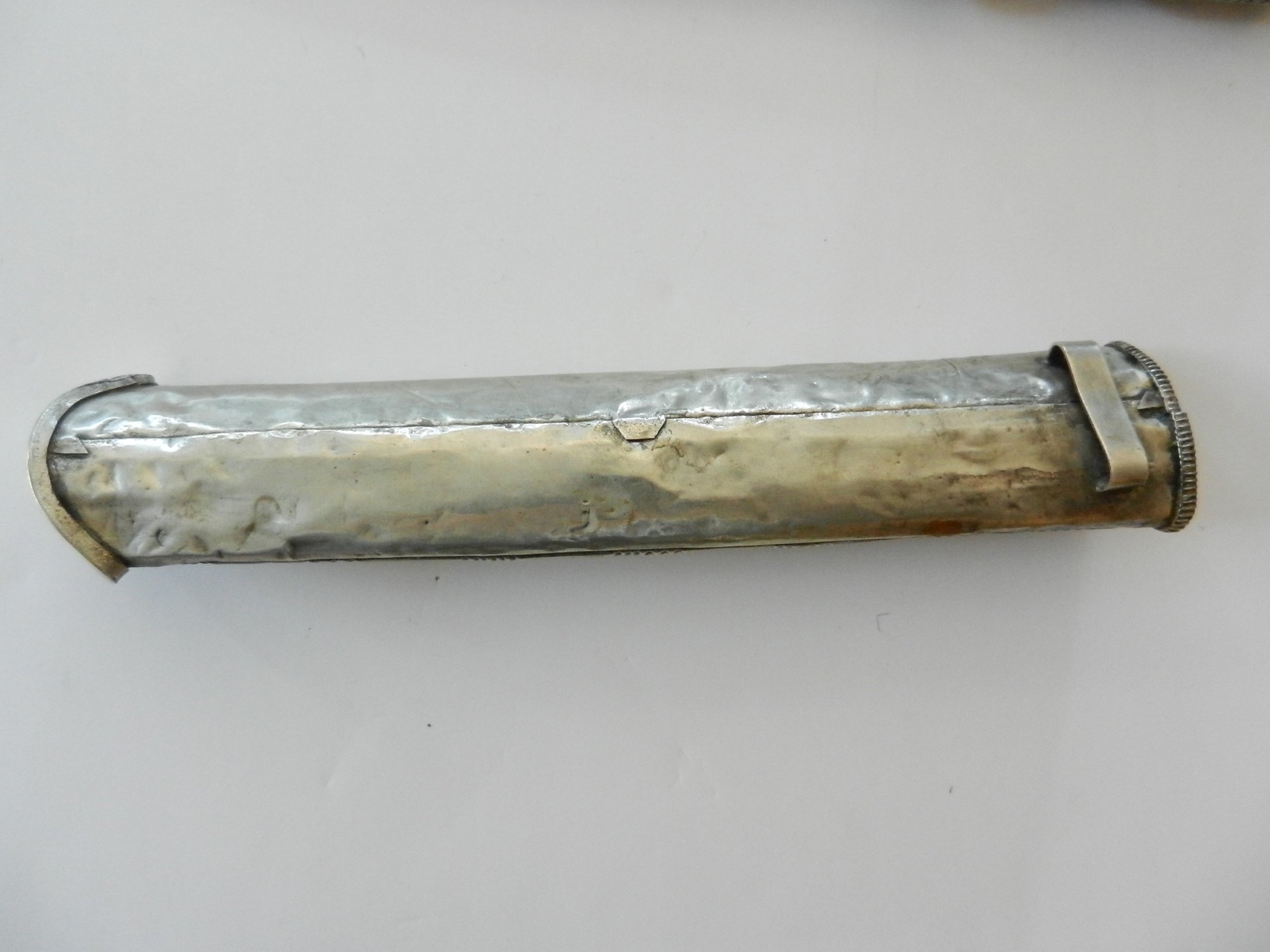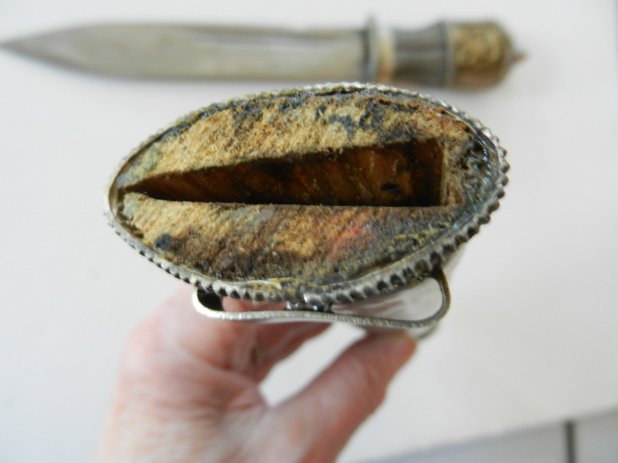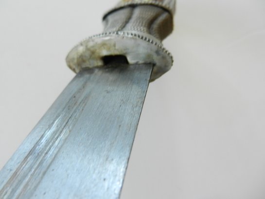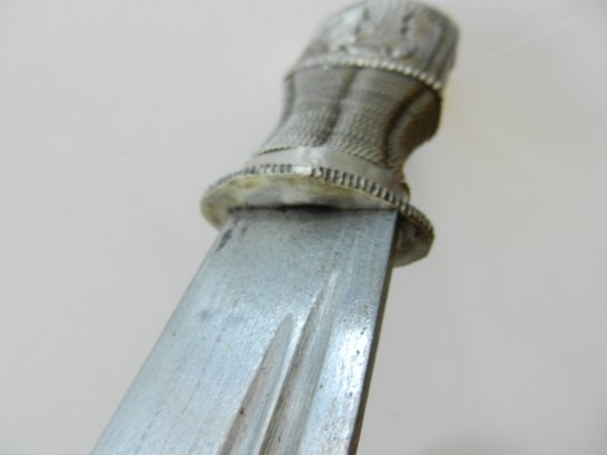 The blade fits very snuggly in the sheath. The silver tone metal – no idea ether it is a low grade silver or just silver tone – has a lot of dents and dinks in it. It is very thin. It is non magnetic. The blade has two grooves in either side. The sheath is metal over wood.
