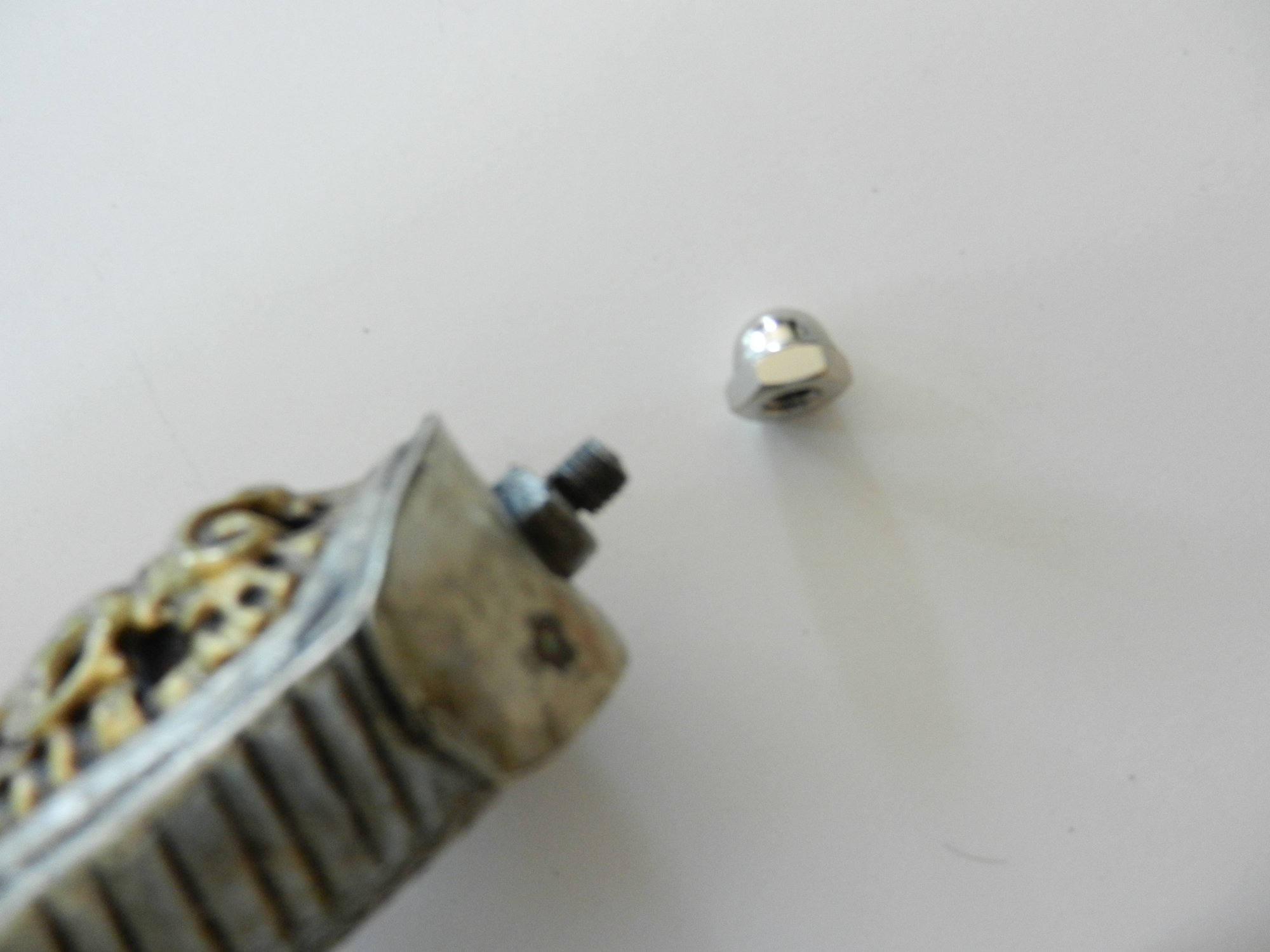 The top bobble is missing and the previous owner has put some odd metal cap on it which doesn’t fit very well. Tiny spot on the top of the handle where the metal has worn through.