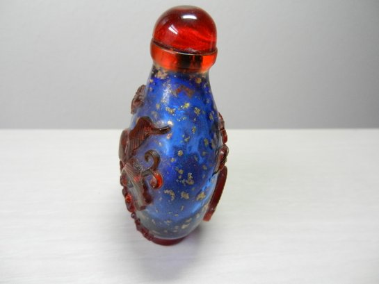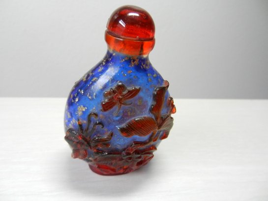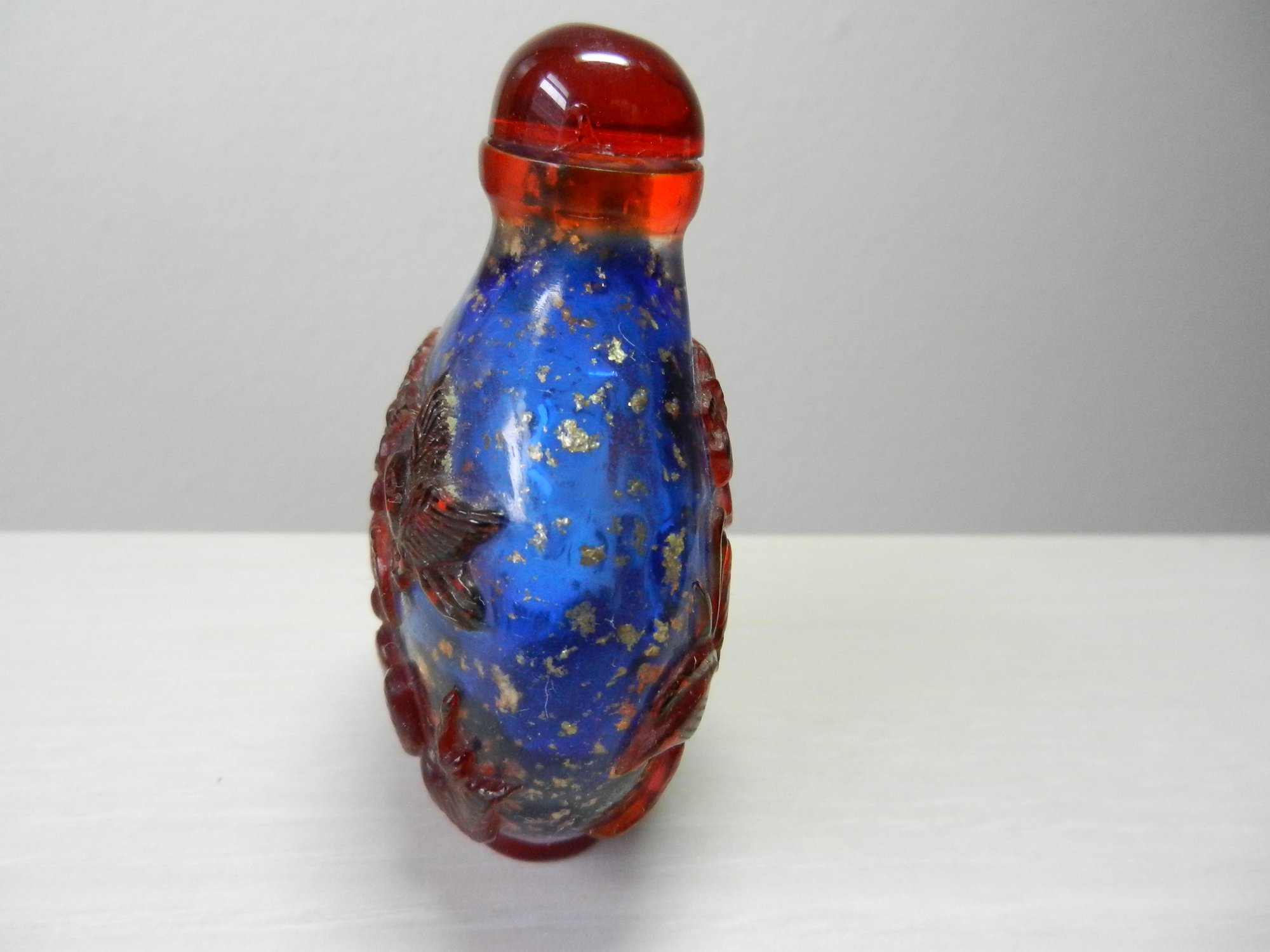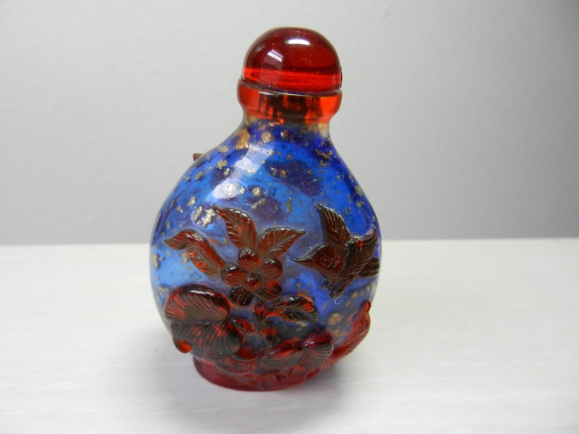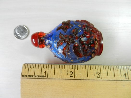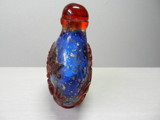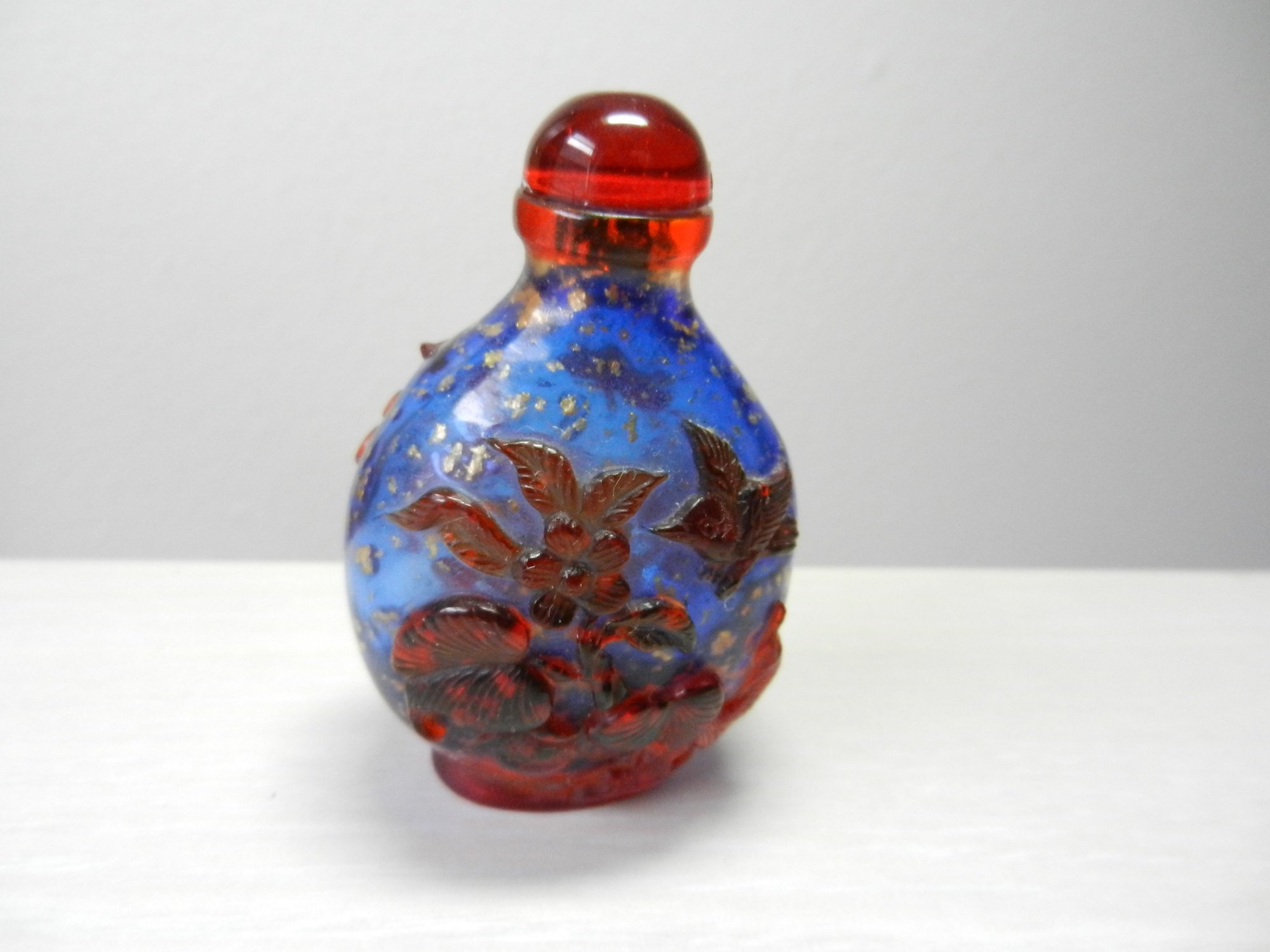 Vintage blue and red glass embossed snuff bottle – bird, butterfly, flowers (DP23)