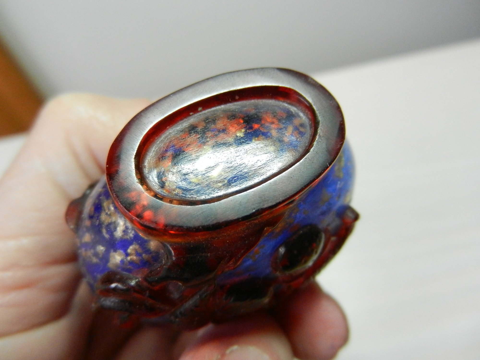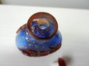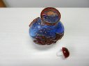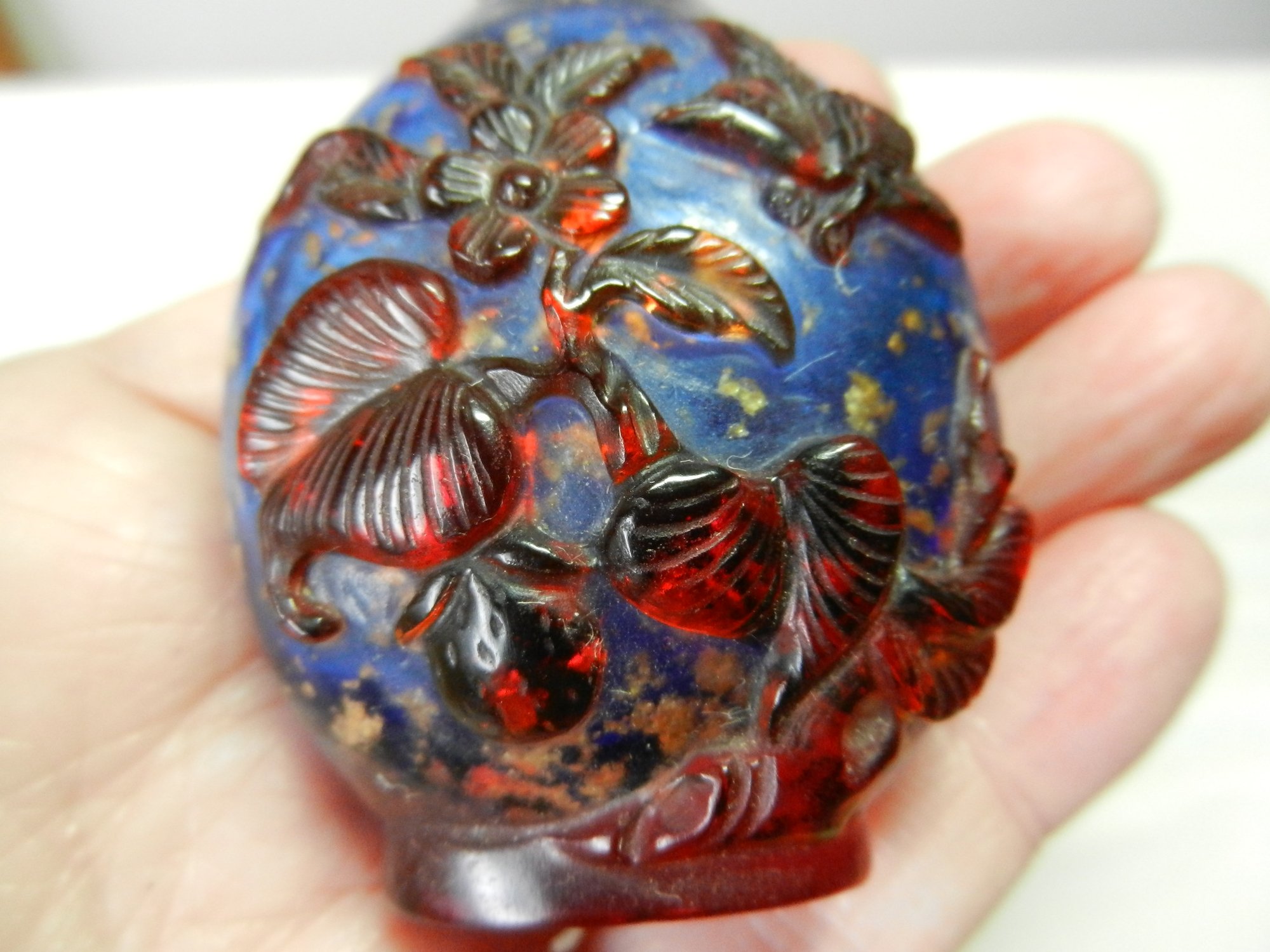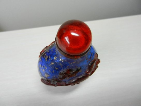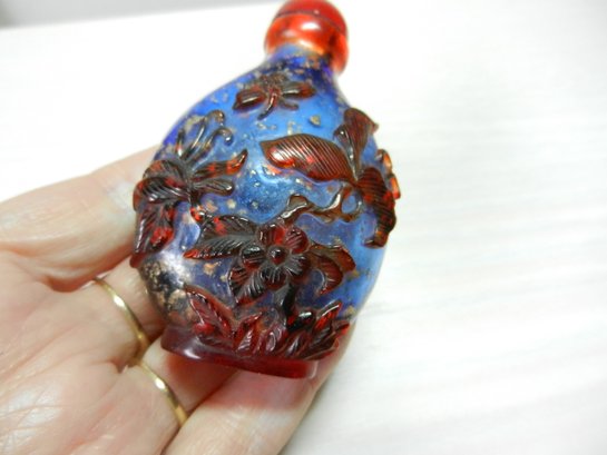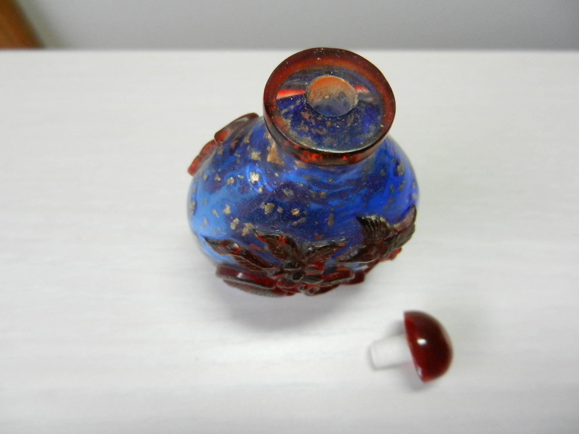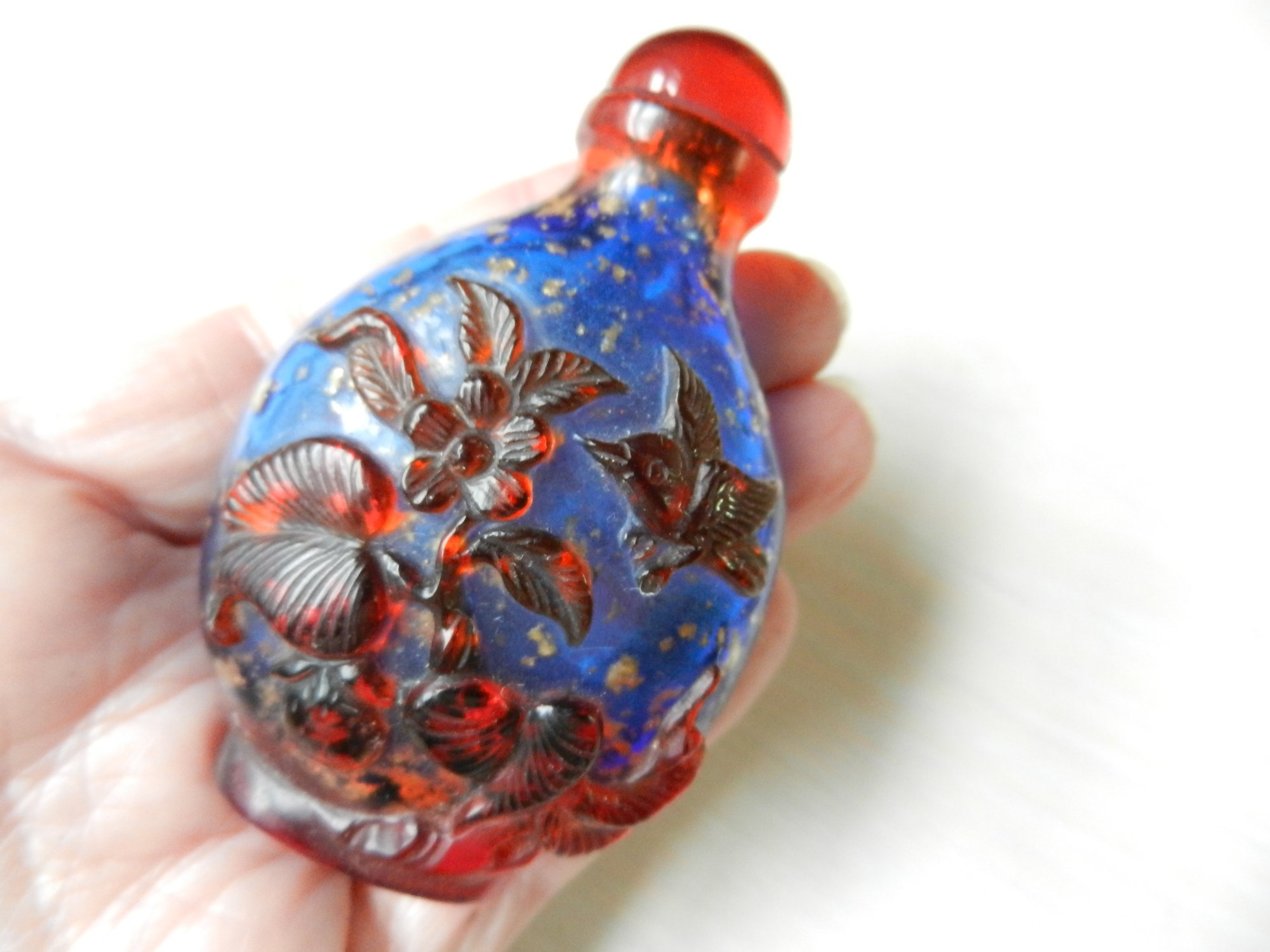 Vintage blue and red glass embossed snuff bottle – bird, butterfly, flowers (DP23)