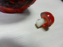 The blue background has flecks of gold in it. The red glass raised design is of flowers, butterflies, and birds. The bottle is glass but the cap is some form of resin.