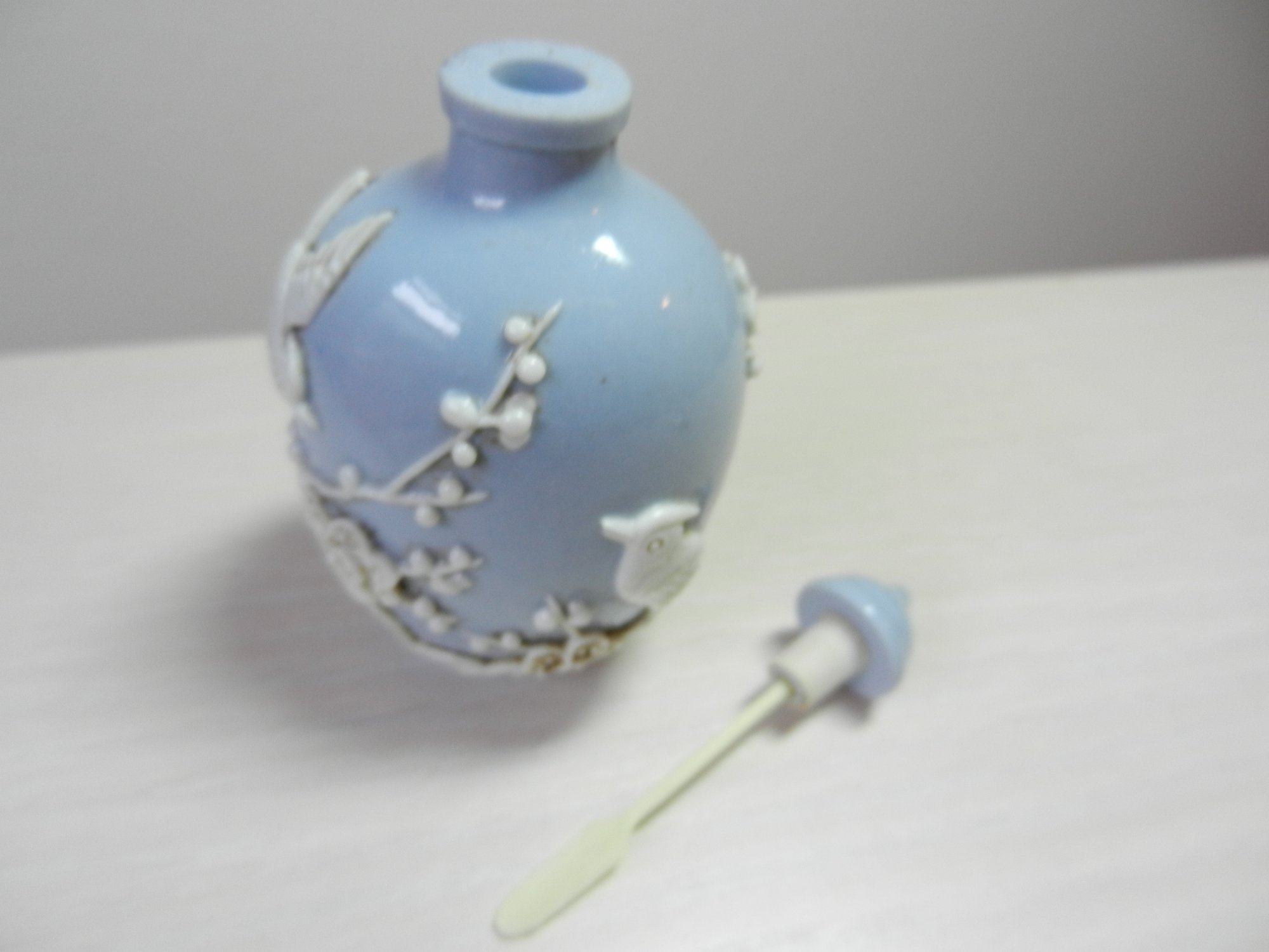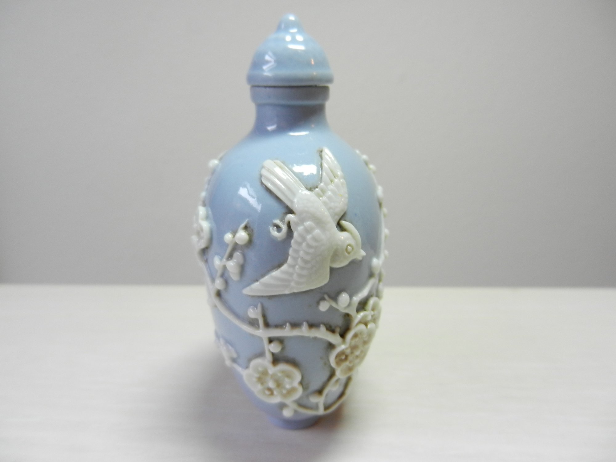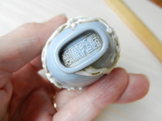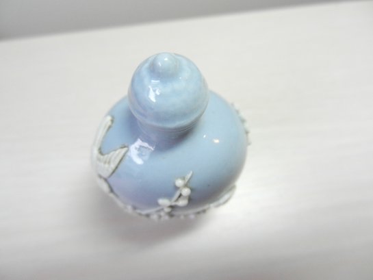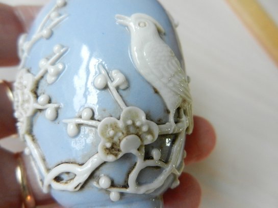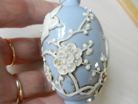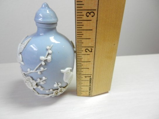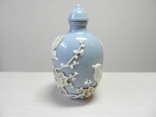 Vintage blue and white snuff bottle with birds and flowers and base mark (DP29)