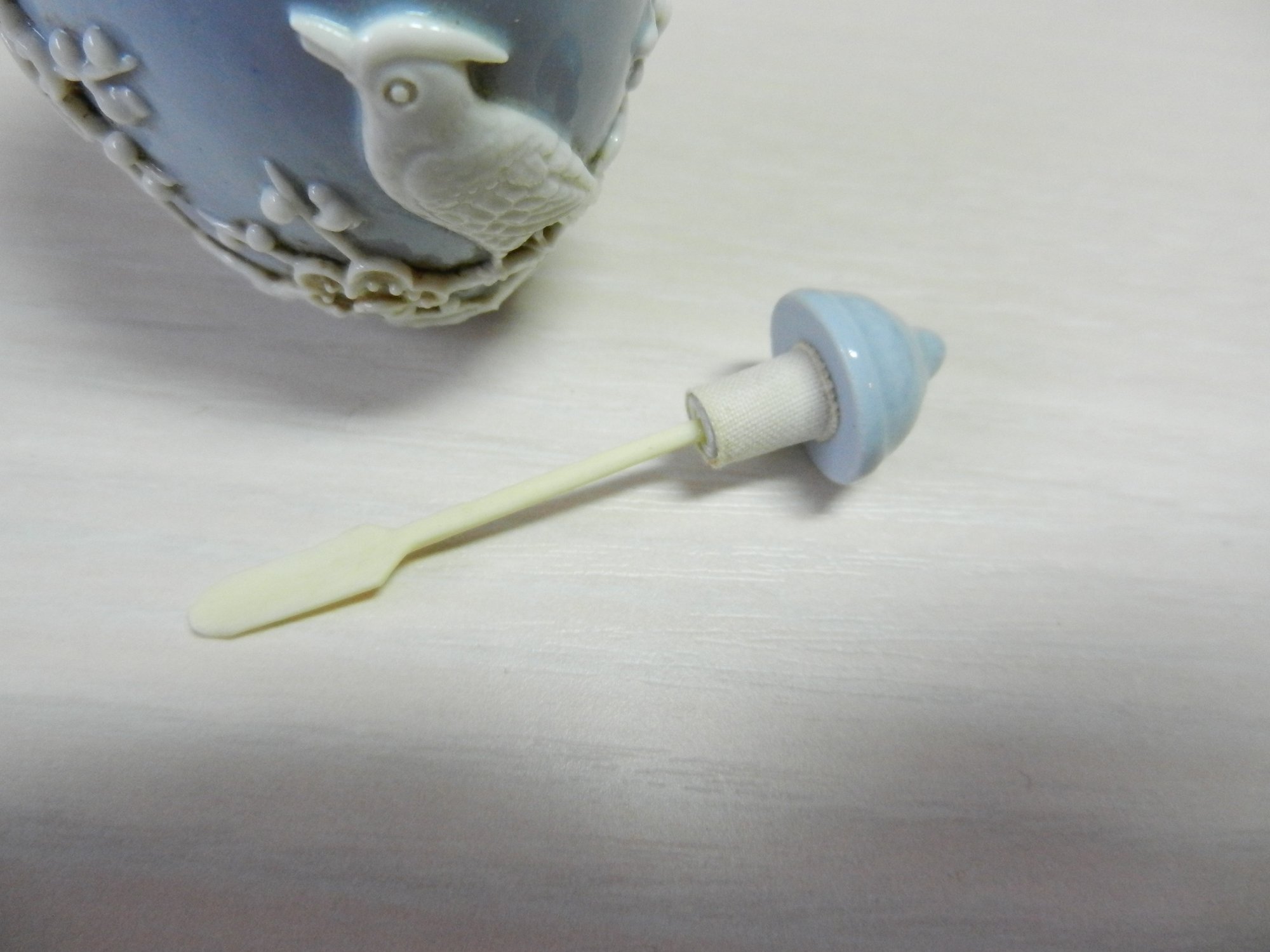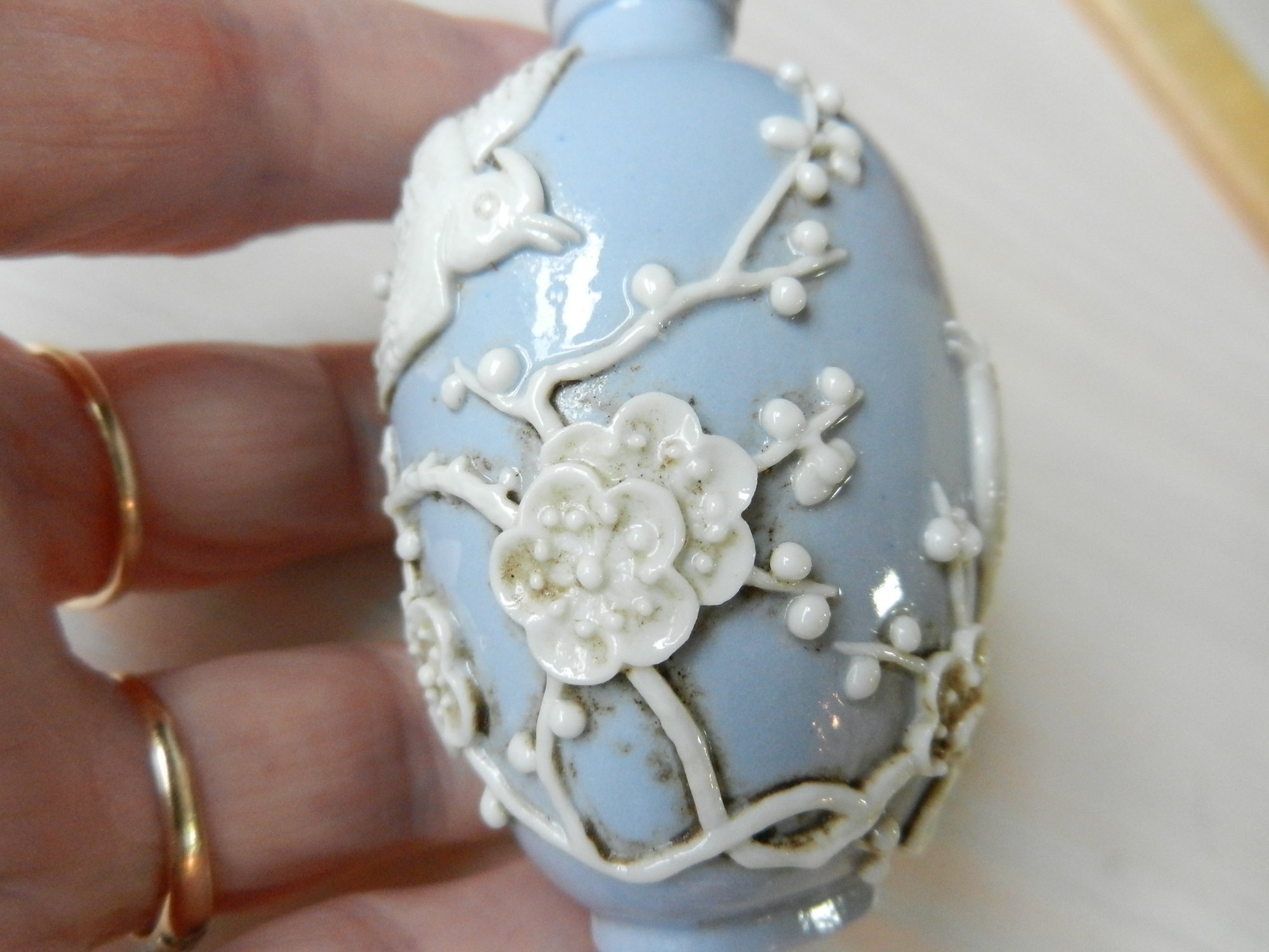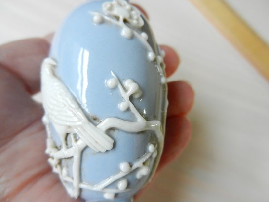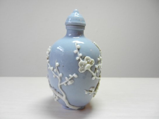 Vintage blue and white snuff bottle with birds and flowers and base mark (DP29)