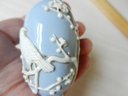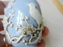 Approx. 3” high. The design is of a couple of birds and a cherry tree. Any dark marks are dust in the design folds or specks in the manufacturing.