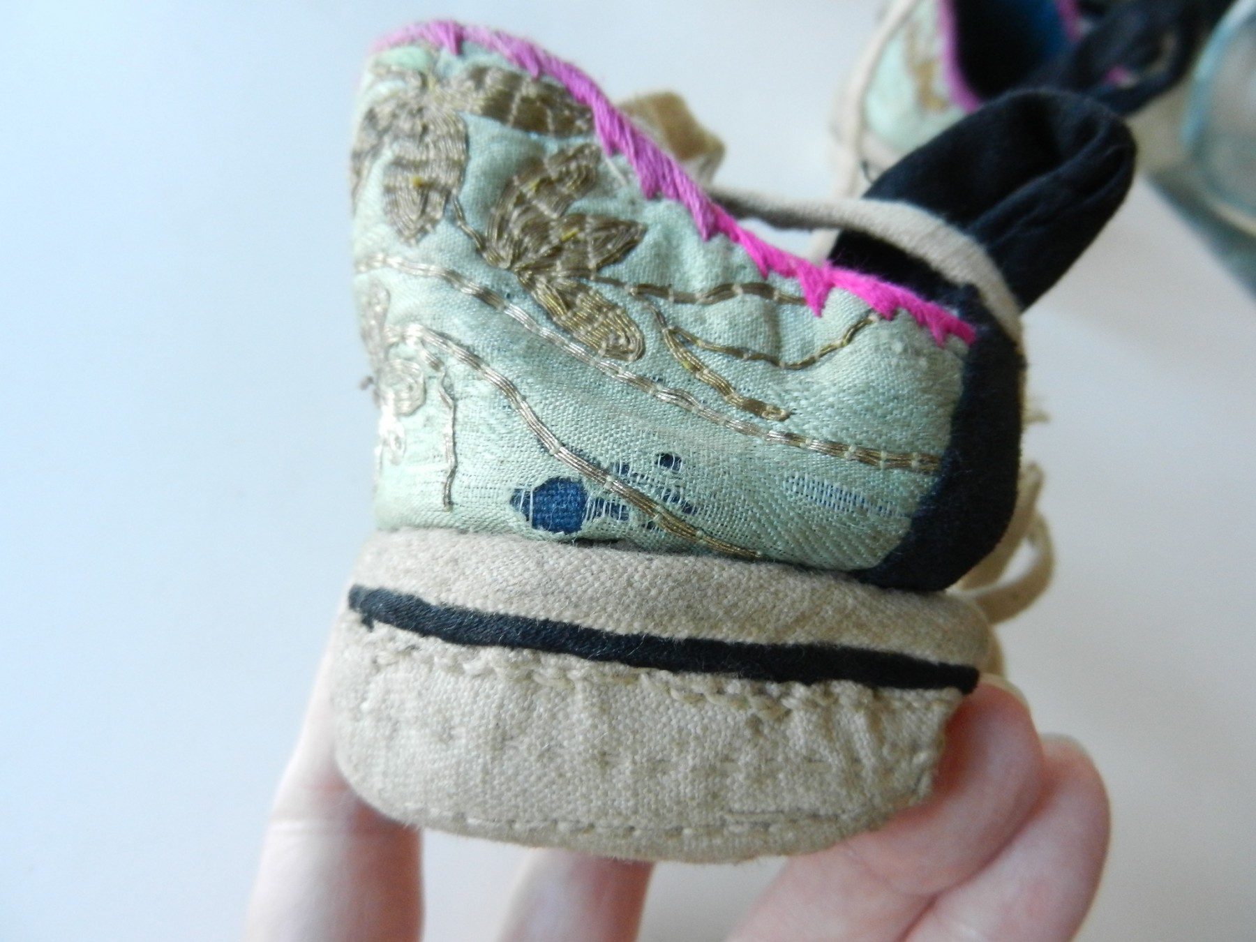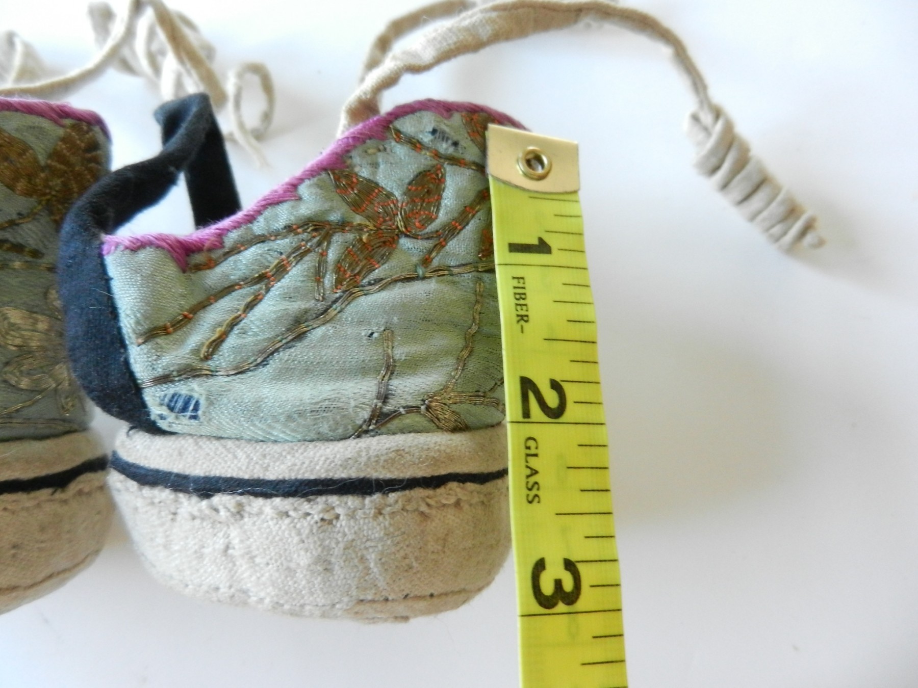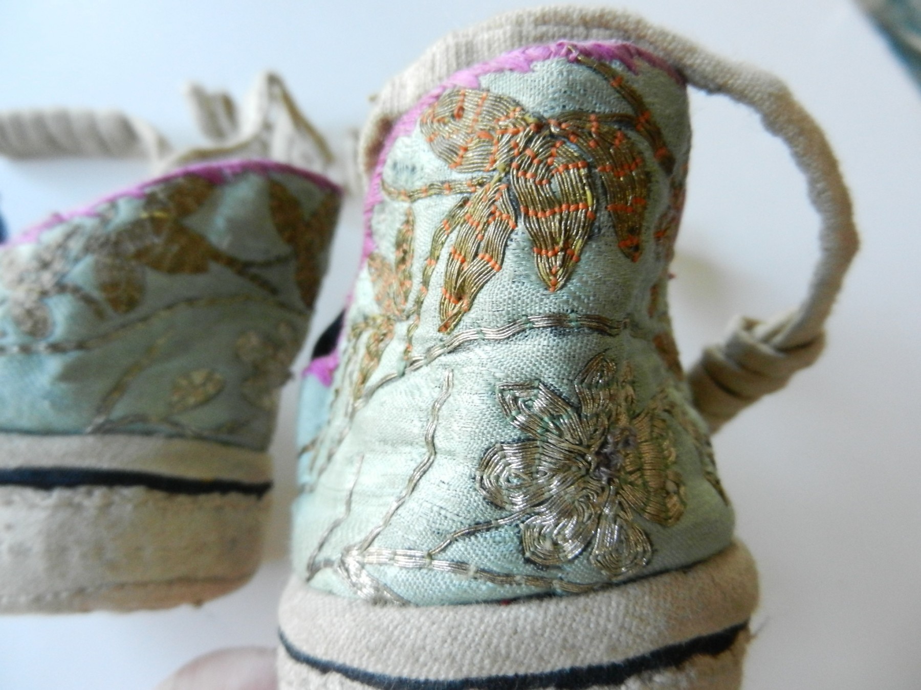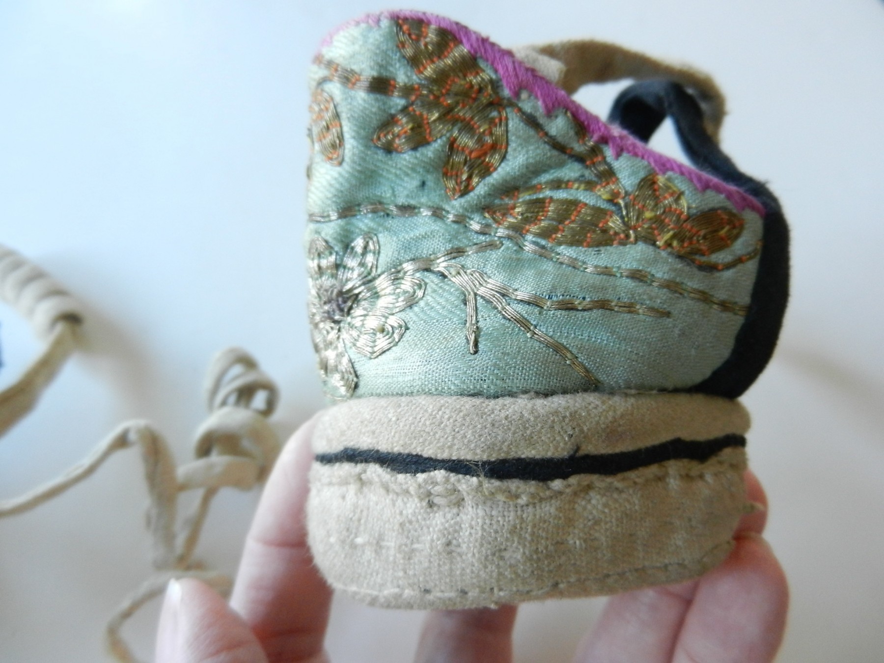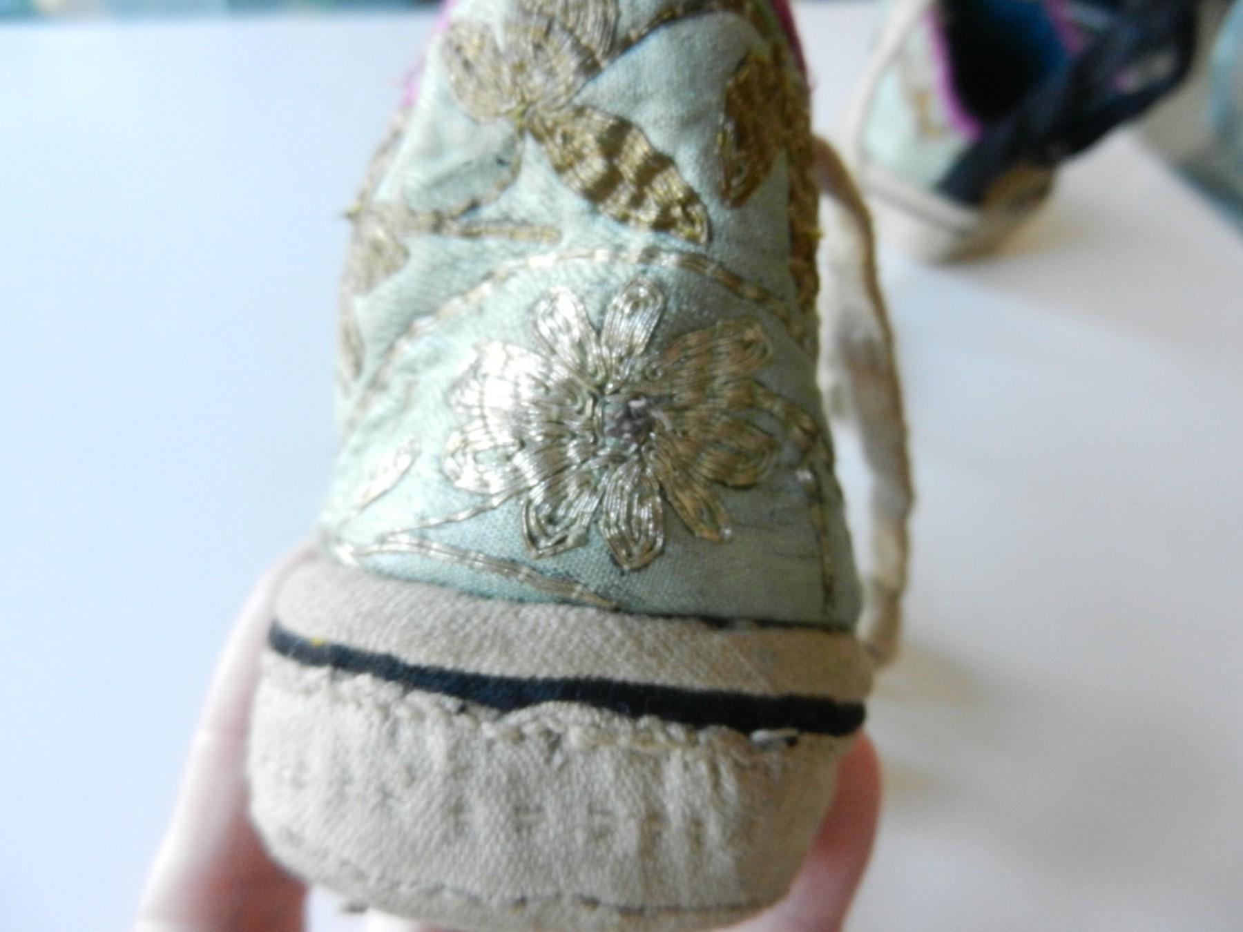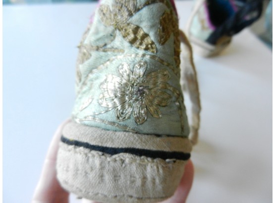 The gold and silver metallic threadwork is still in a good shiny condition. The pale green silk base has a few threadbare patches. The block heel is covered in a fabric canvas . It almost feels as though there is a wood block underneath, from the sound it makes when you tap it, but I am not sure. One of the coiled laces has come undone.