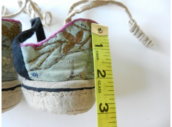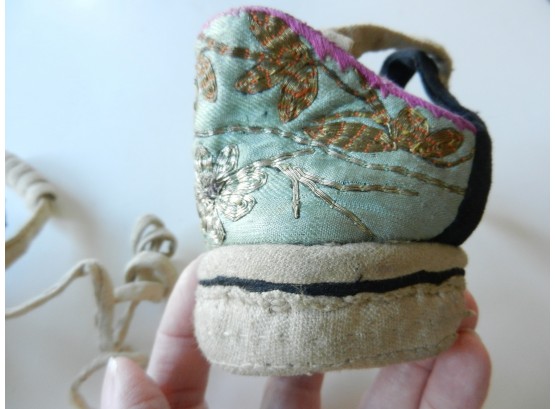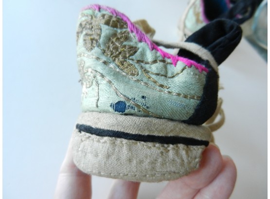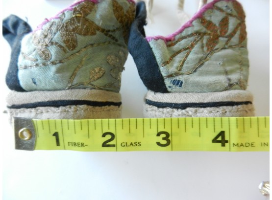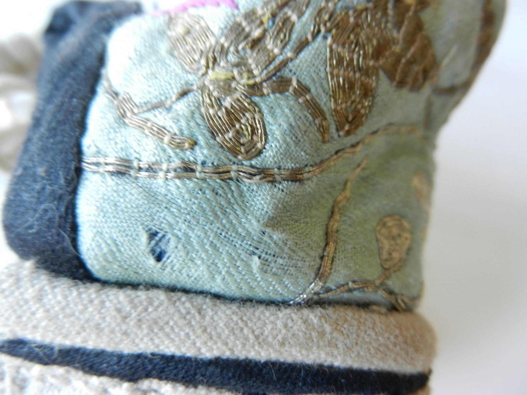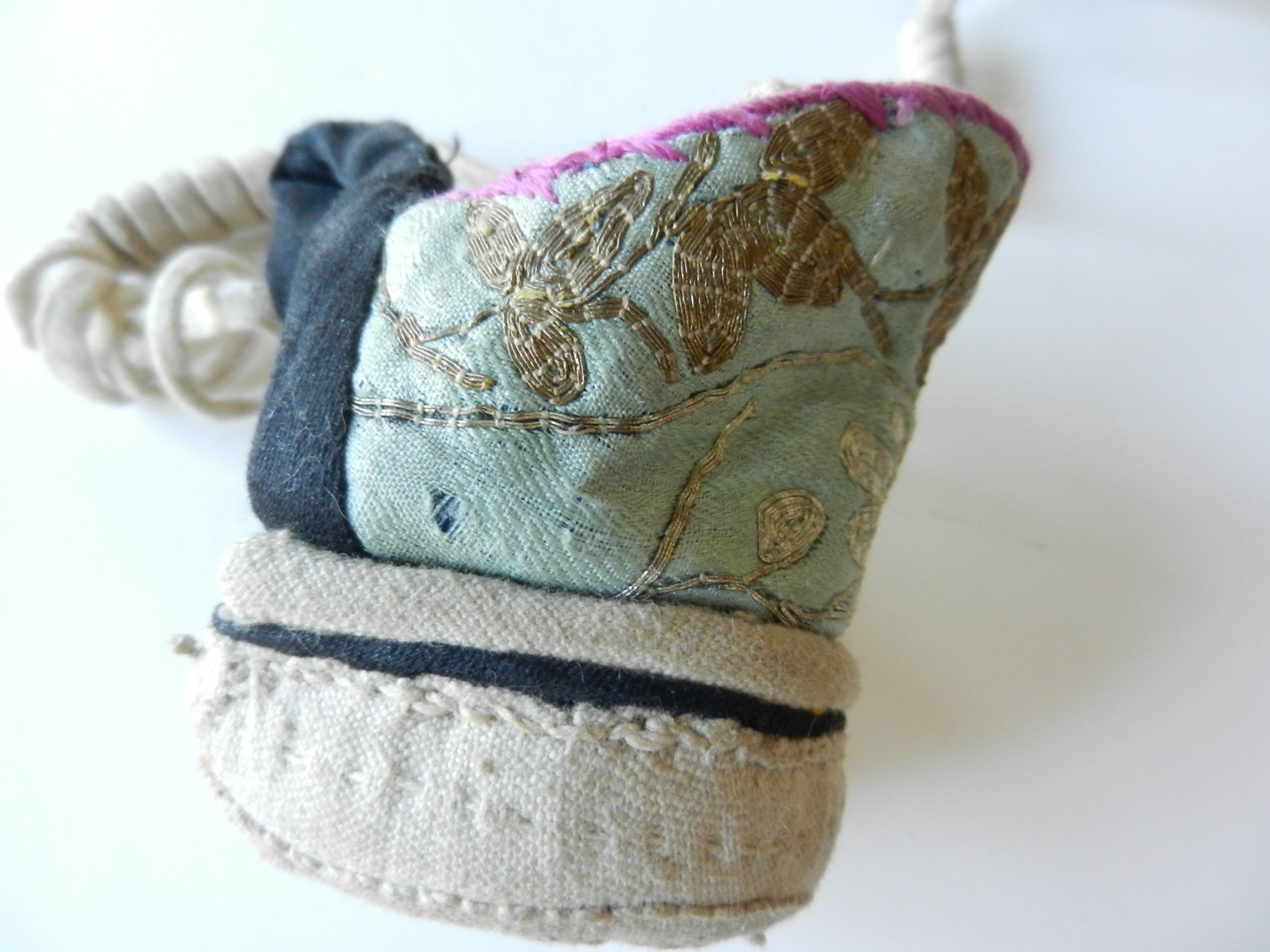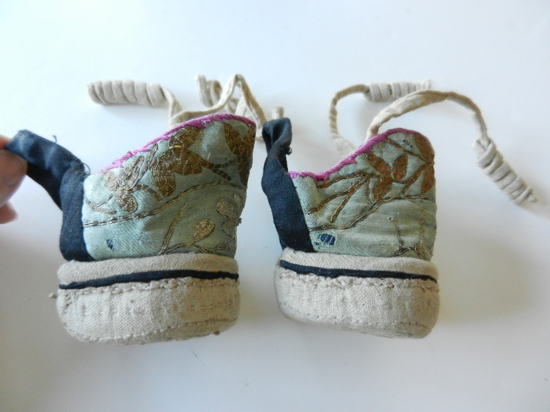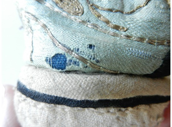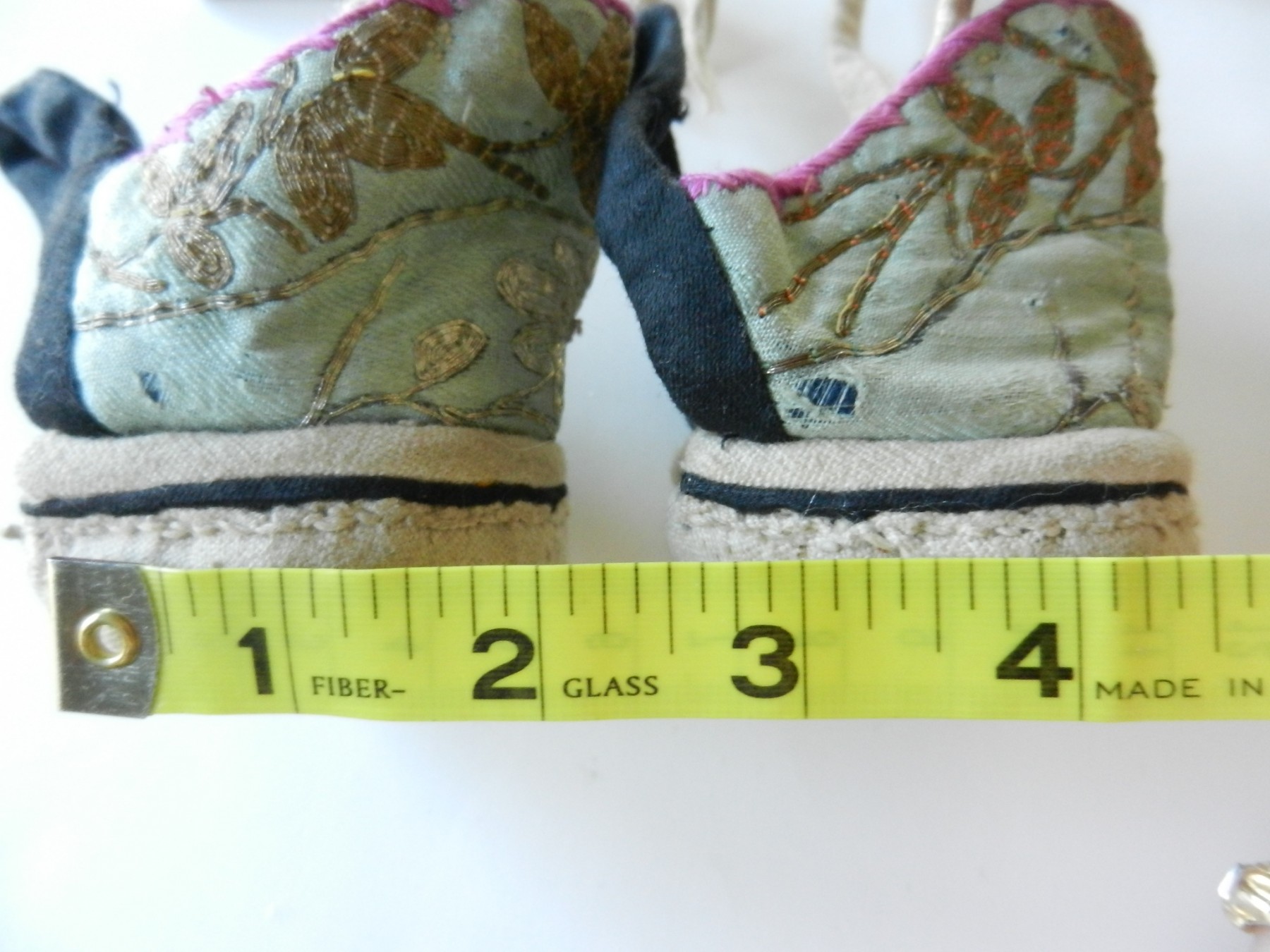 The gold and silver metallic threadwork is still in a good shiny condition. The pale green silk base has a few threadbare patches. The block heel is covered in a fabric canvas . It almost feels as though there is a wood block underneath, from the sound it makes when you tap it, but I am not sure. One of the coiled laces has come undone.