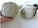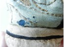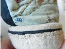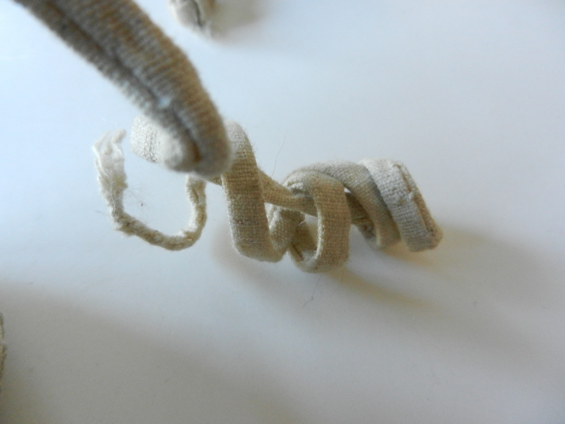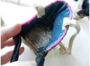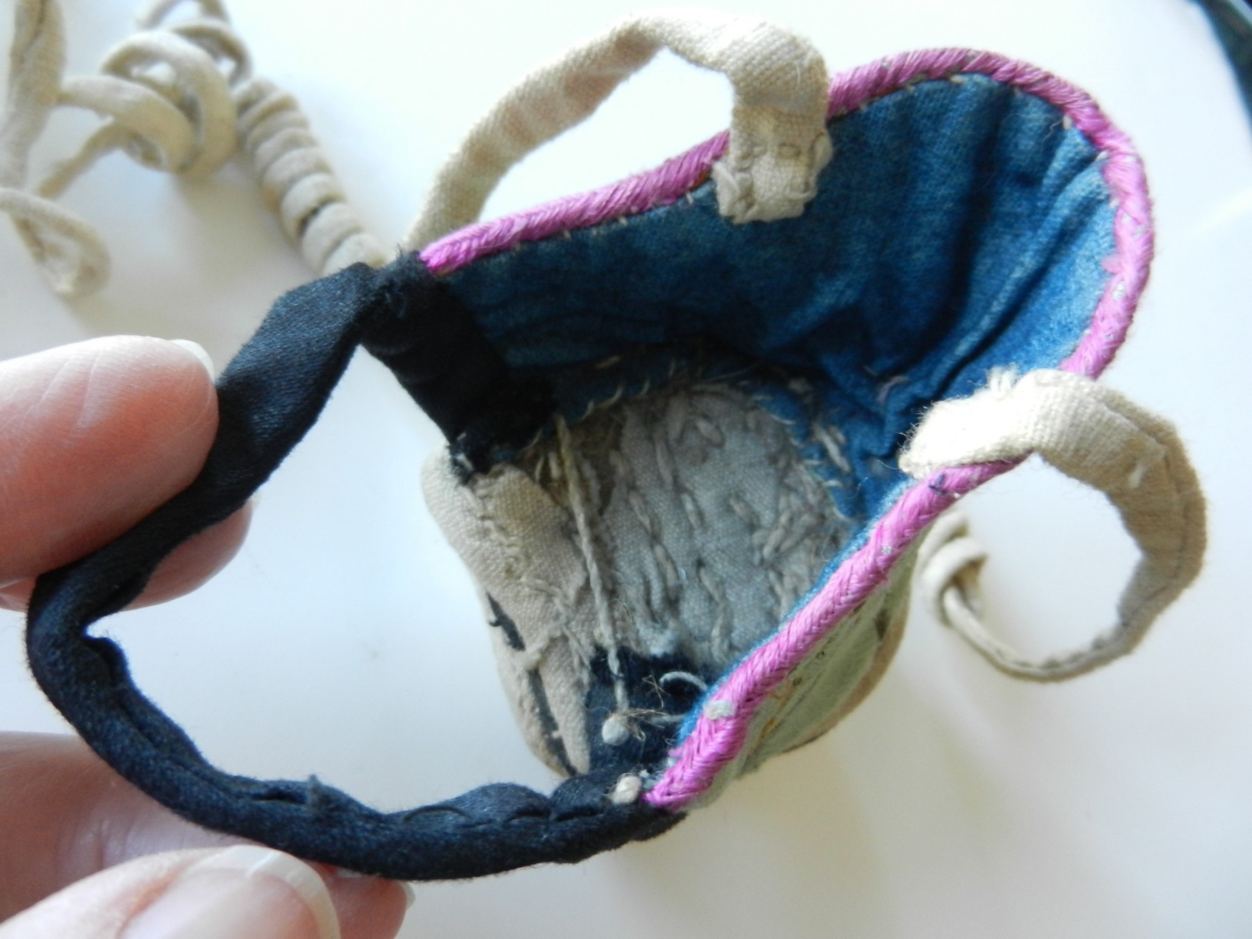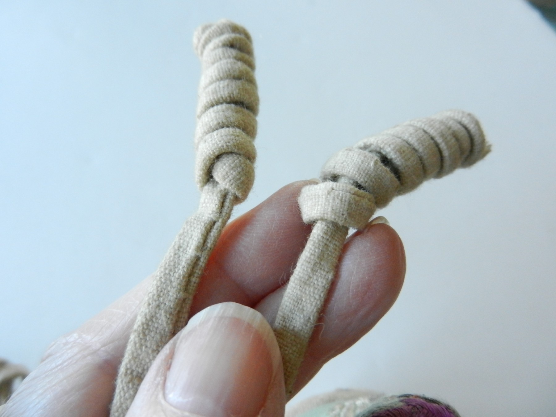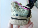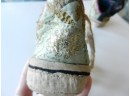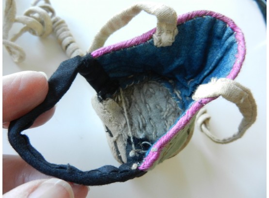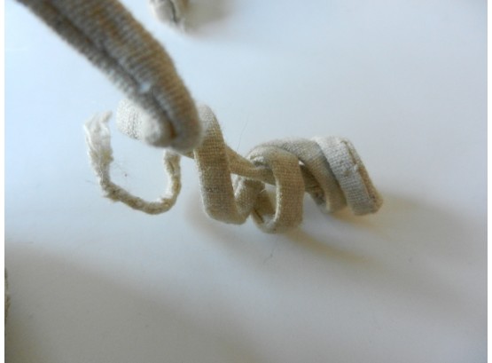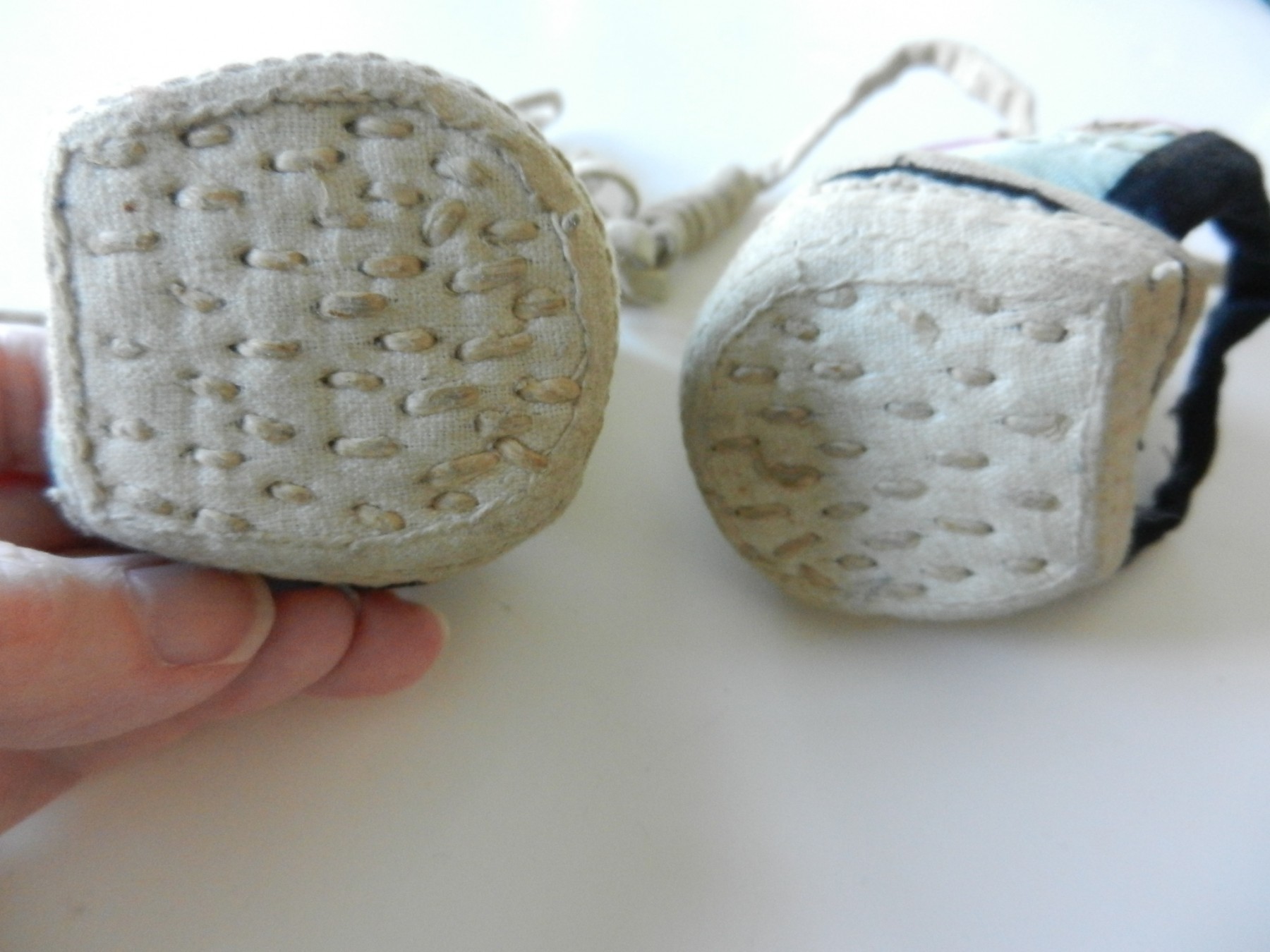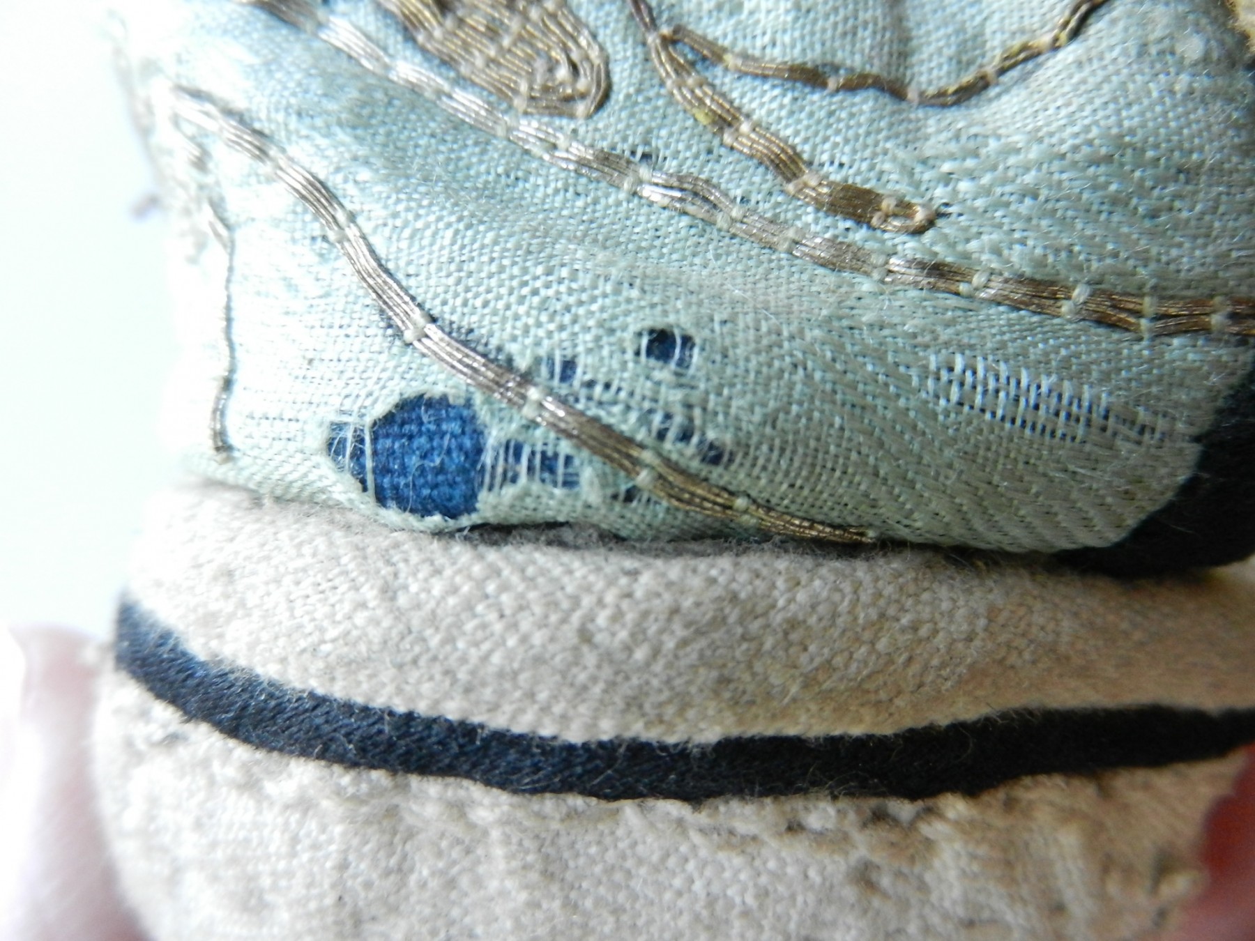 The gold and silver metallic threadwork is still in a good shiny condition. The pale green silk base has a few threadbare patches. The block heel is covered in a fabric canvas . It almost feels as though there is a wood block underneath, from the sound it makes when you tap it, but I am not sure. One of the coiled laces has come undone.
