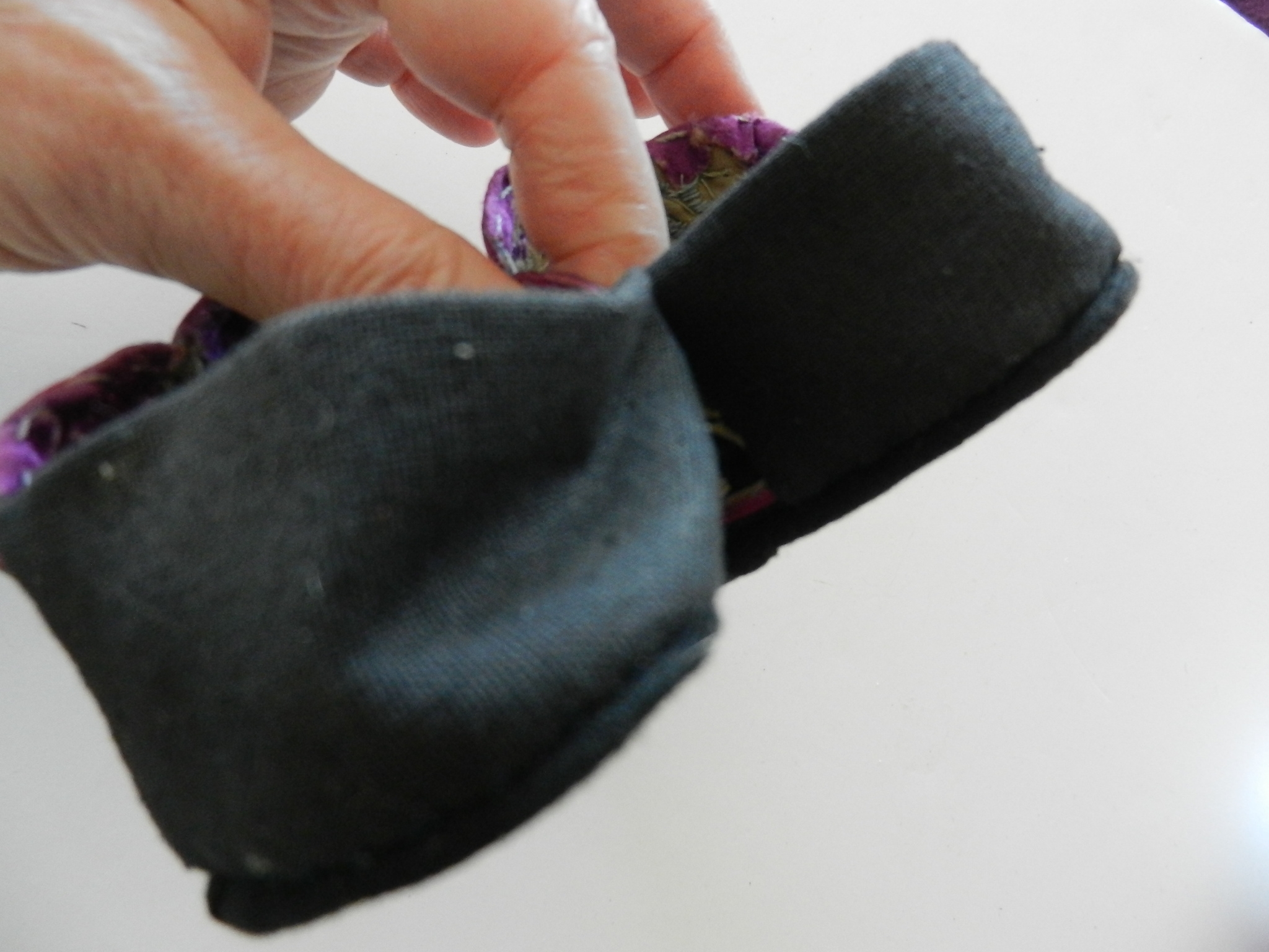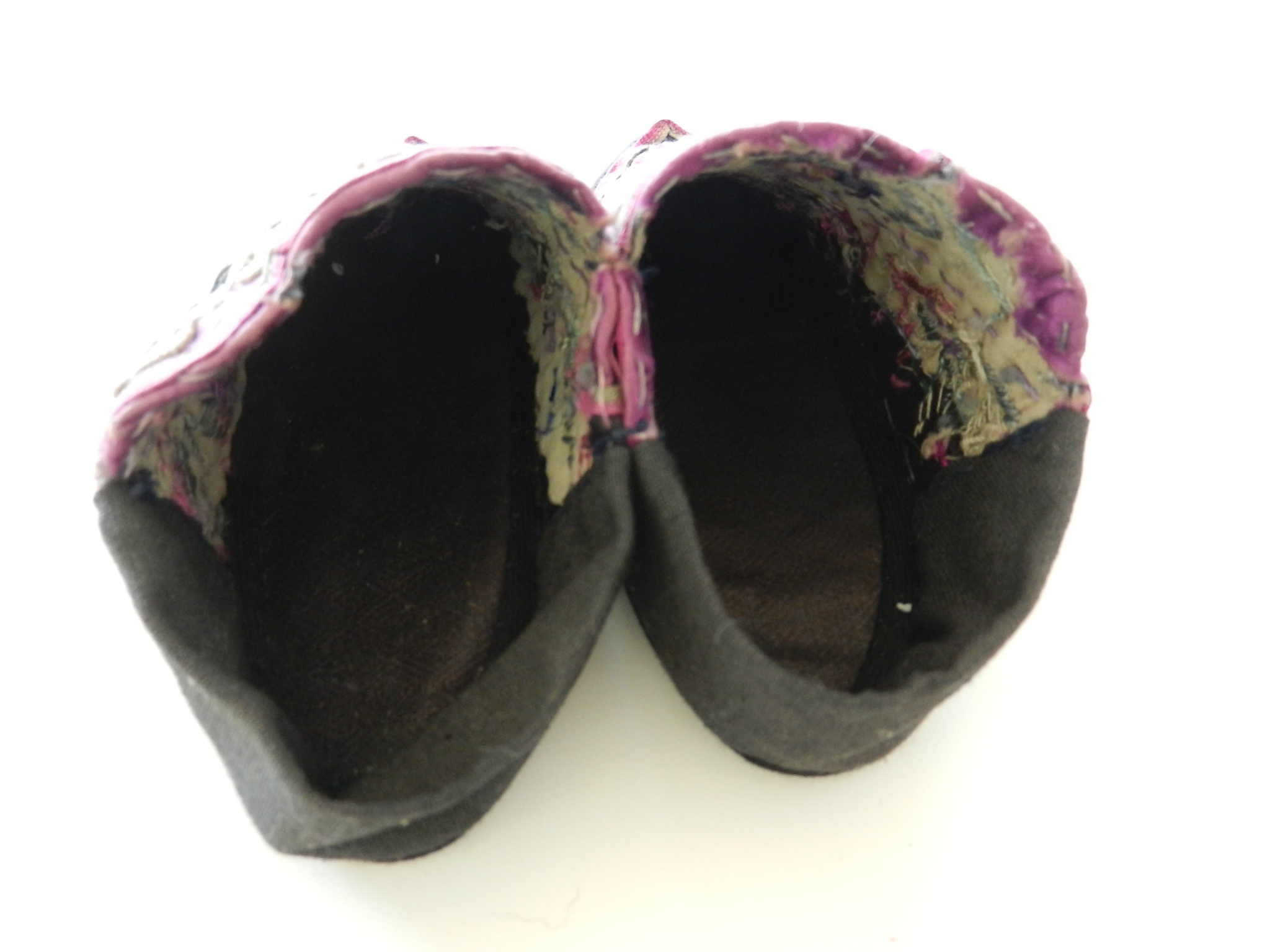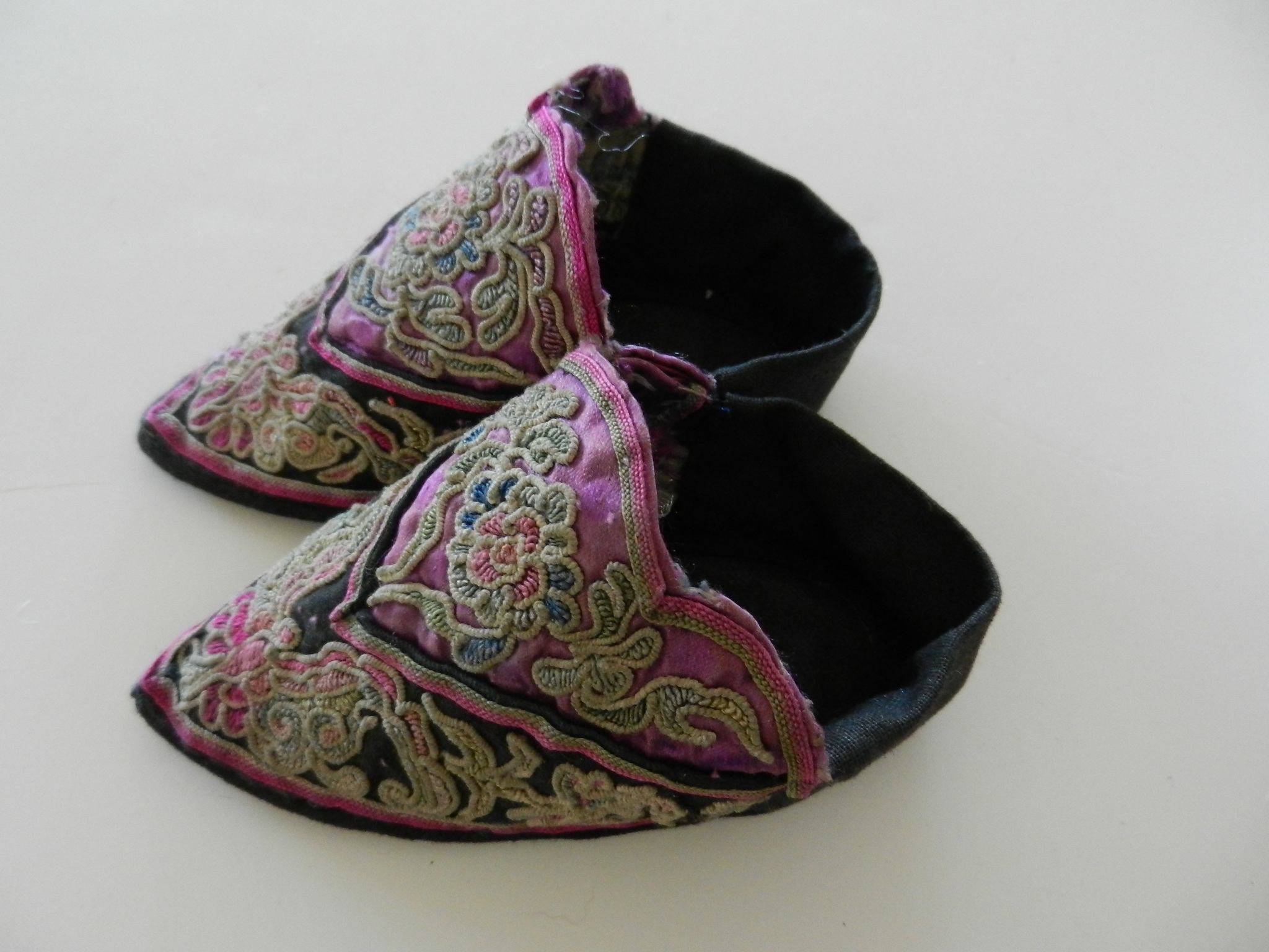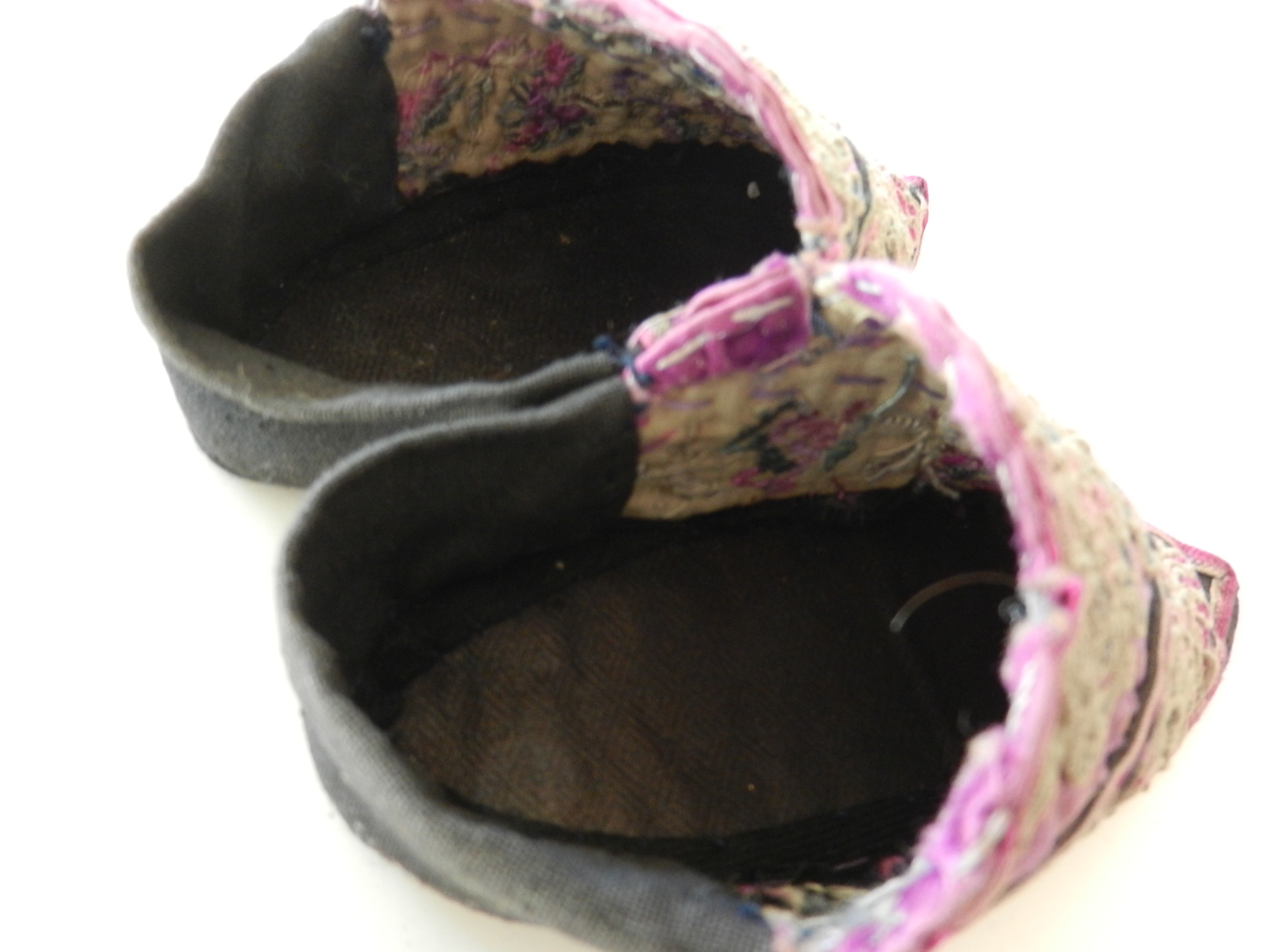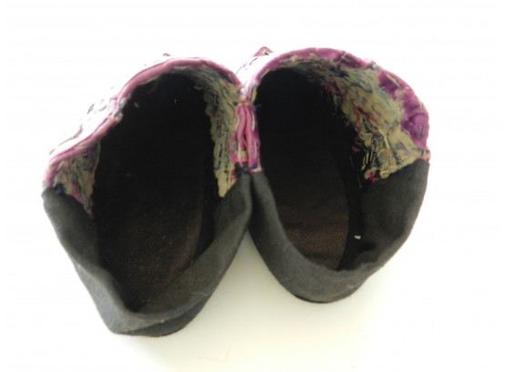 These are soft and I believe they may be slipper shoes as they are soft. The soles are soft but a little firmer than the uppers. The purple on the uppers is silk but there is some wearing to it. The rest appears to be cotton. The couched embroidery is faded and a little grubby.