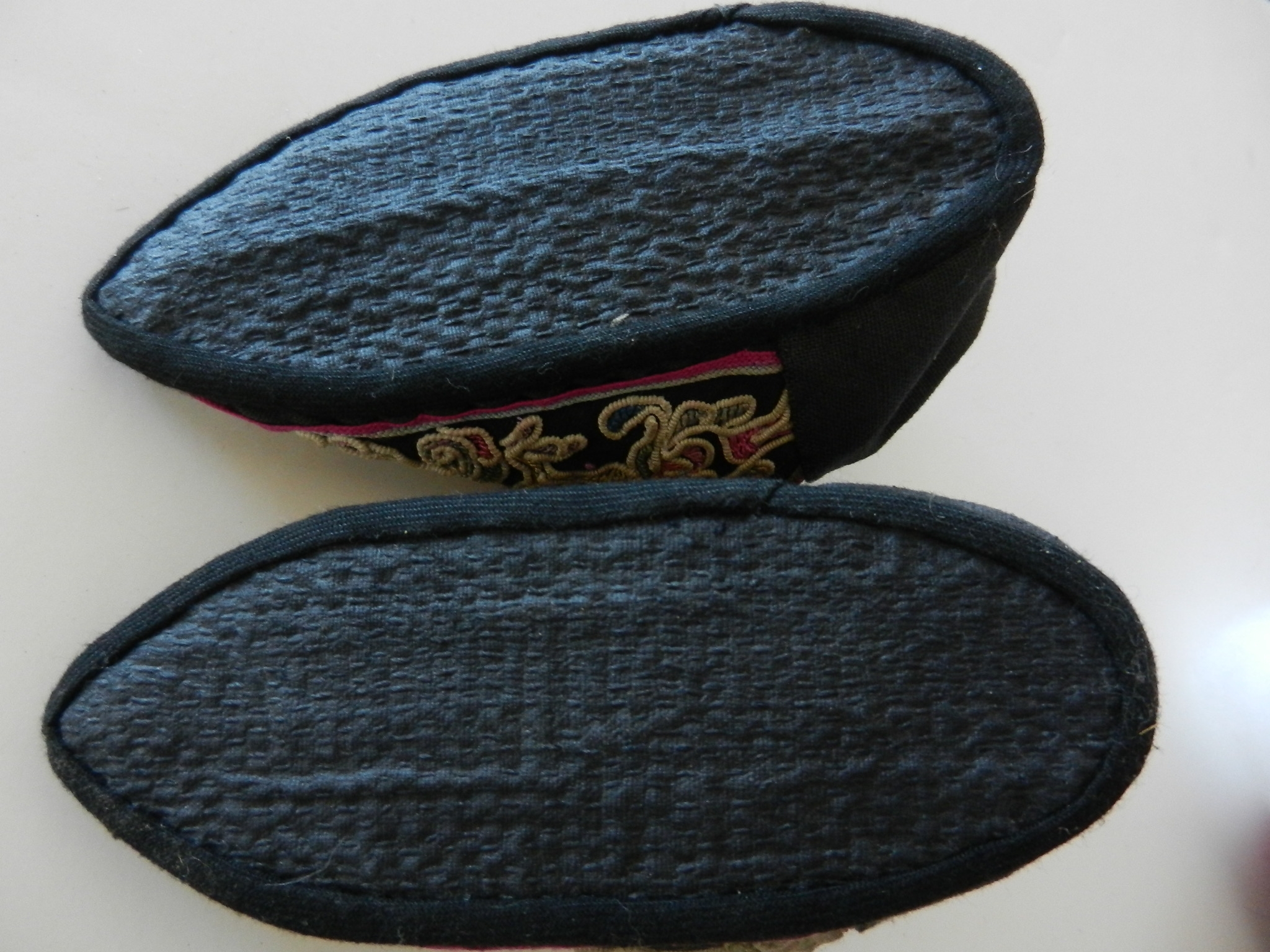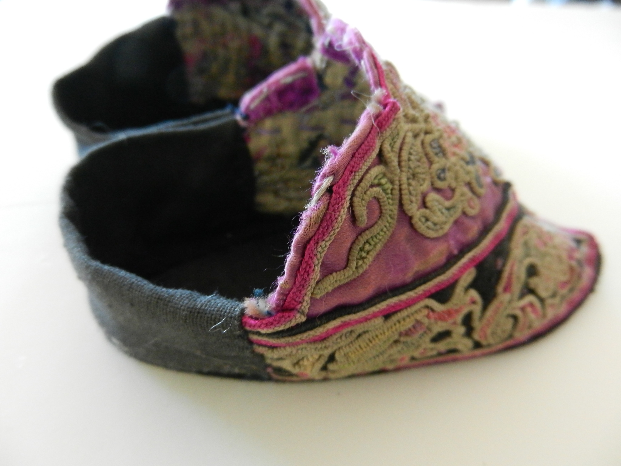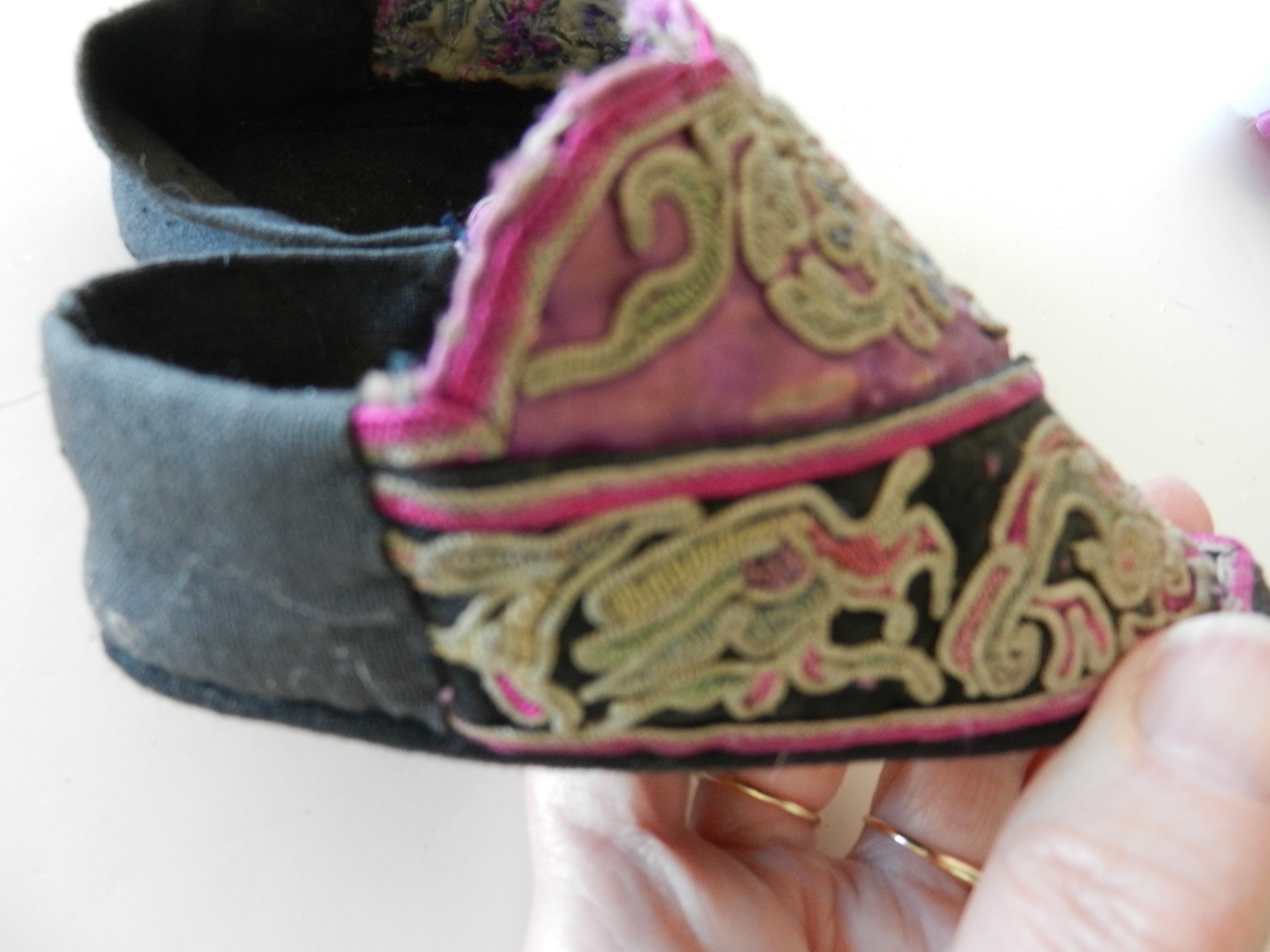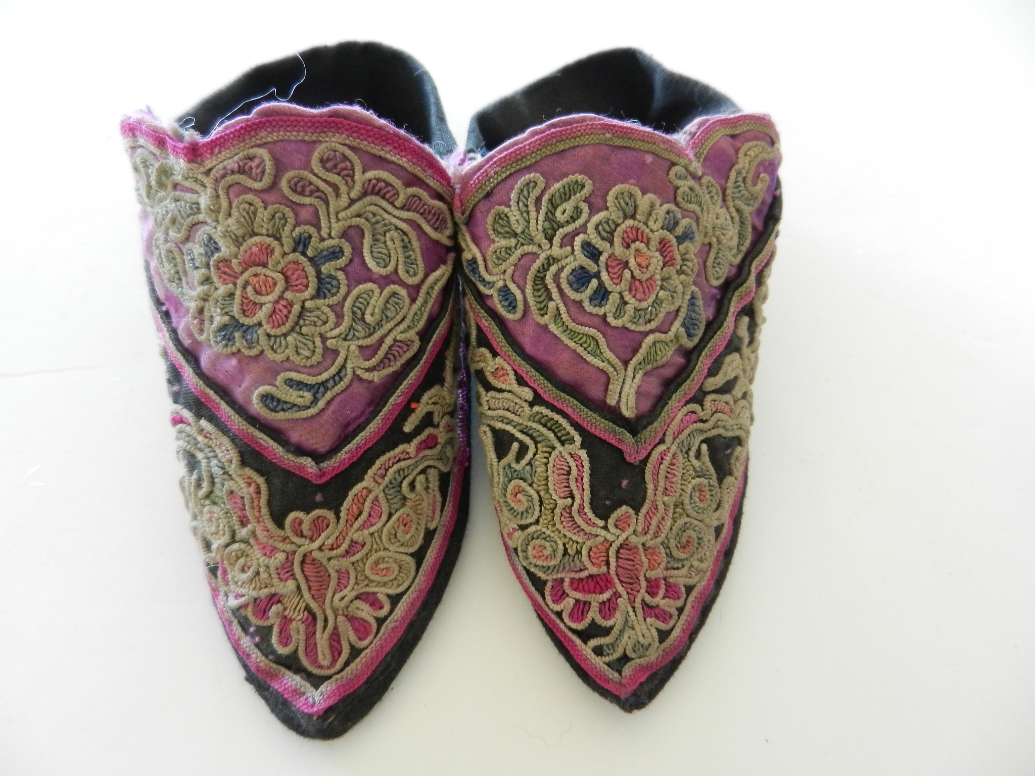 These are soft and I believe they may be slipper shoes as they are soft. The soles are soft but a little firmer than the uppers. The purple on the uppers is silk but there is some wearing to it. The rest appears to be cotton. The couched embroidery is faded and a little grubby.