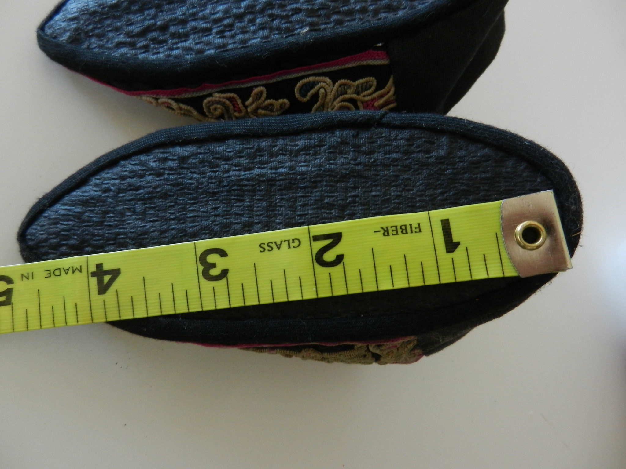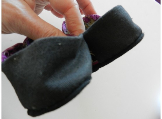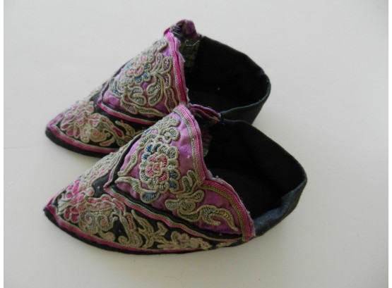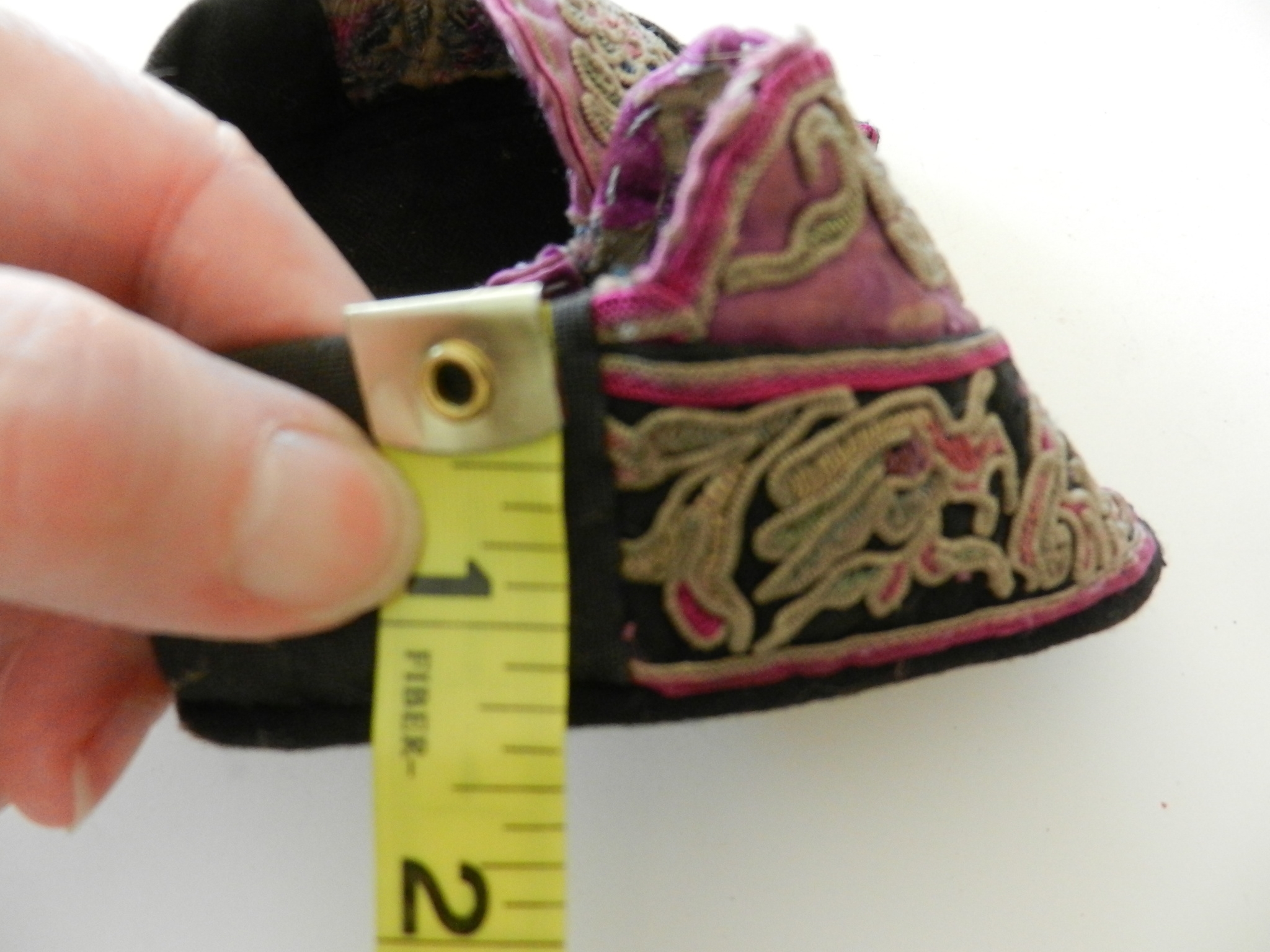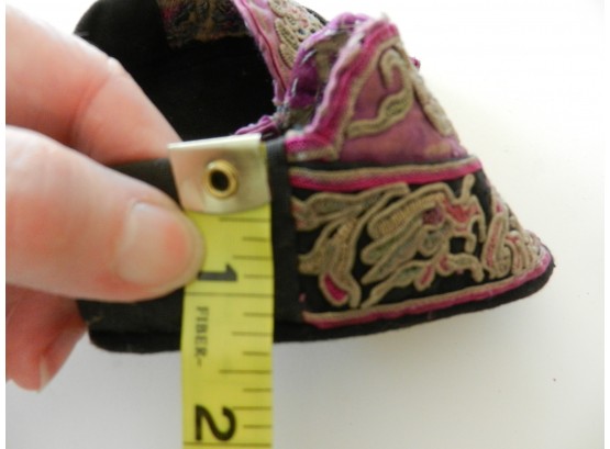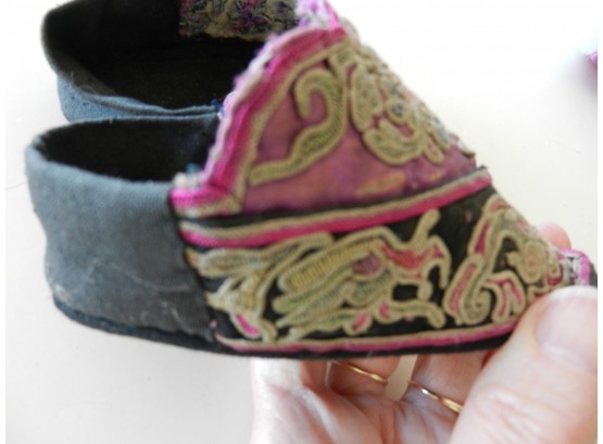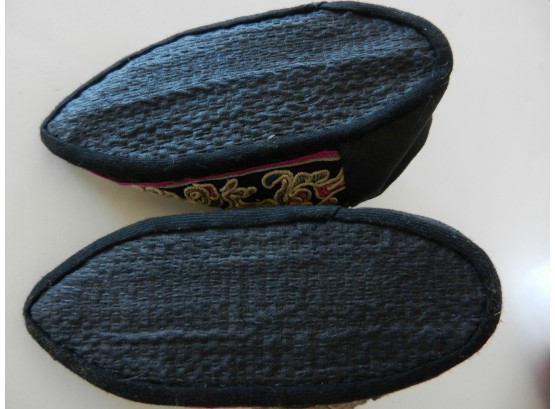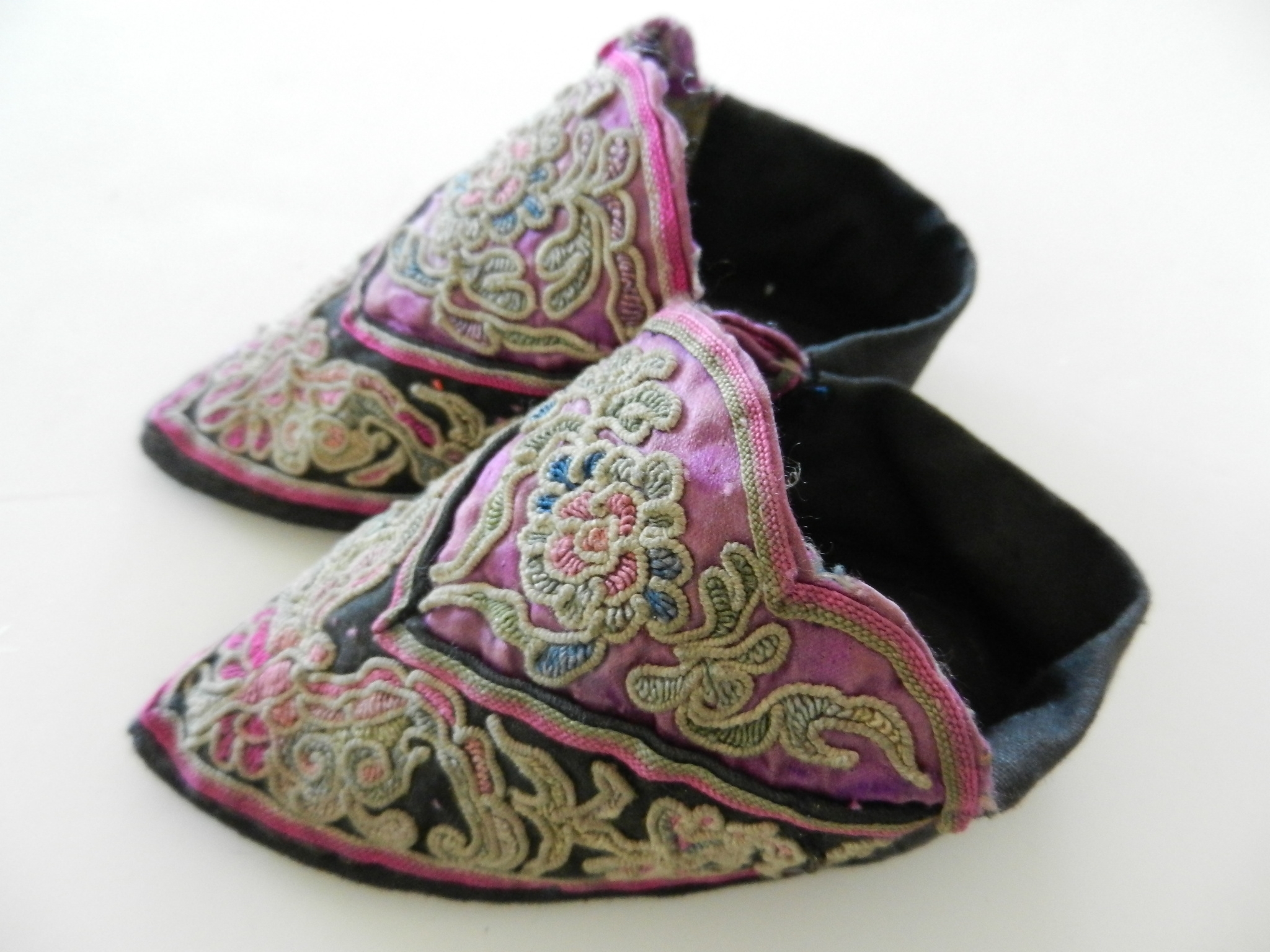 These are soft and I believe they may be slipper shoes as they are soft. The soles are soft but a little firmer than the uppers. The purple on the uppers is silk but there is some wearing to it. The rest appears to be cotton. The couched embroidery is faded and a little grubby.