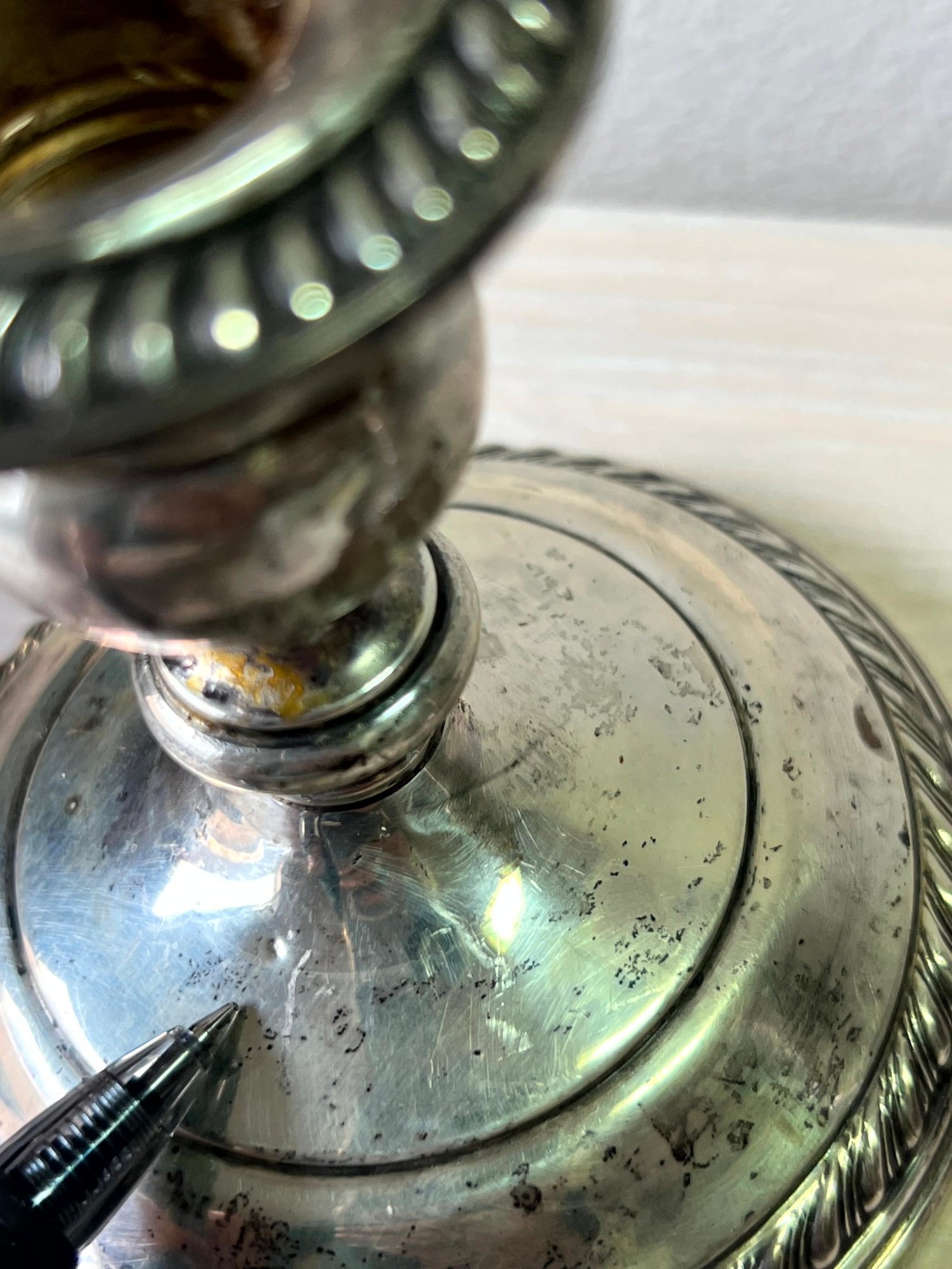 Small dink in both bases and the top rim of one is crushed down. Both have had something spilt down one side.