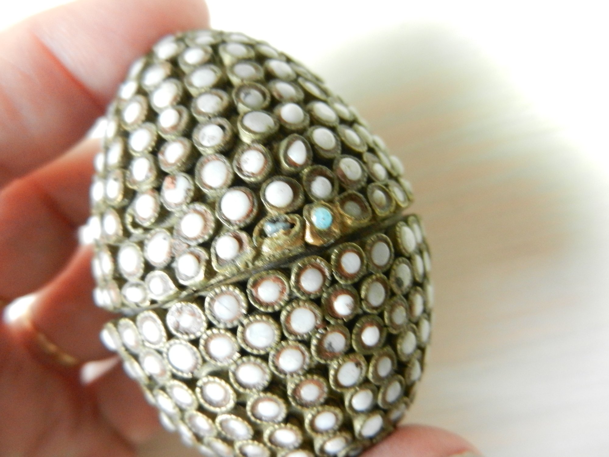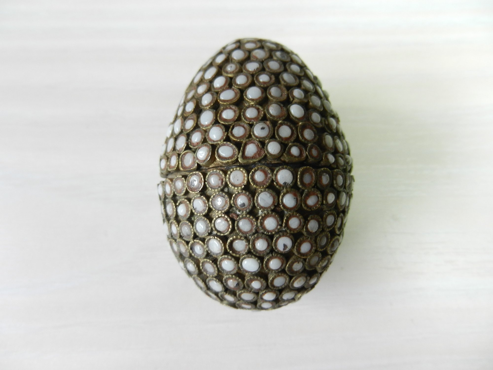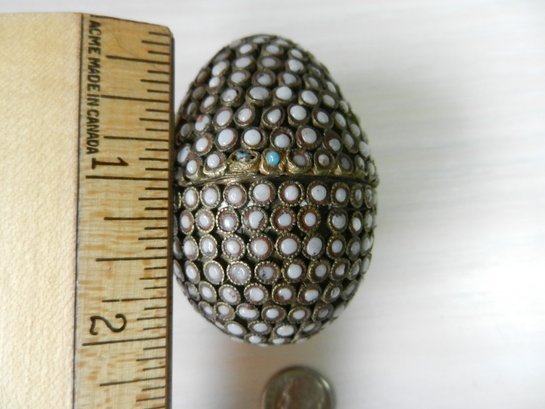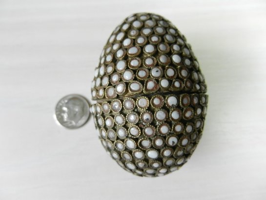 Vintage metal egg shaped box with opaque white stone inlay pattern (DP17)