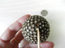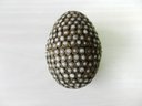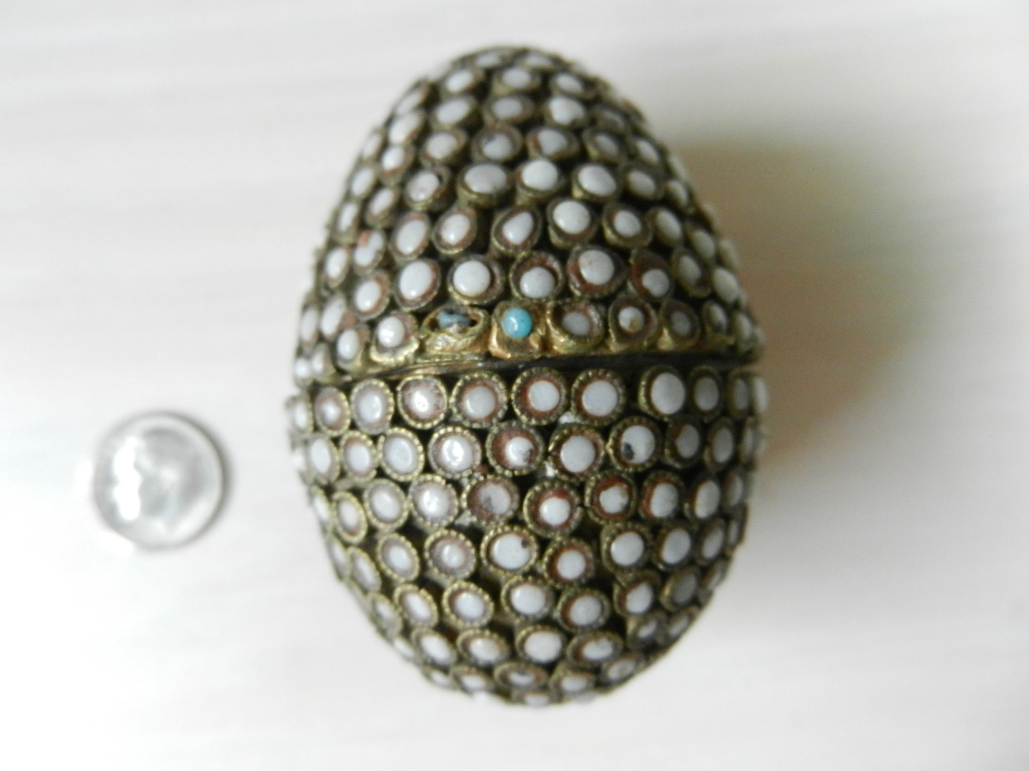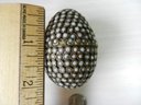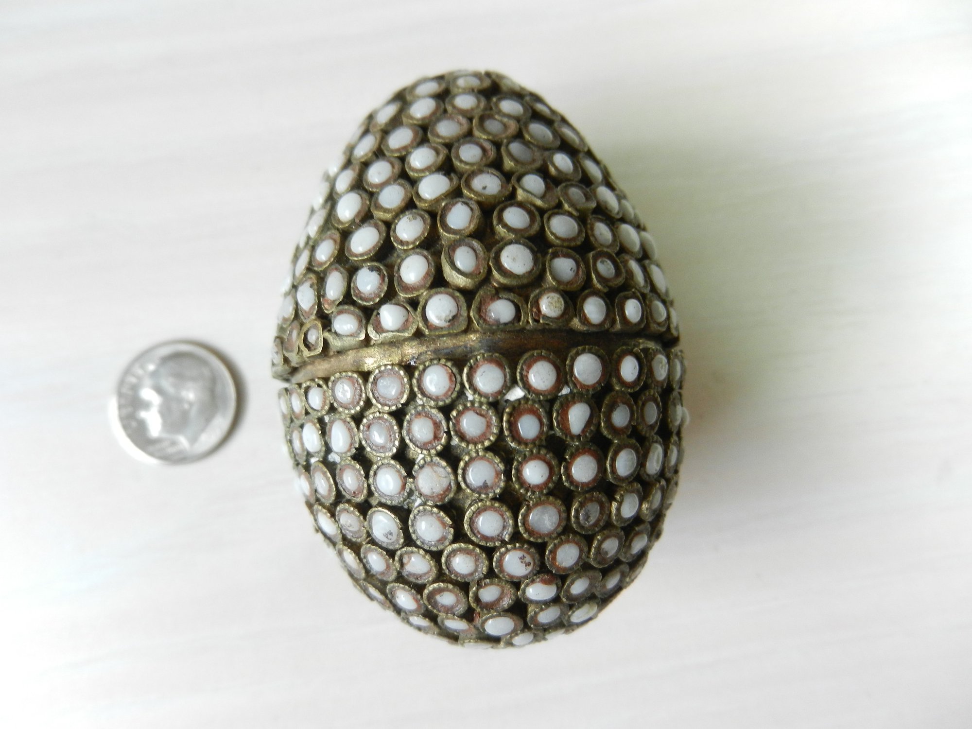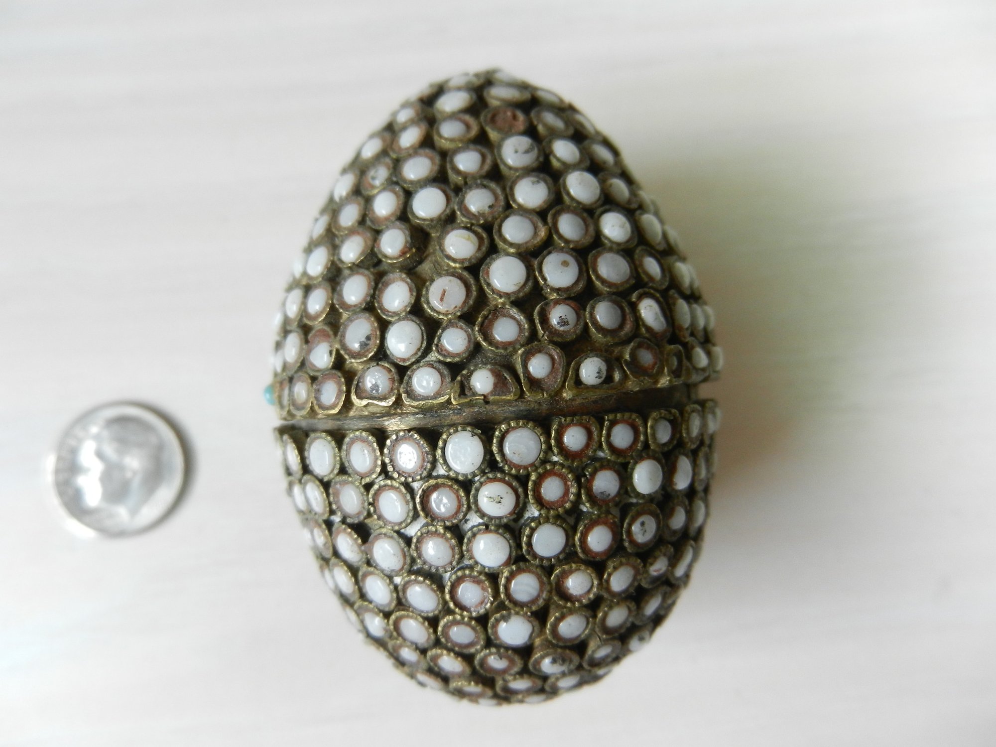 Vintage metal egg shaped box with opaque white stone inlay pattern (DP17)