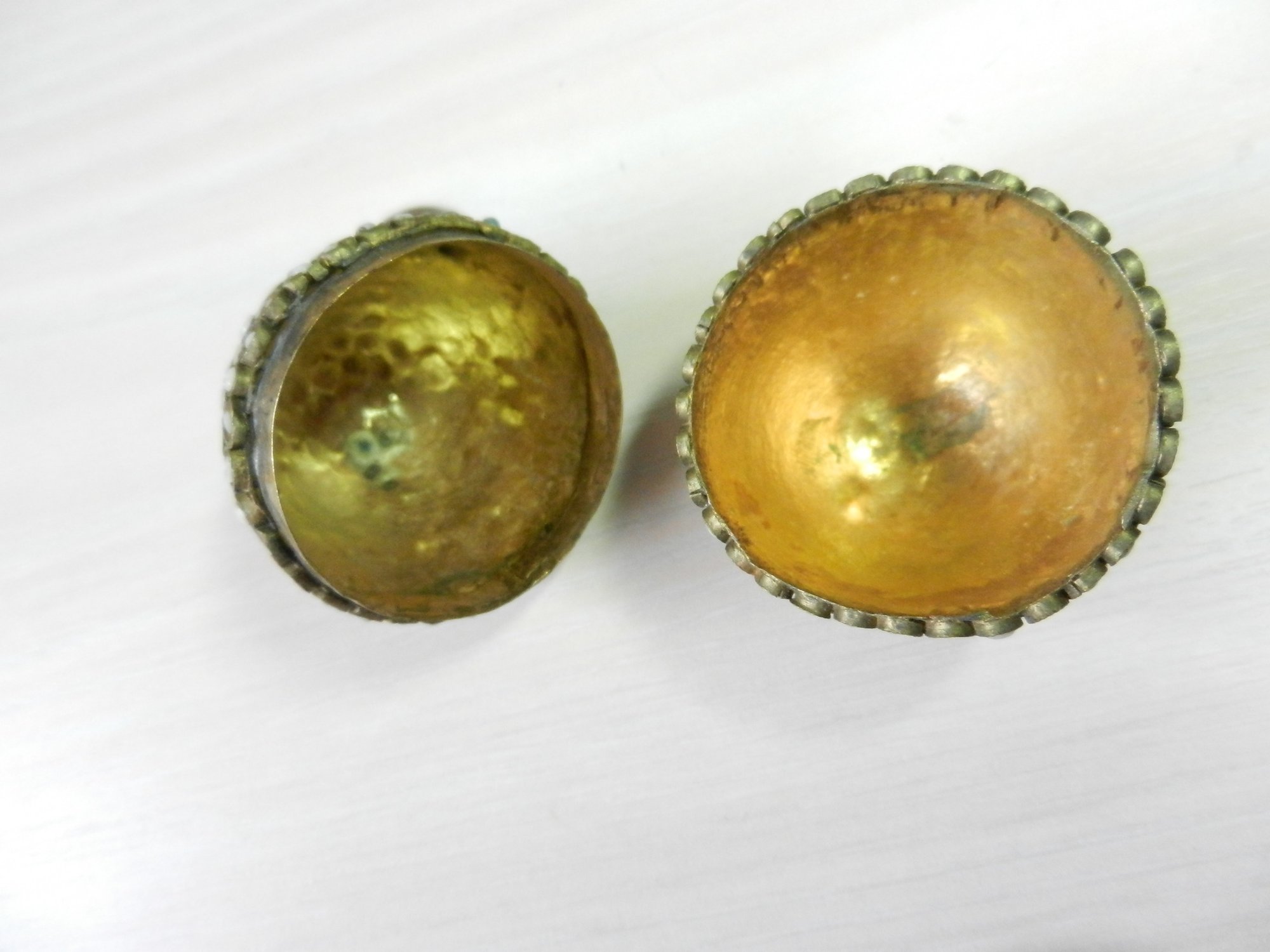 Approx 2 ½” high. Gilt wash inside. I can see 2 of the stones are missing. Possibly Tibetan/Indian.