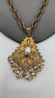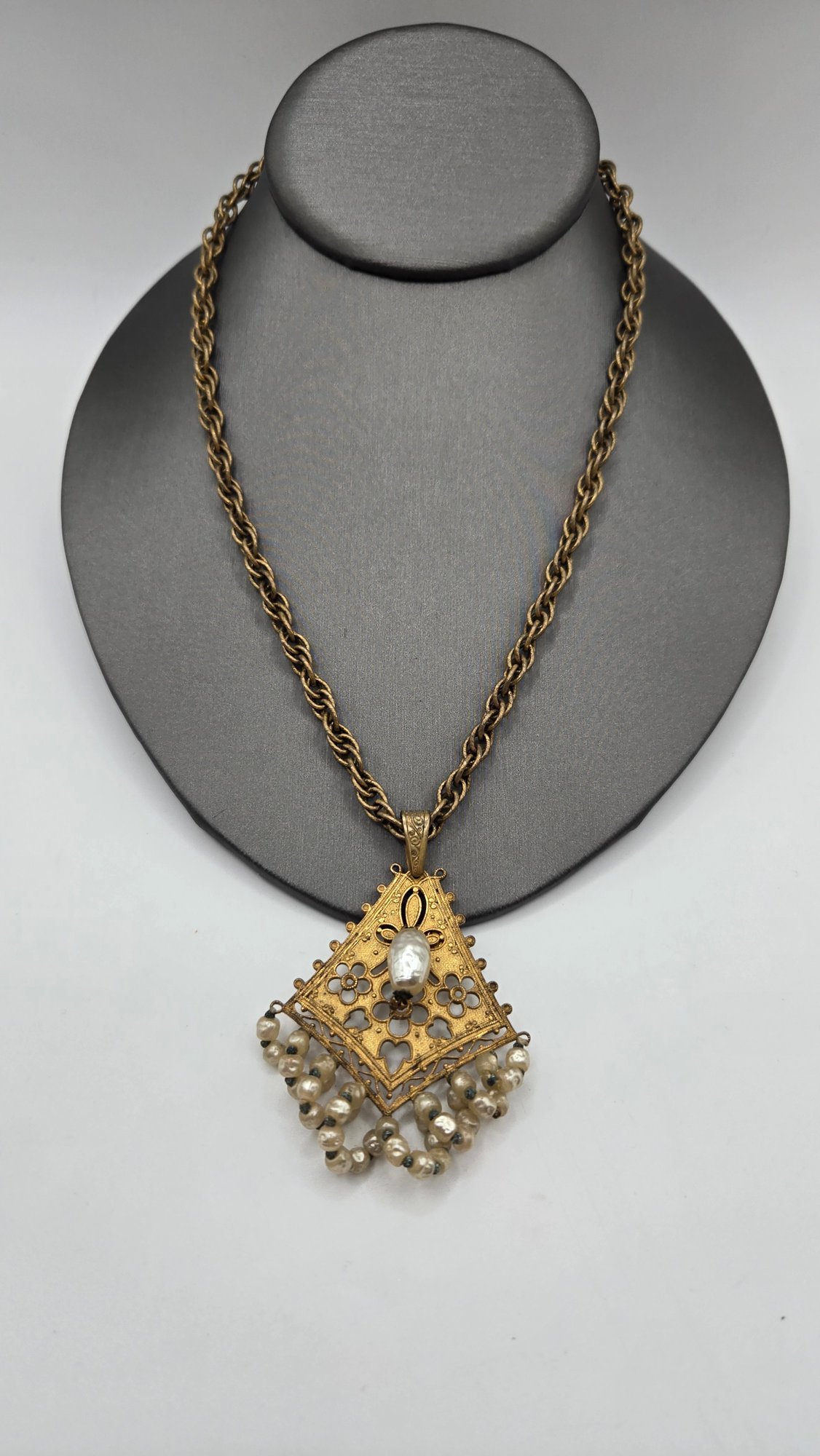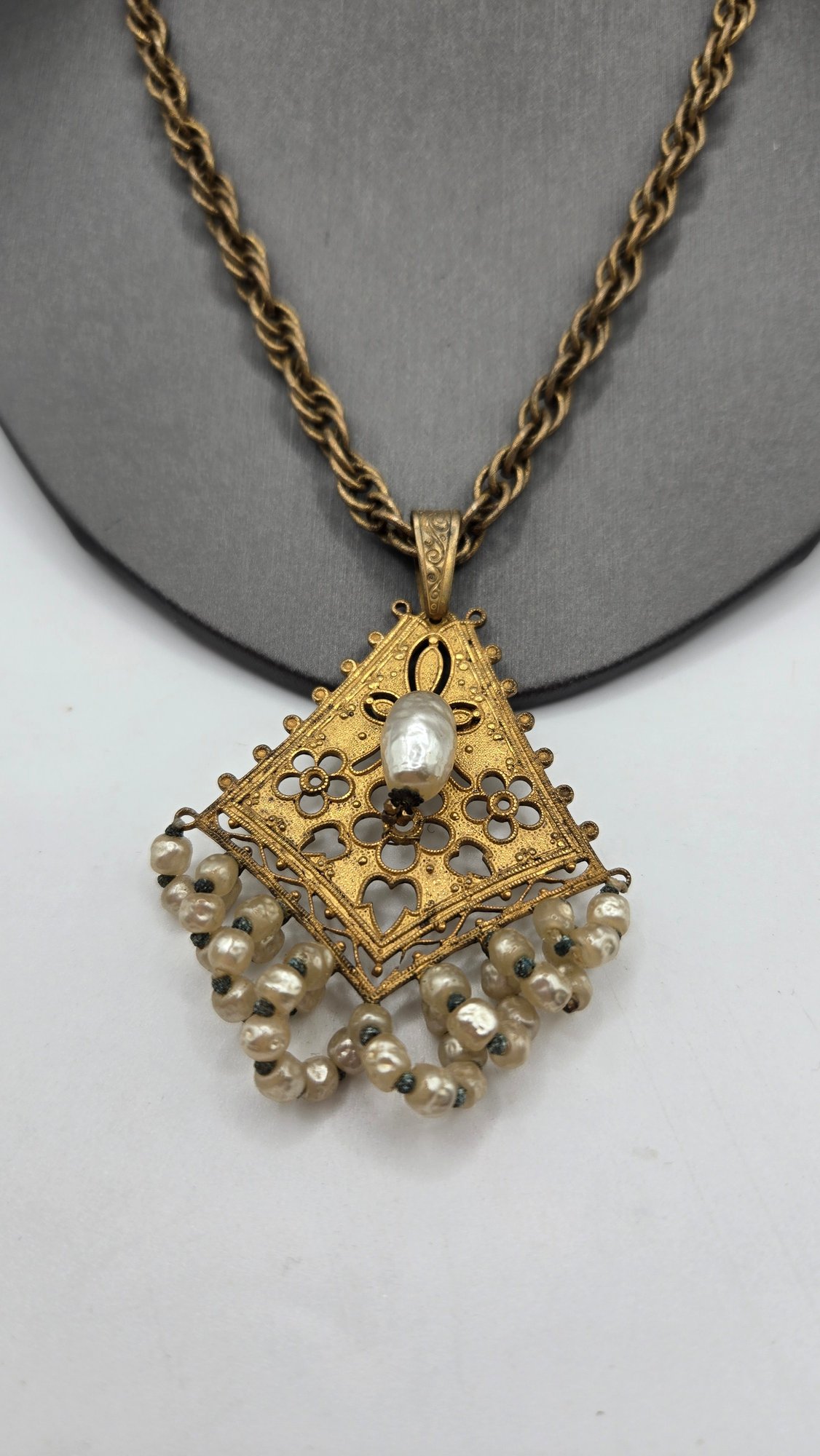 Scrollwork filigree pendant with smaller baroque pearls twisted below