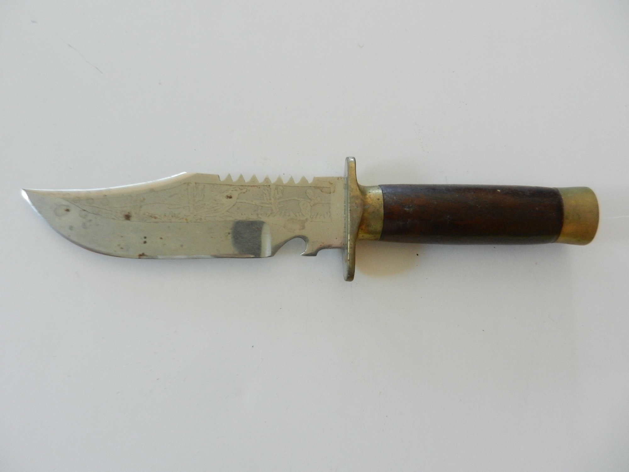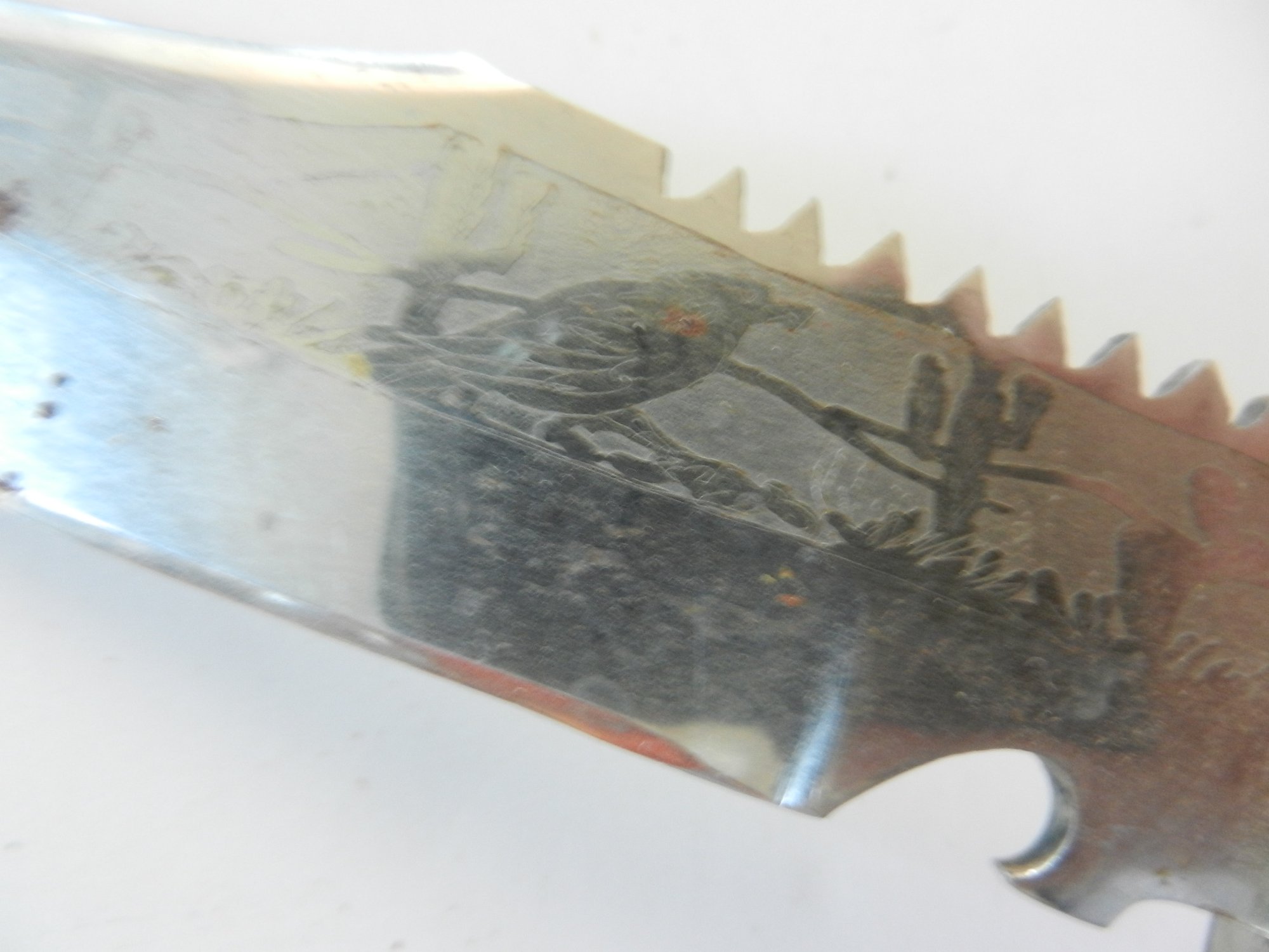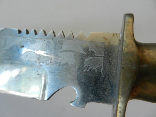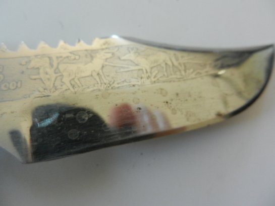 Etched on both sides of the blade. Bird and cacti on one side. Stags on the other. 1X – 28 - 2001.