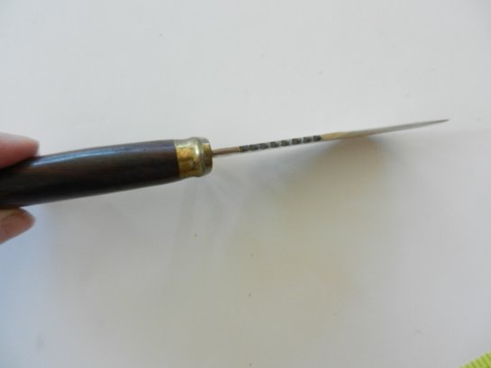 Possibly ebony and colored stone inlaid handle. No nicks in the blade but it needs a bit of a clean.