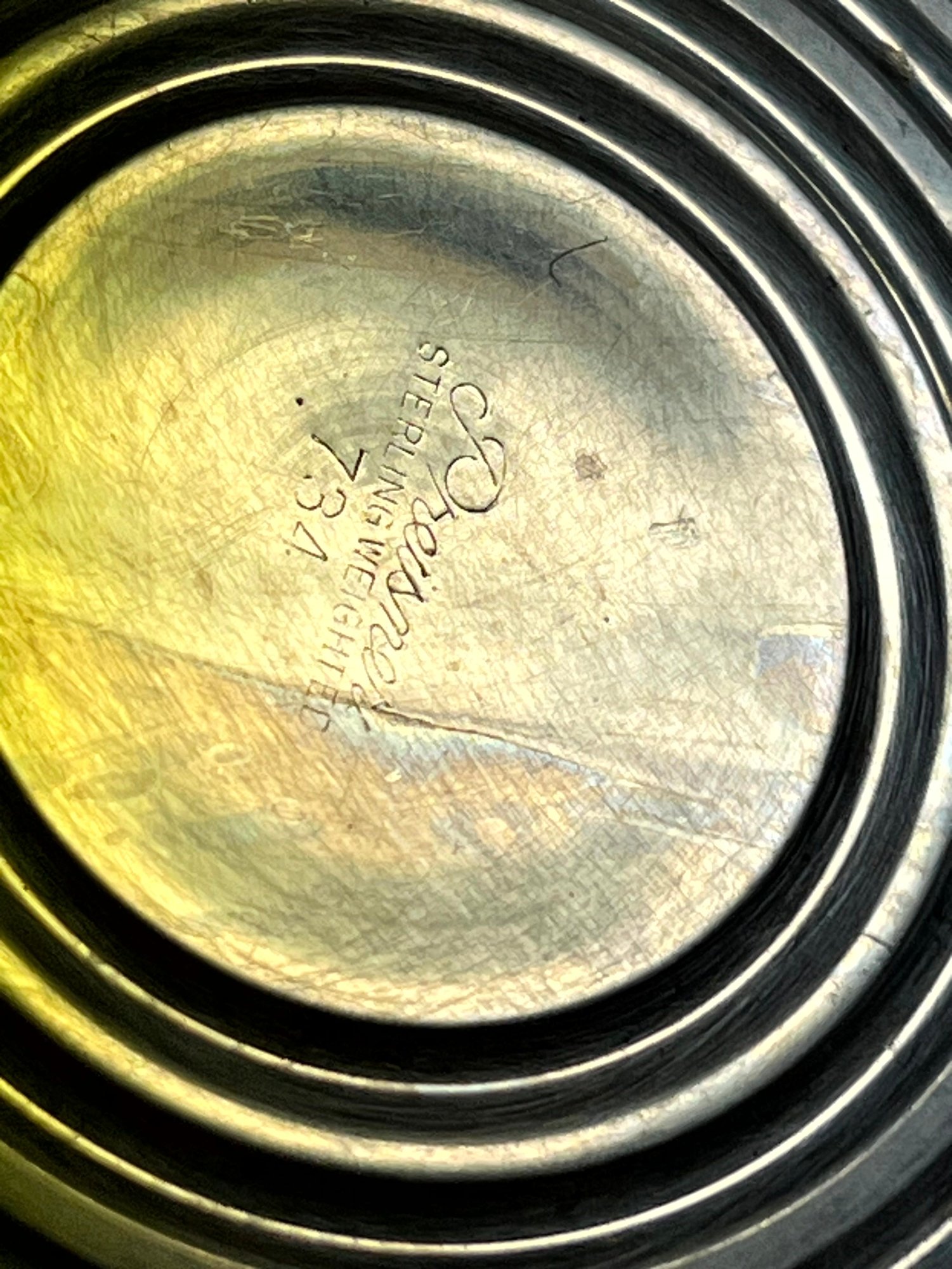 One has a tiny dink under its base. Overall, in good shape. The outer rounded bowls have a few minor dinks but it’s hard to see them against the patina.