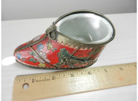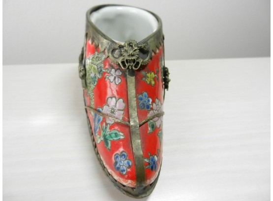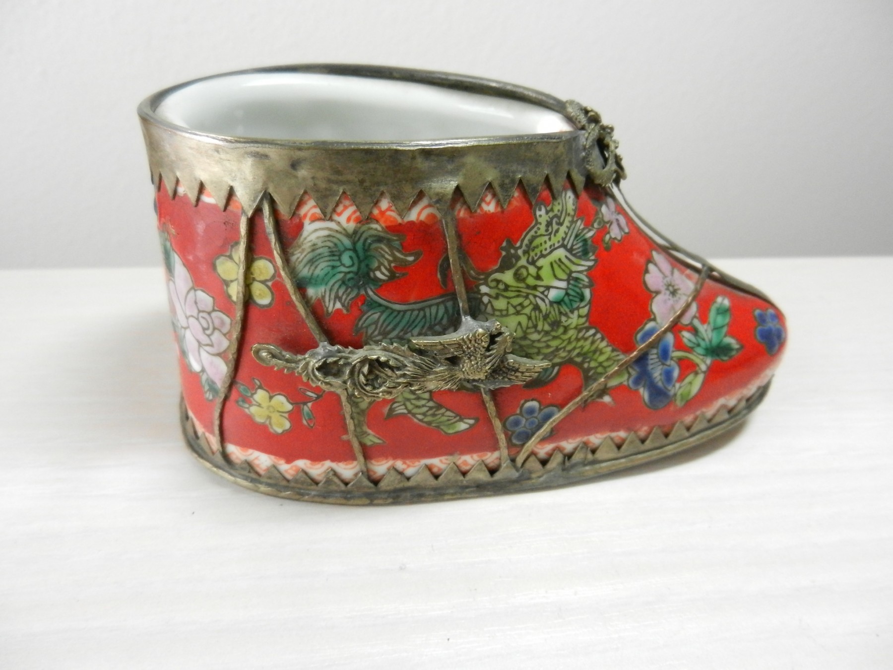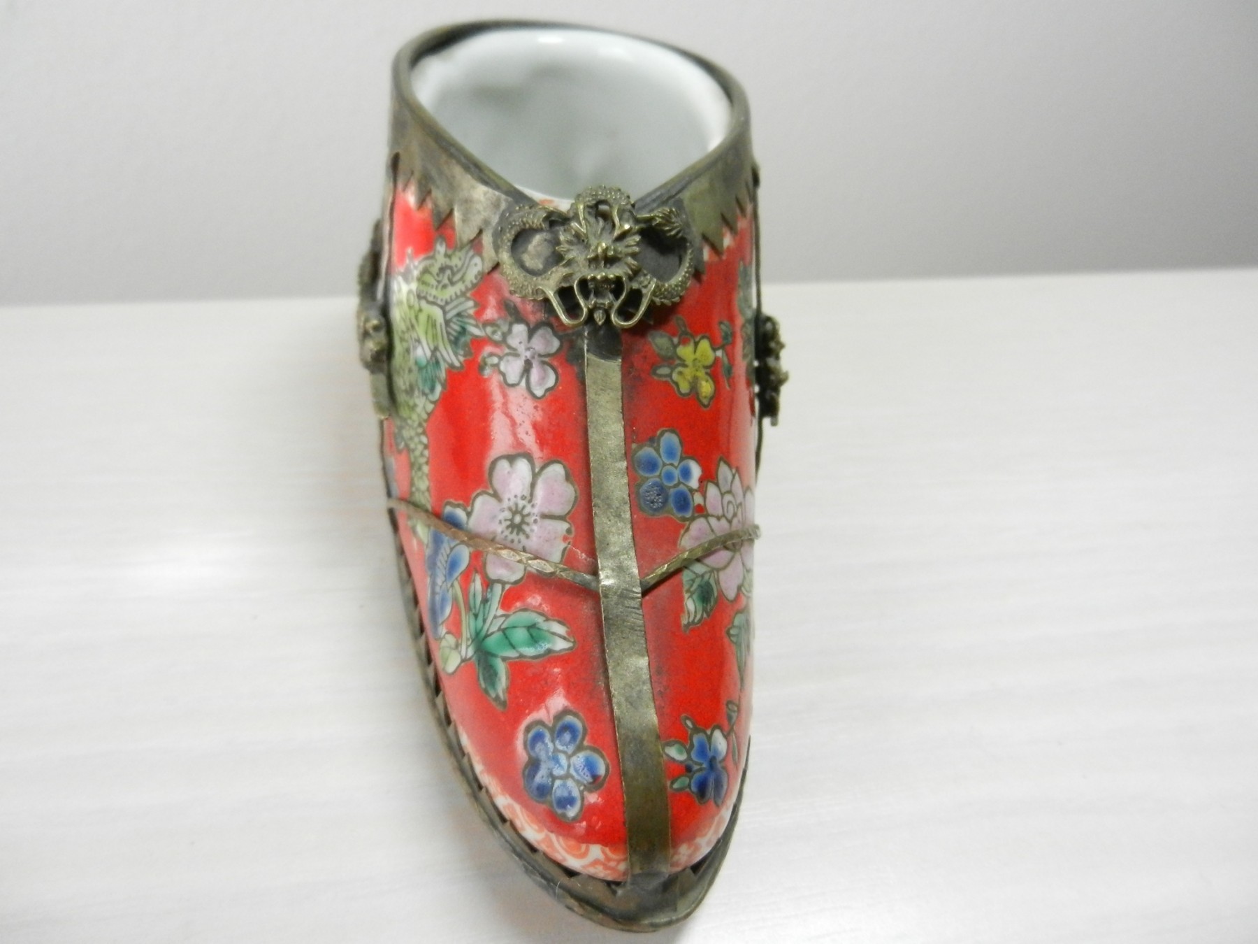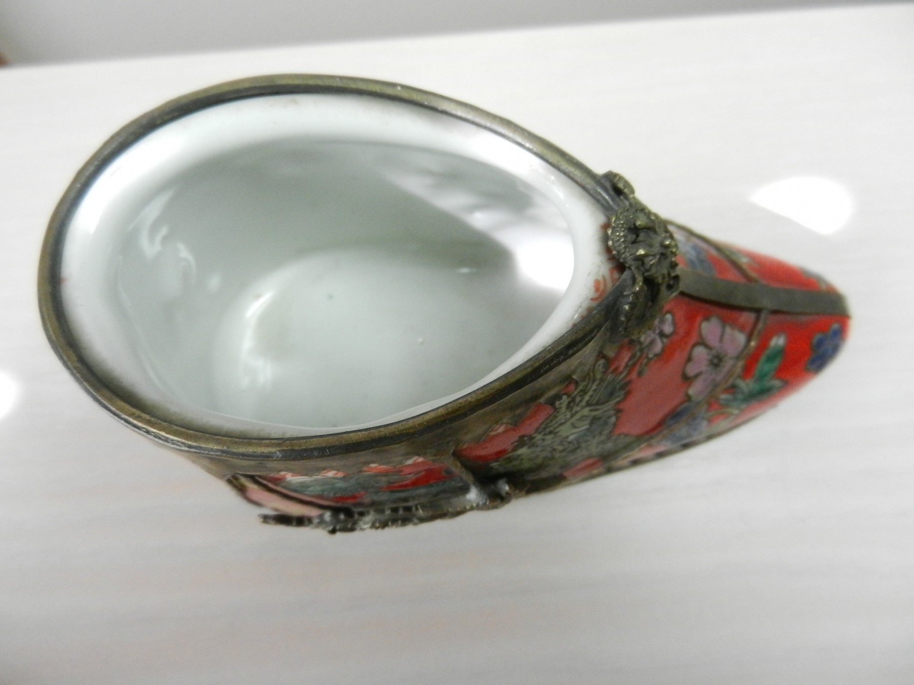 Vintage red porcelain and metal cage lotus shoe - maker’s mark (DP71)