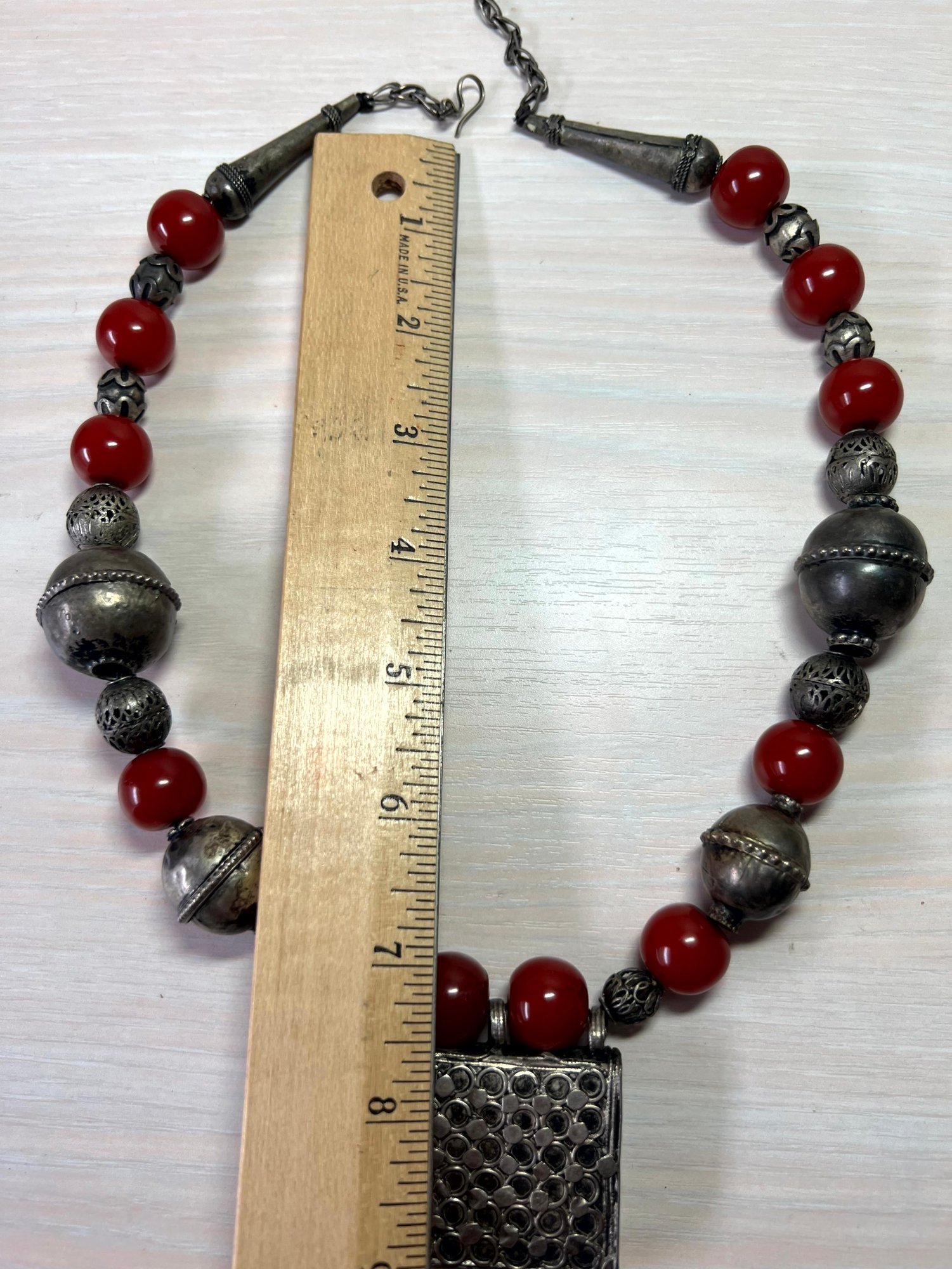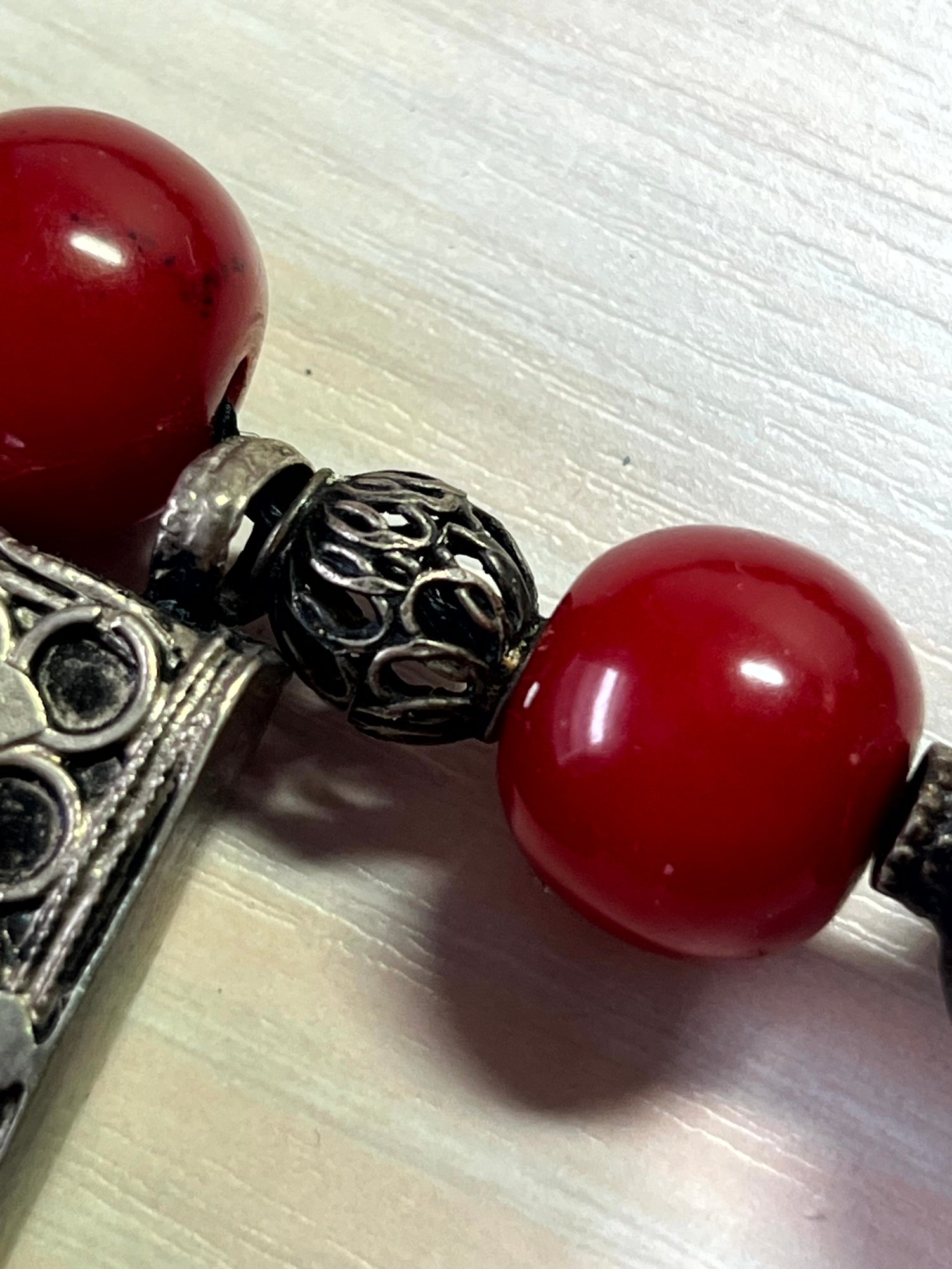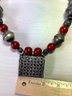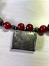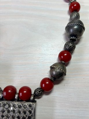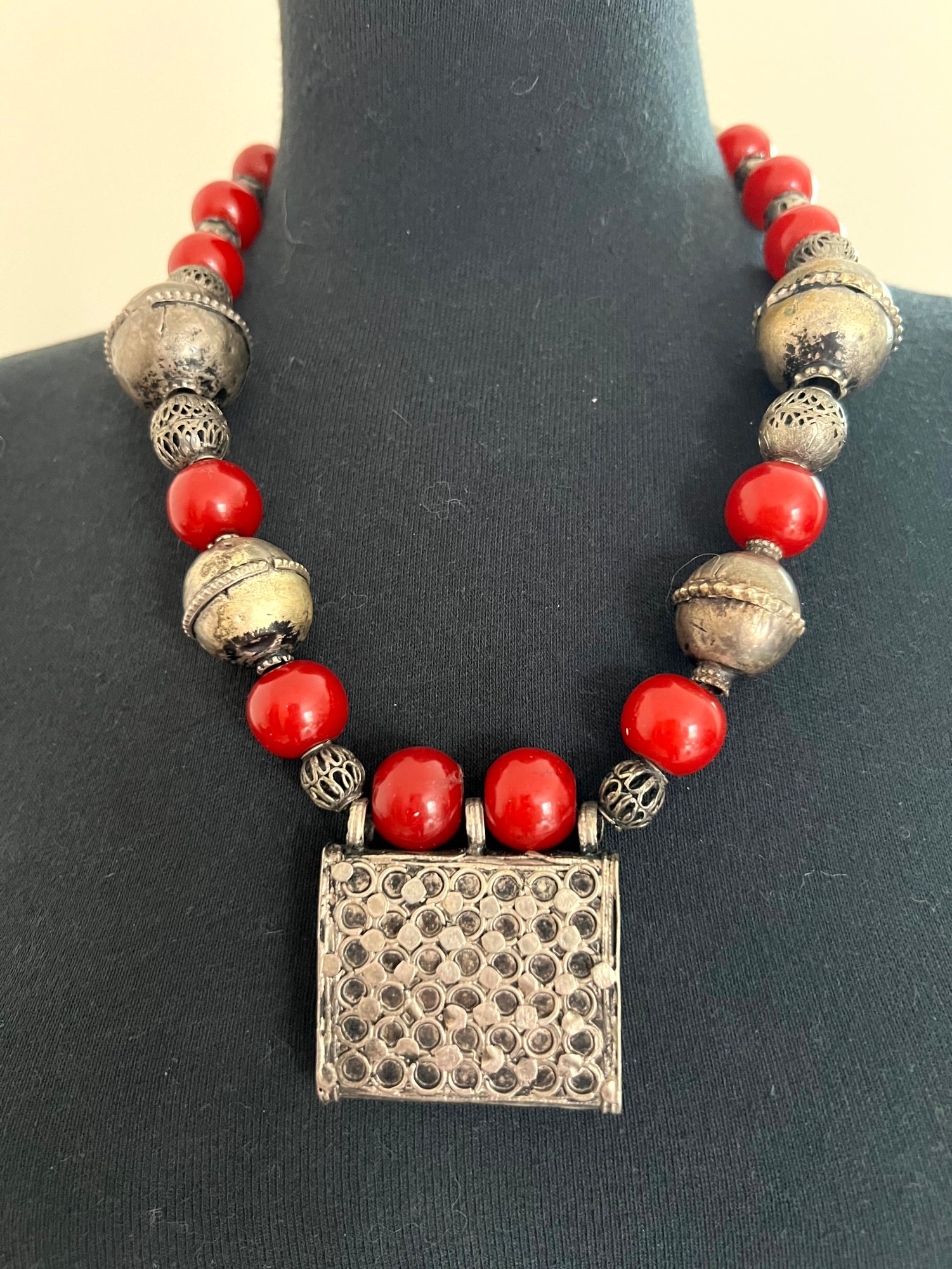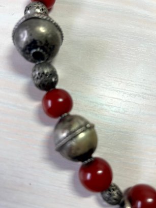Fabulous piece. Large 800 silver metal beads interspersed with dark red ones. The pic against the dark mannequin makes the red too bright. It is a darker red, like the other images.