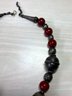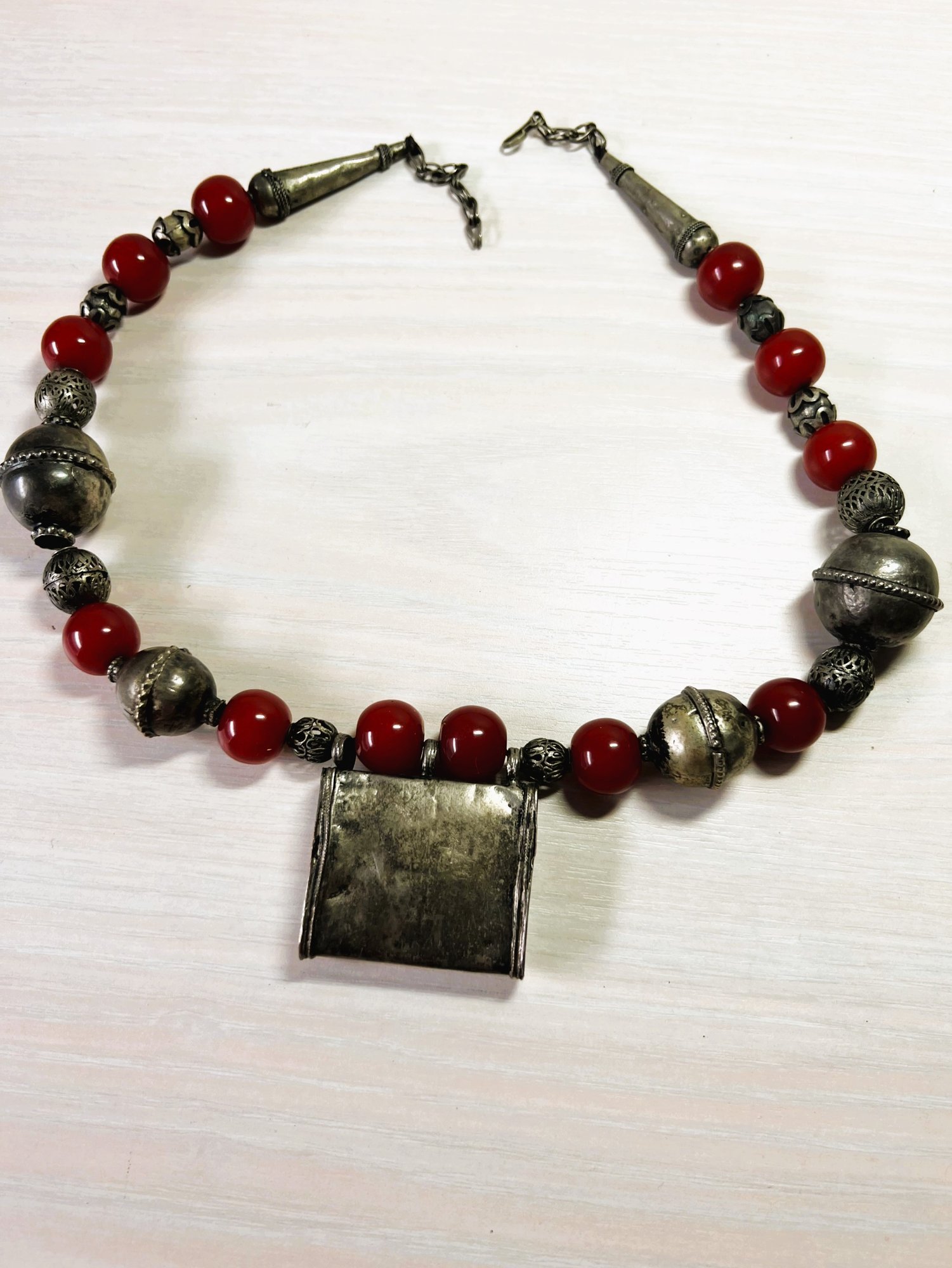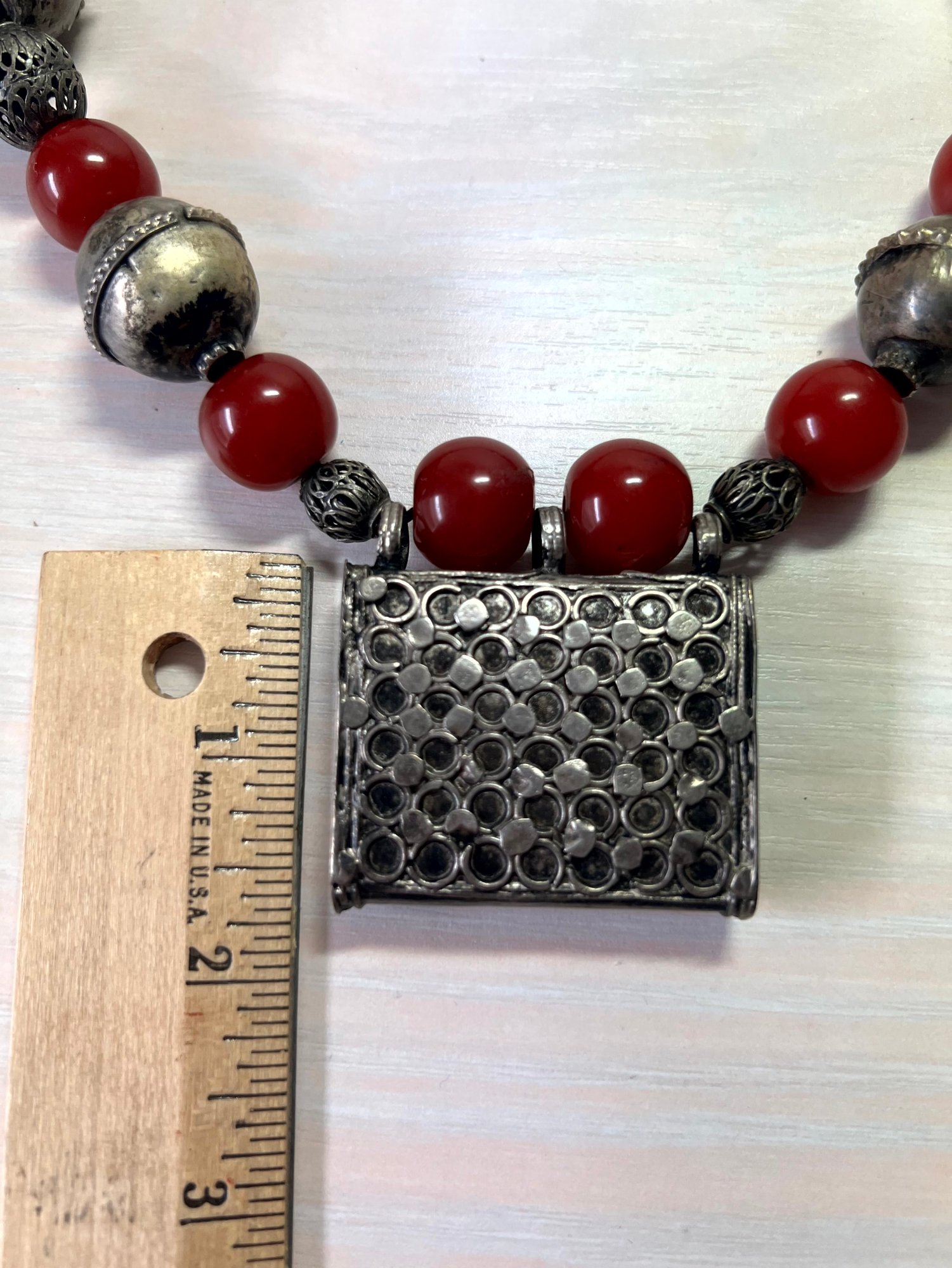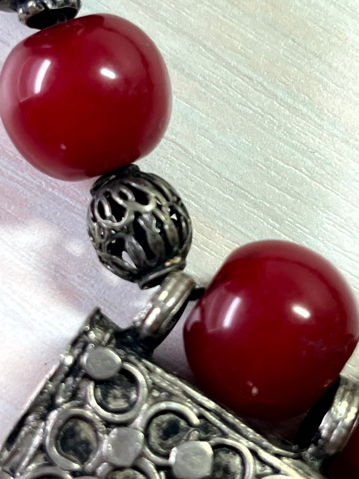 Fabulous piece. Large 800 silver metal beads interspersed with dark red ones. The pic against the dark mannequin makes the red too bright. It is a darker red, like the other images.
