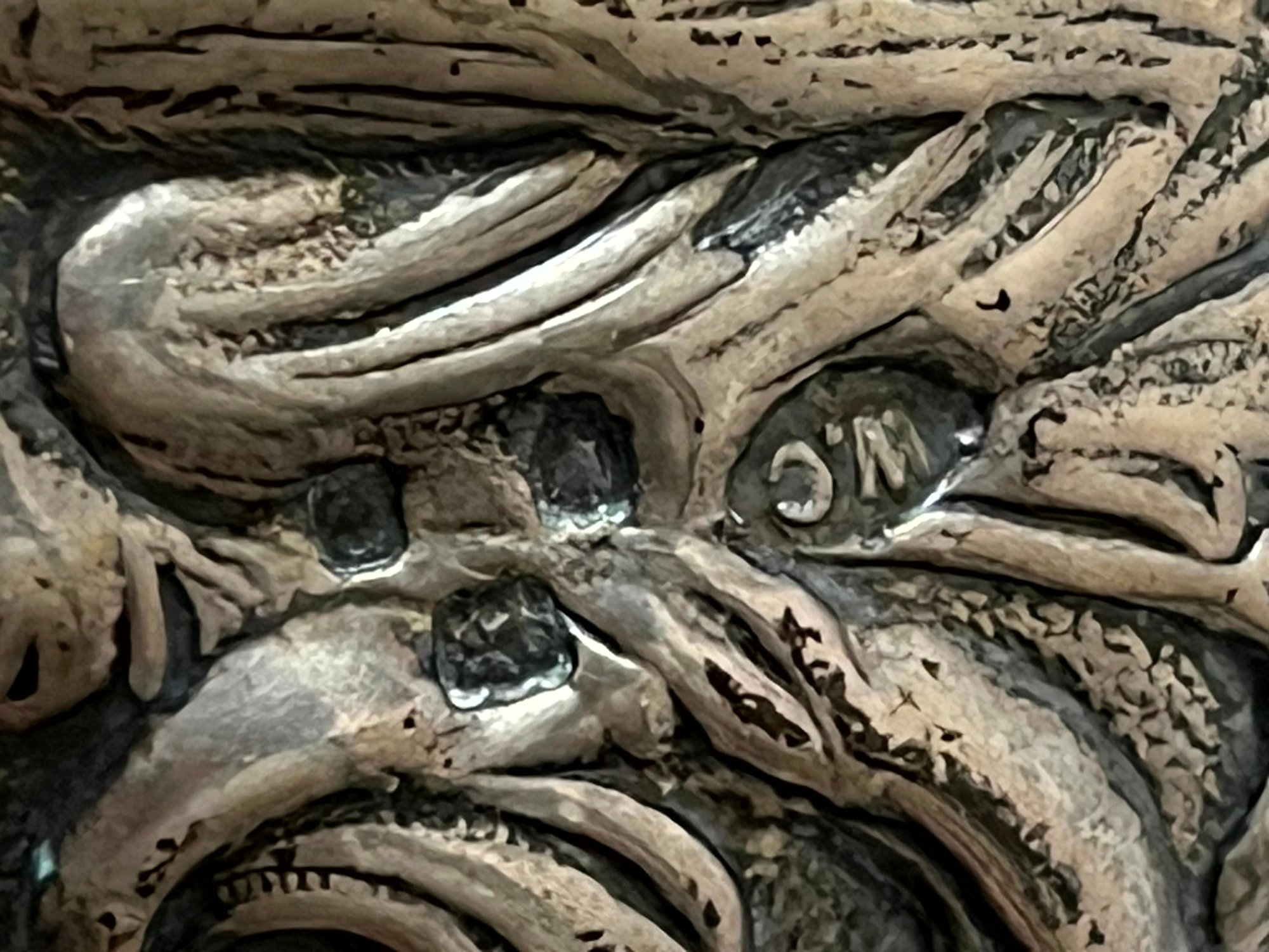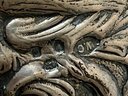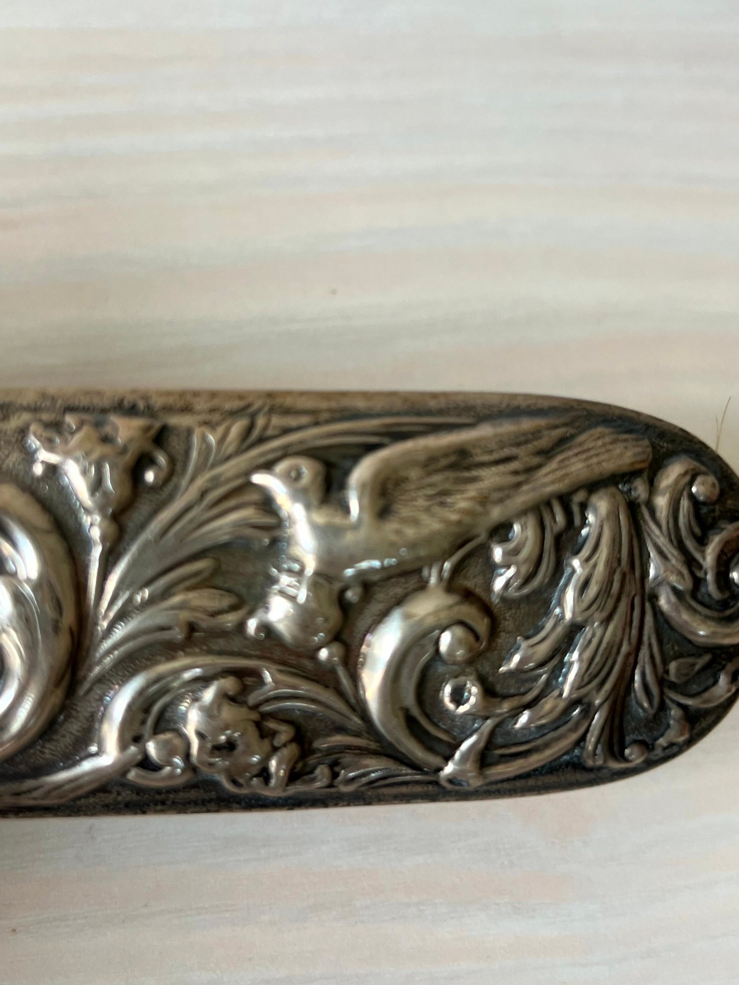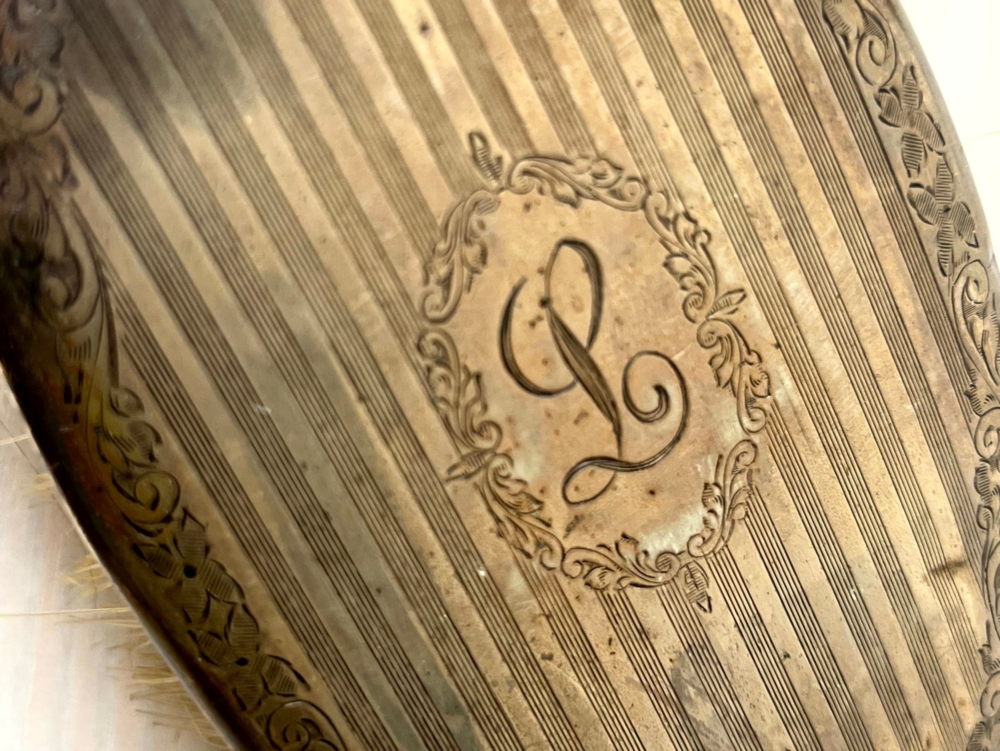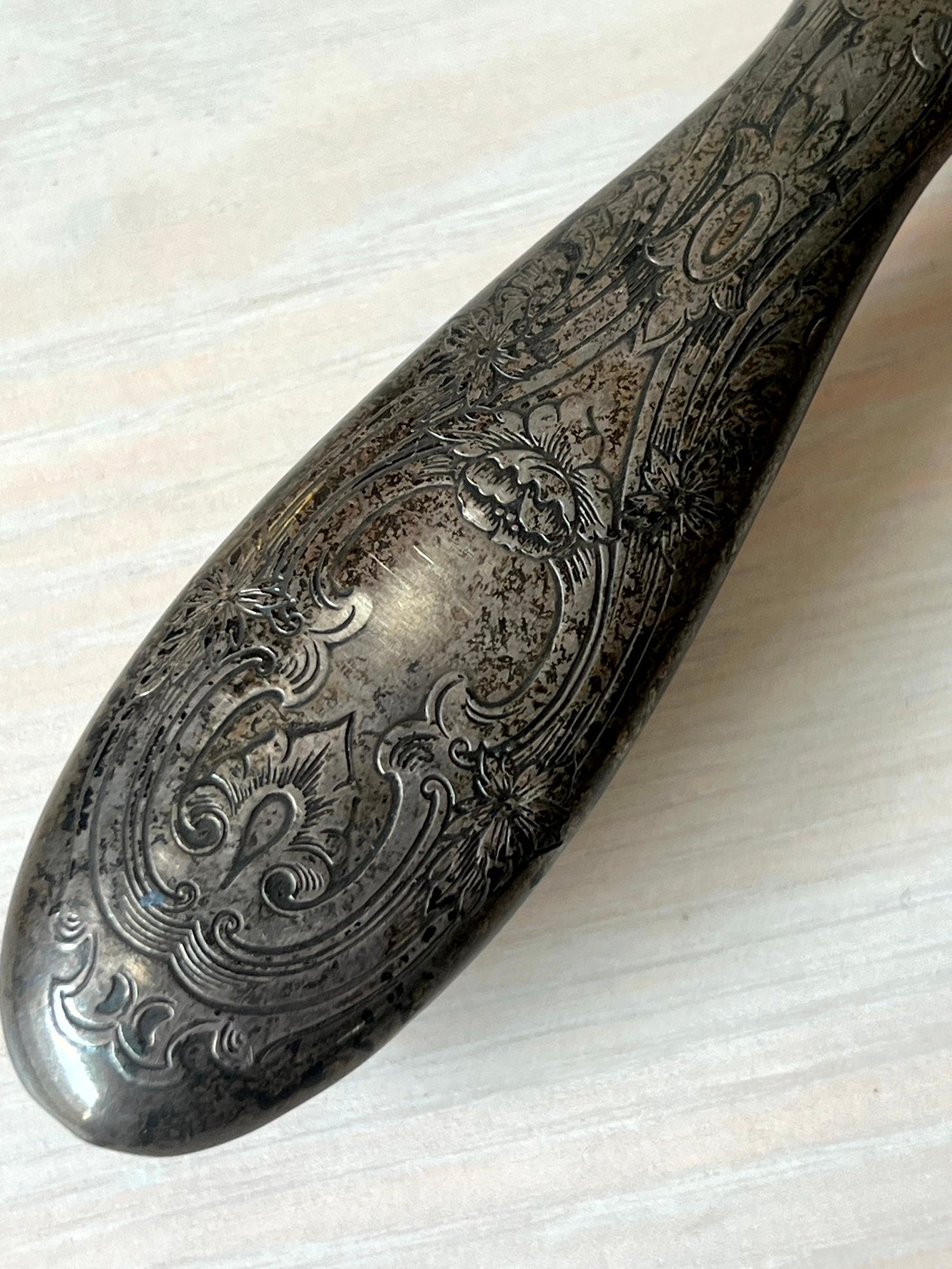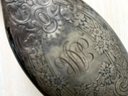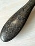 One handle with linear design has a shield, Anchor, Lion with a letter I can’t make out. There are a few dents in this.