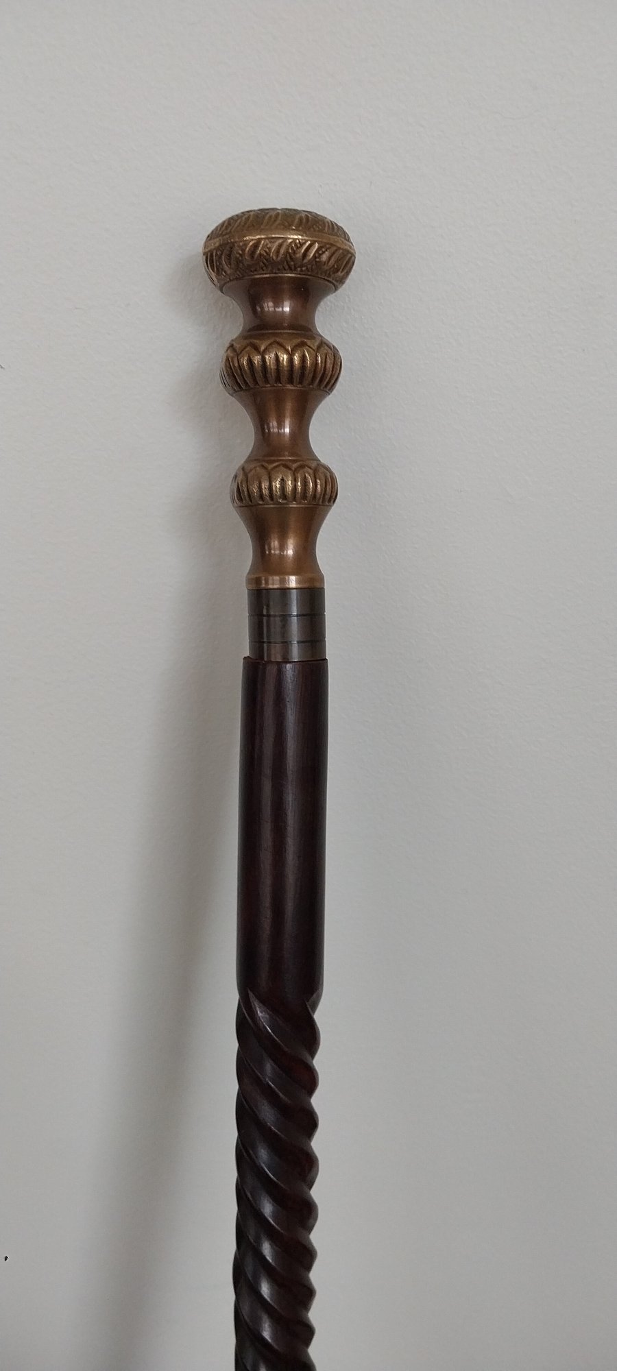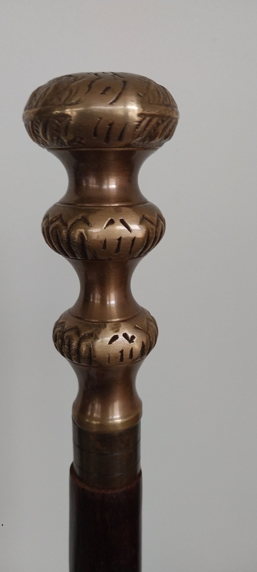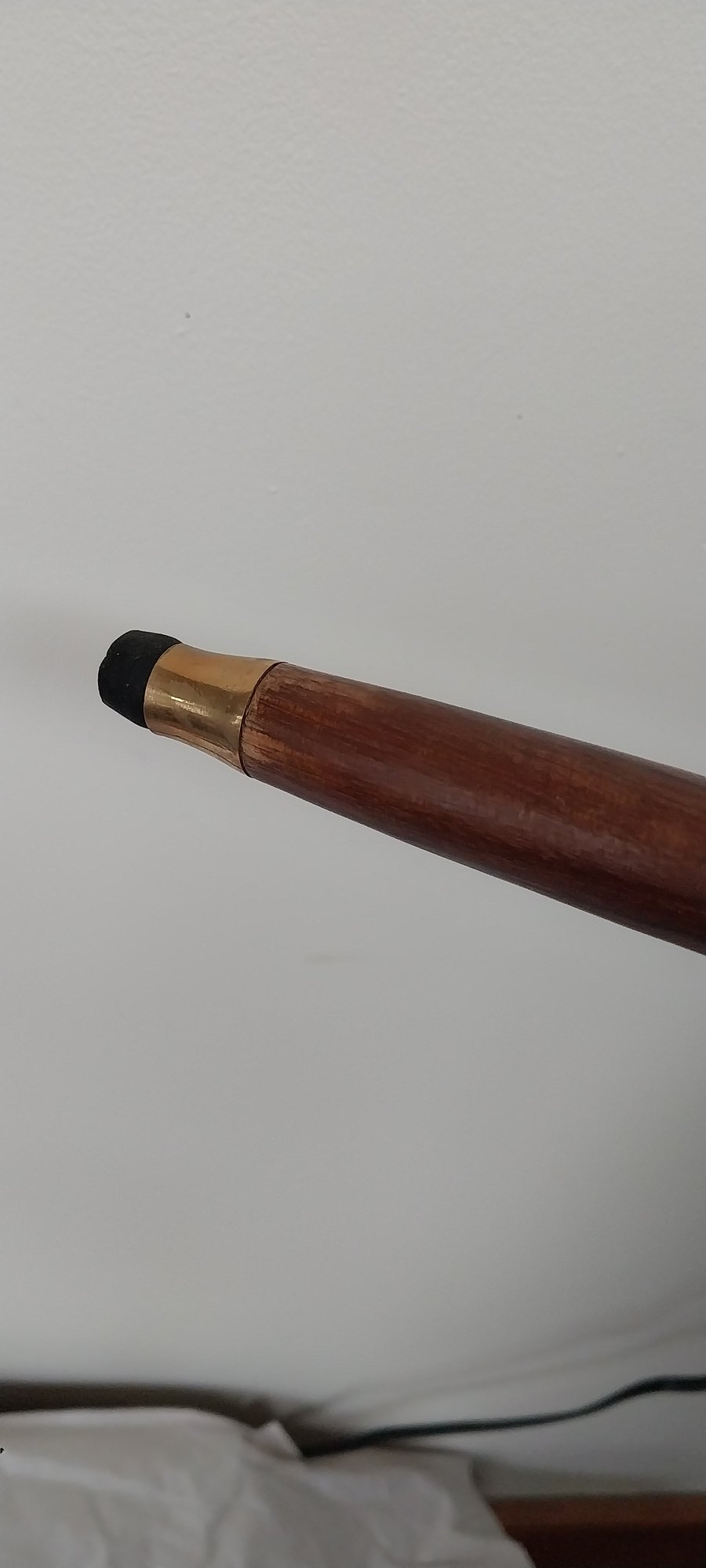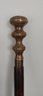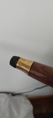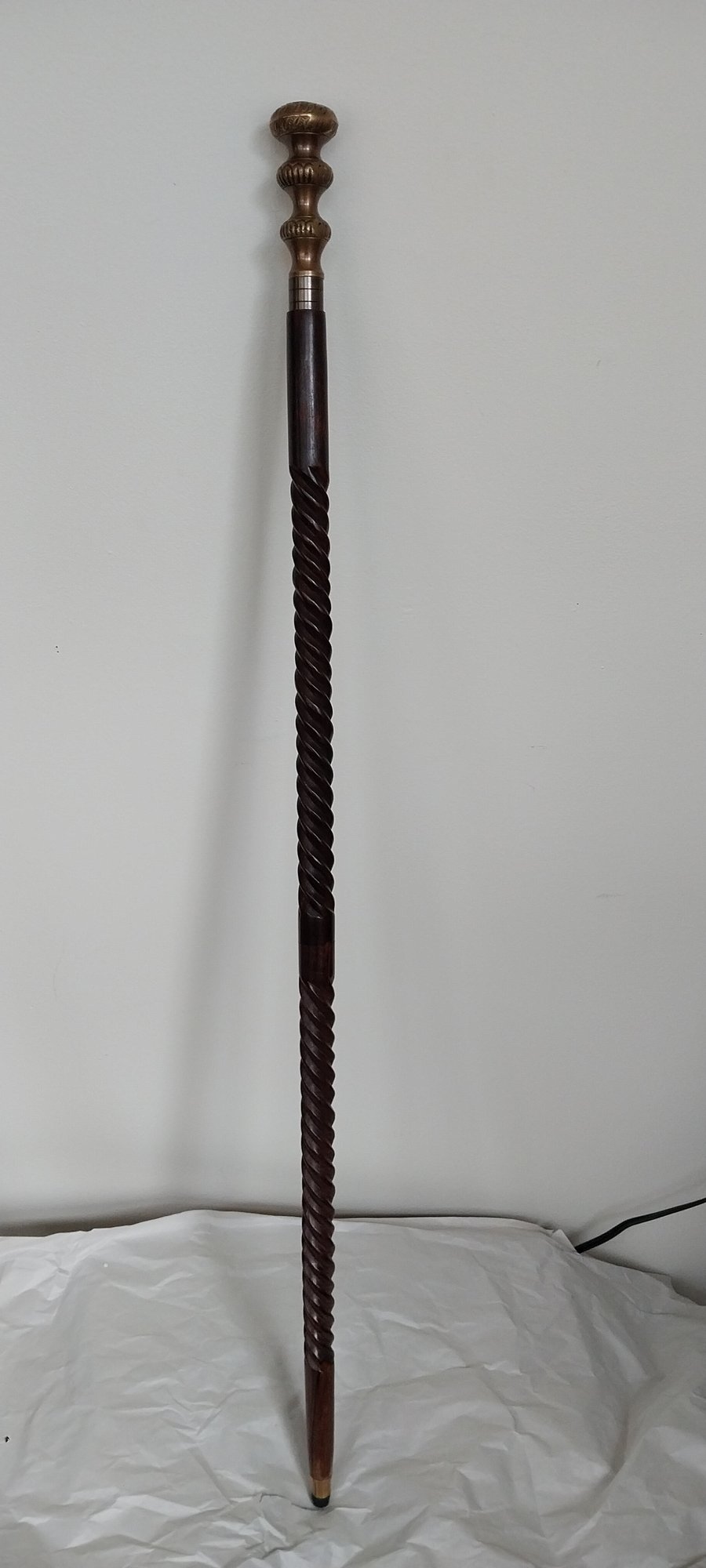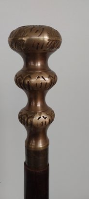 Vintage walking stick with brass handle and tip. 39" long made of turned wood that appears to be in two pieces