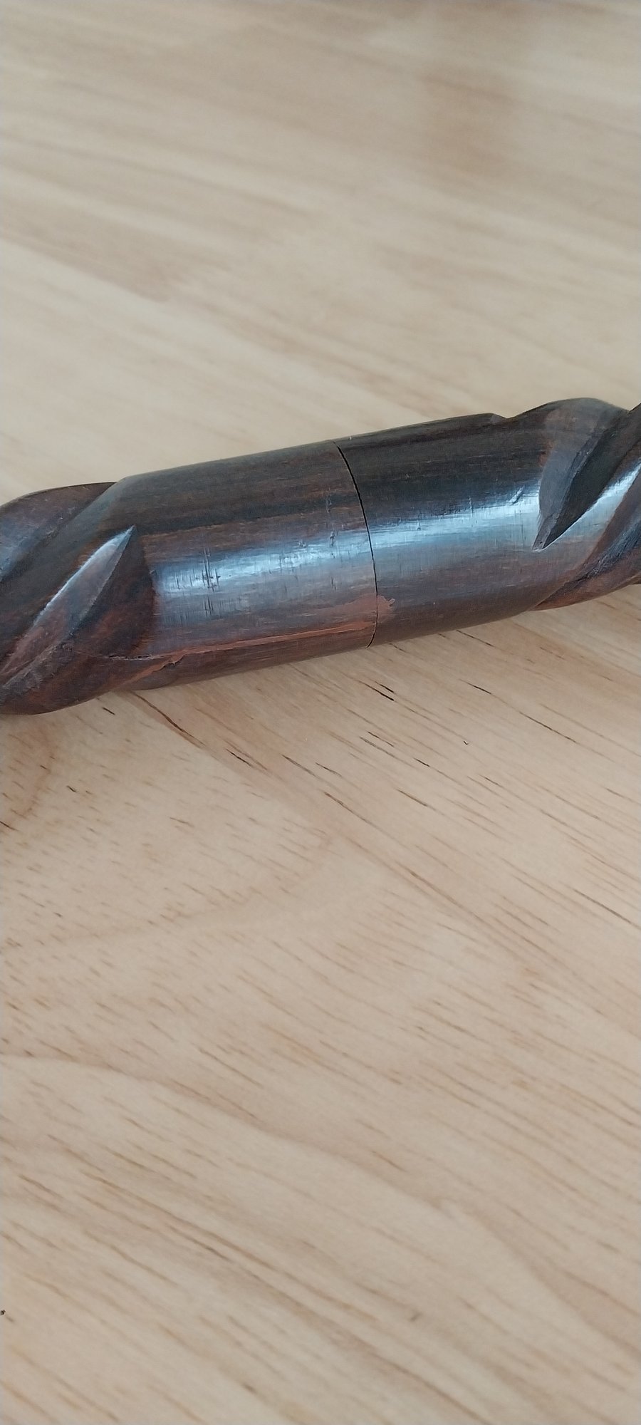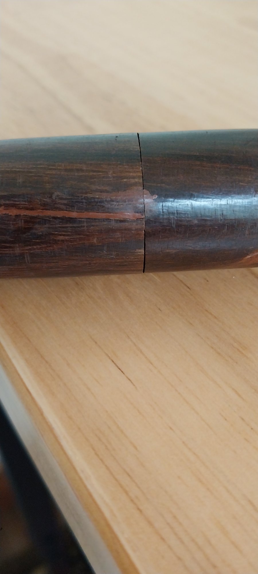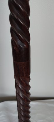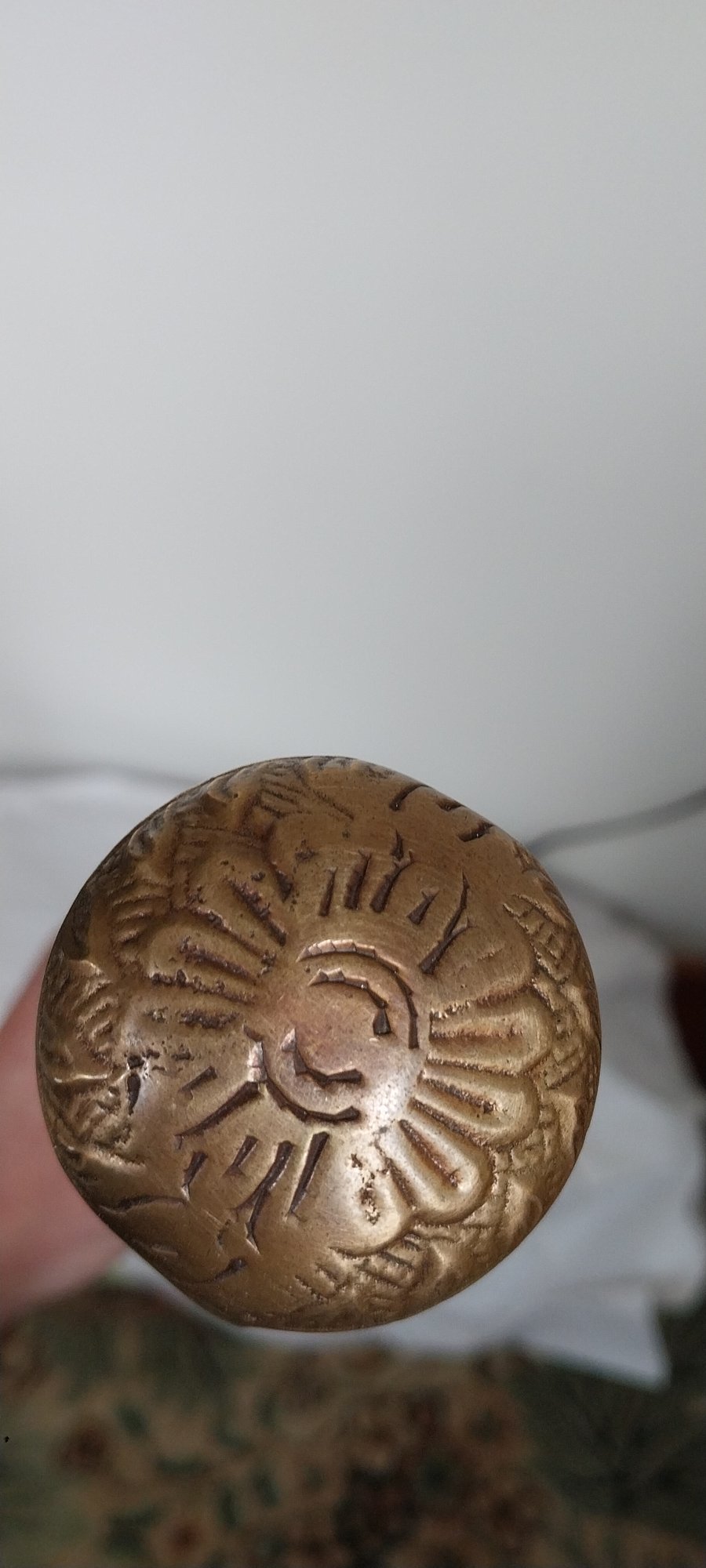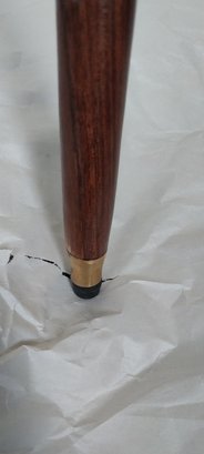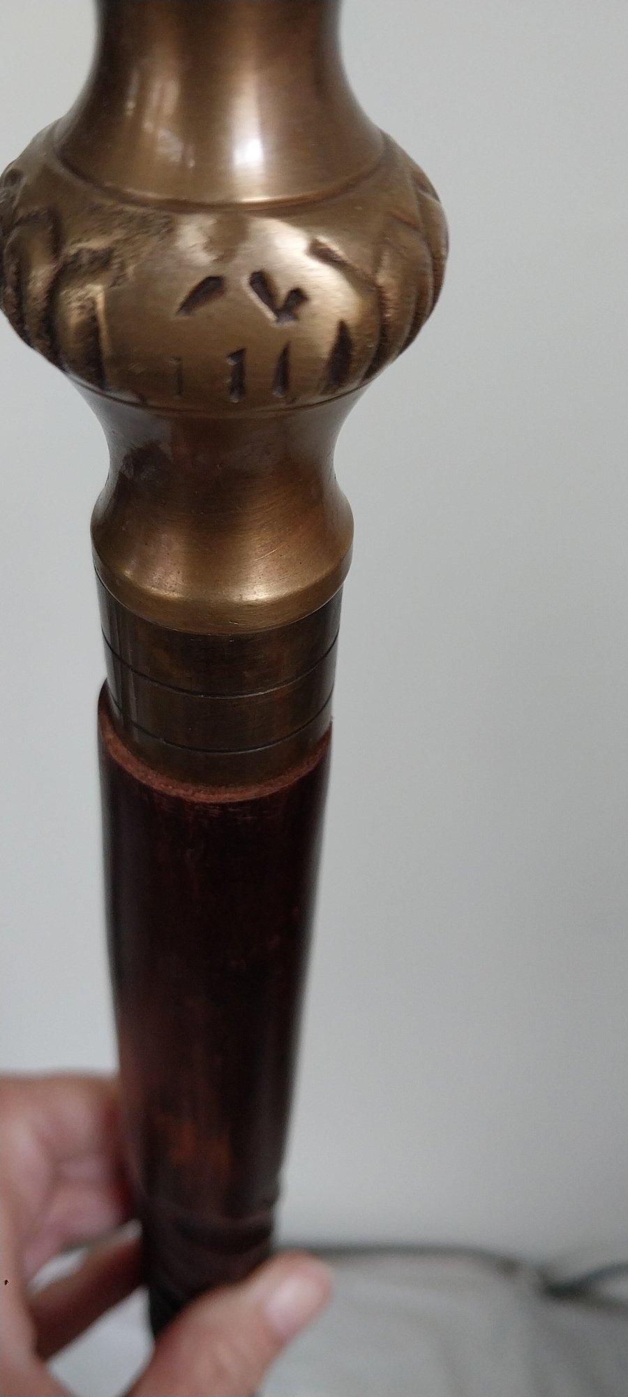 Vintage walking stick with brass handle and tip. 39" long made of turned wood that appears to be in two pieces