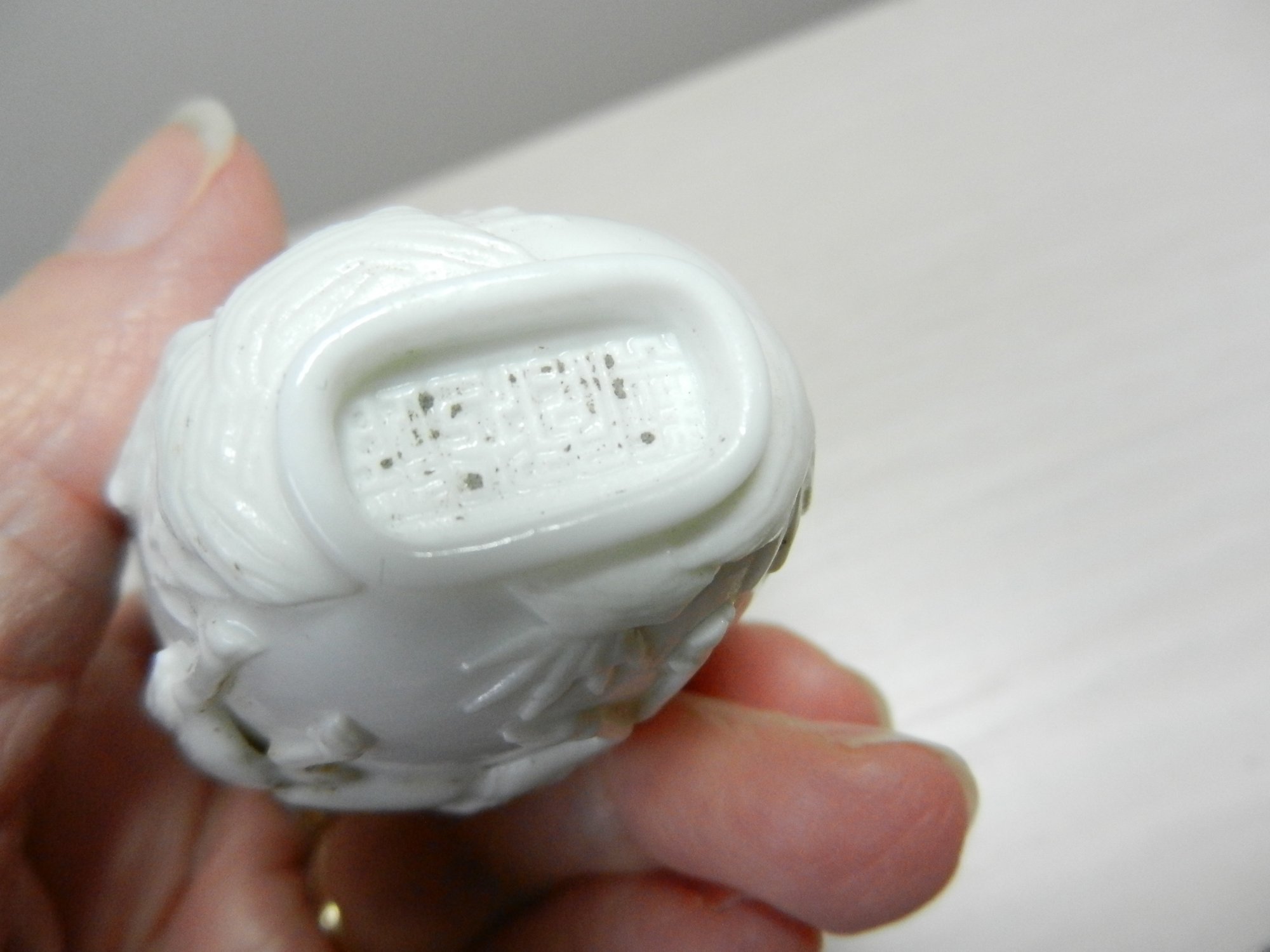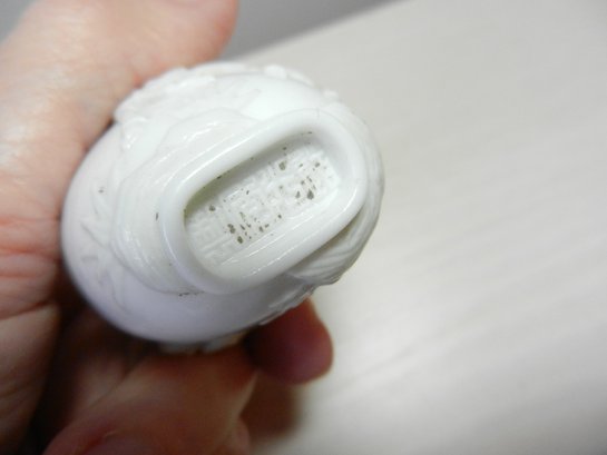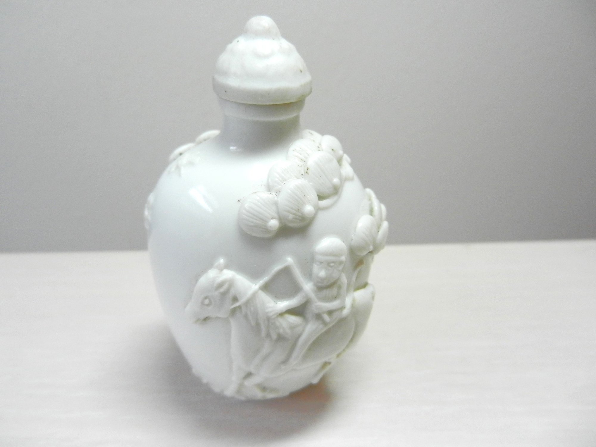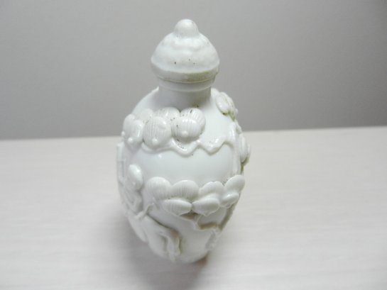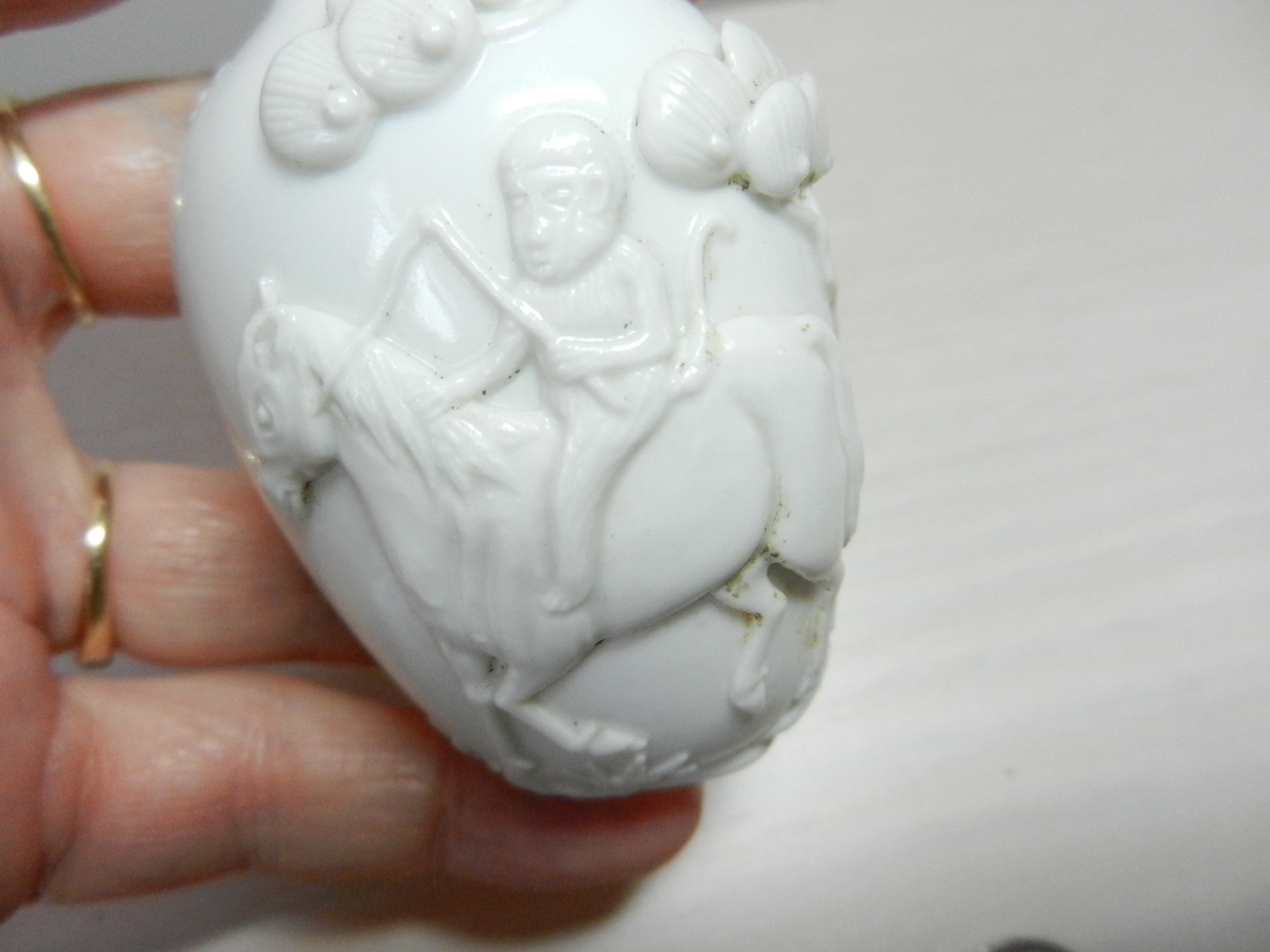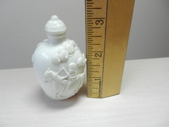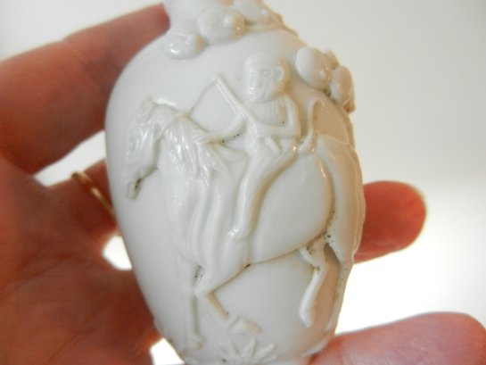 Vintage white snuff bottle with raised monkey on horse and base mark (DP28)