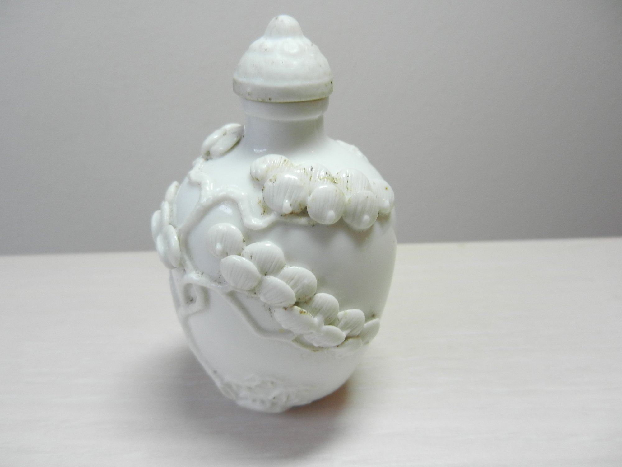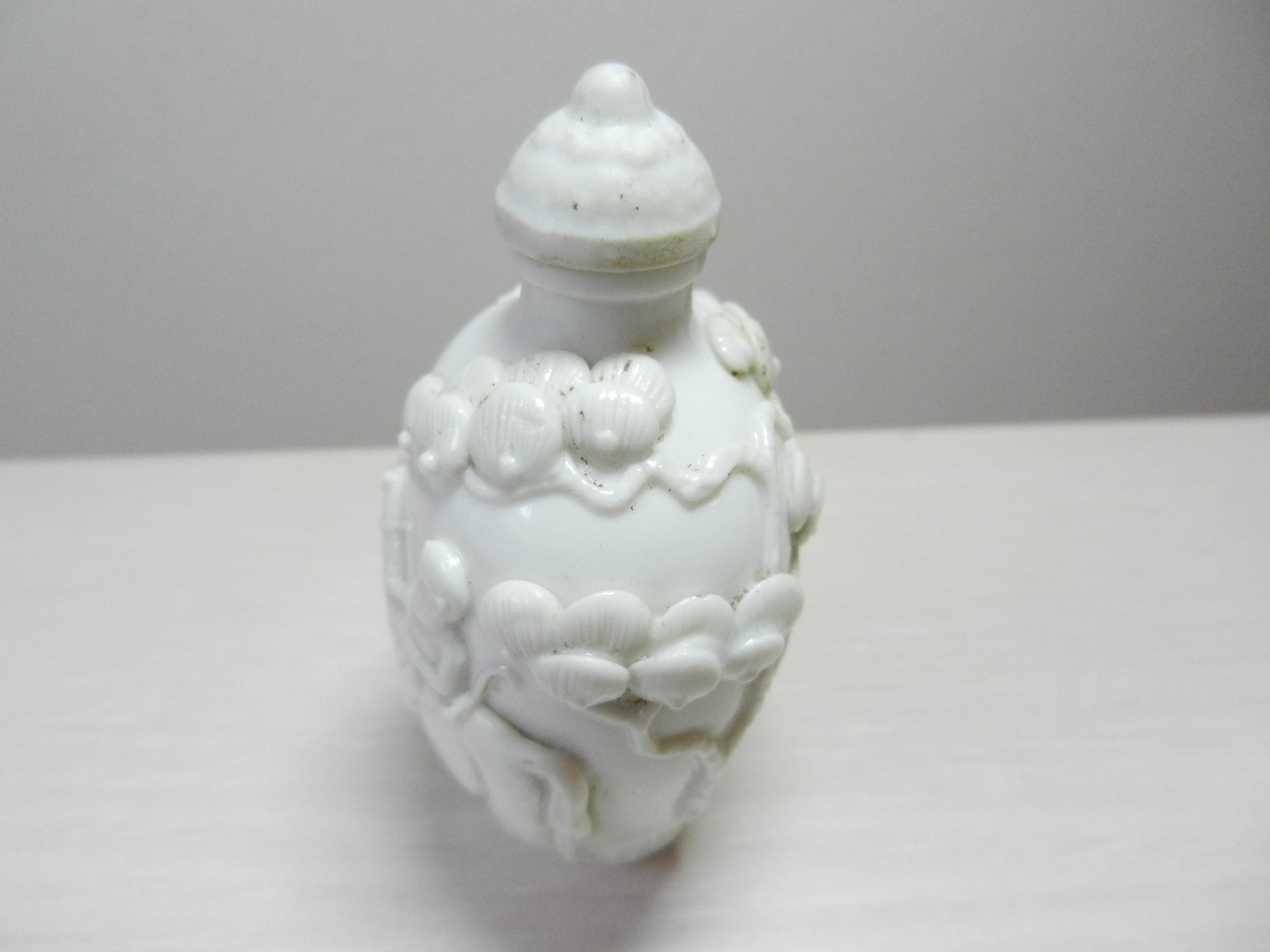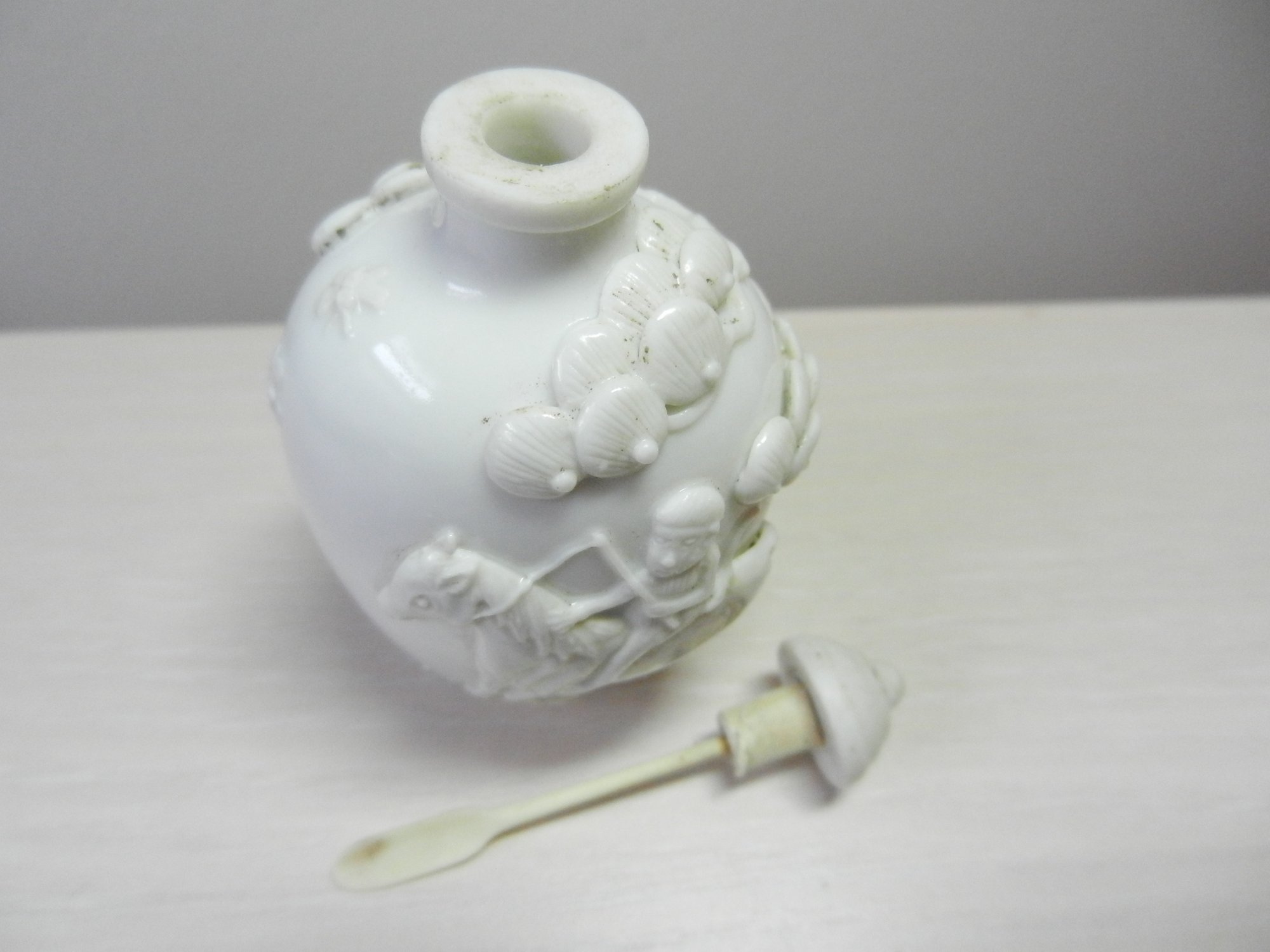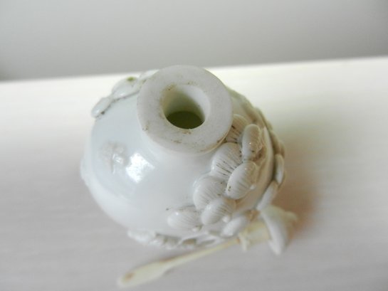 Vintage white snuff bottle with raised monkey on horse and base mark (DP28)