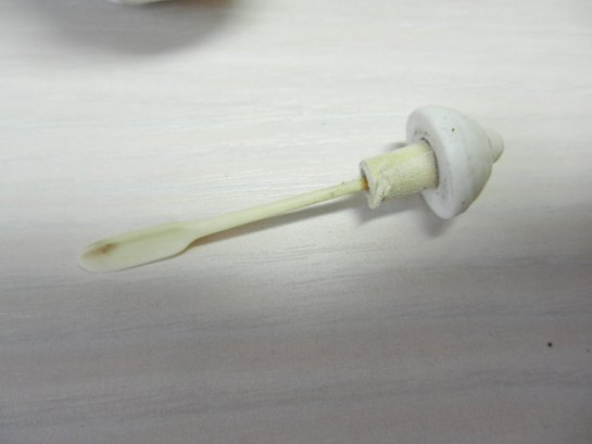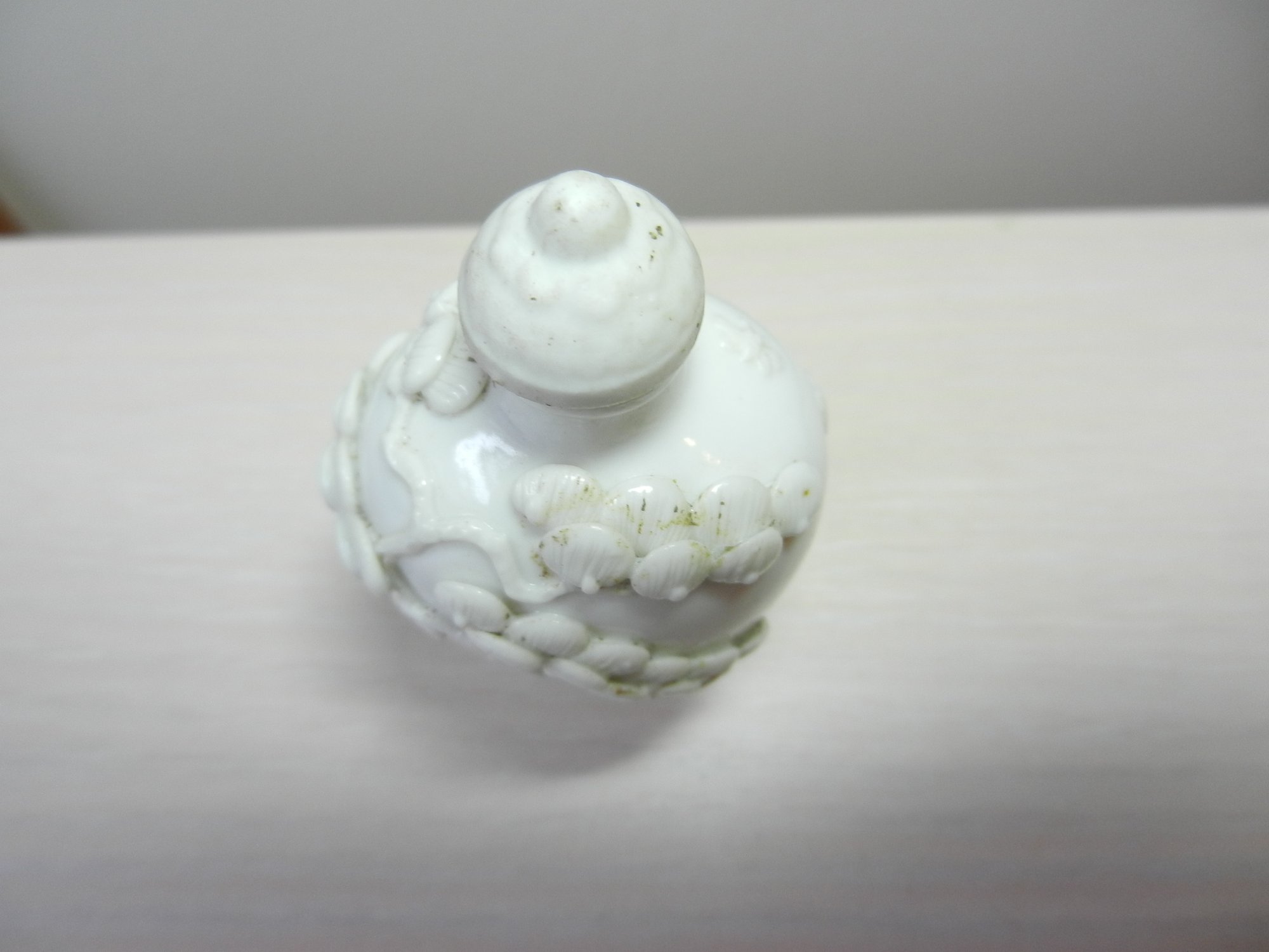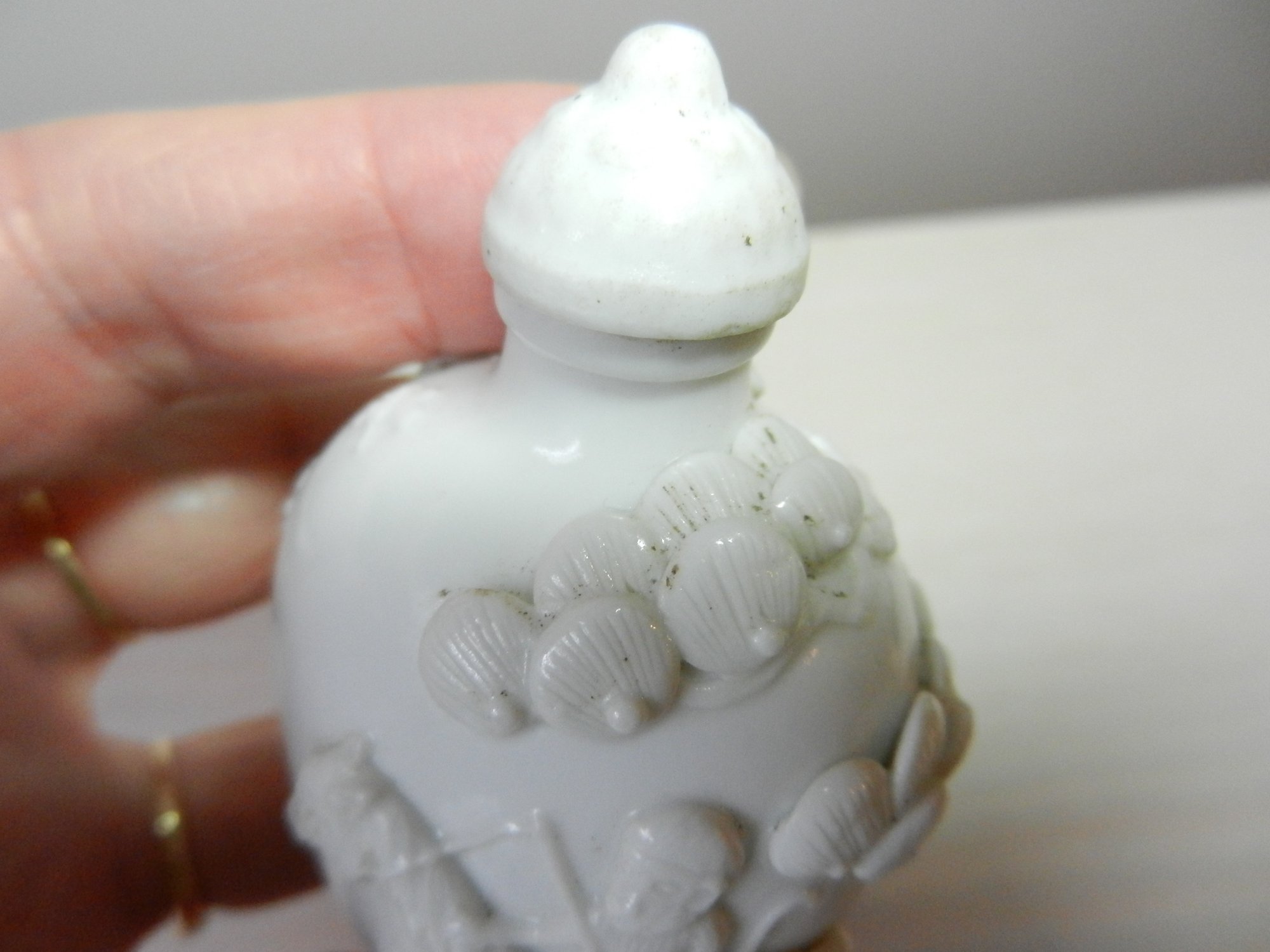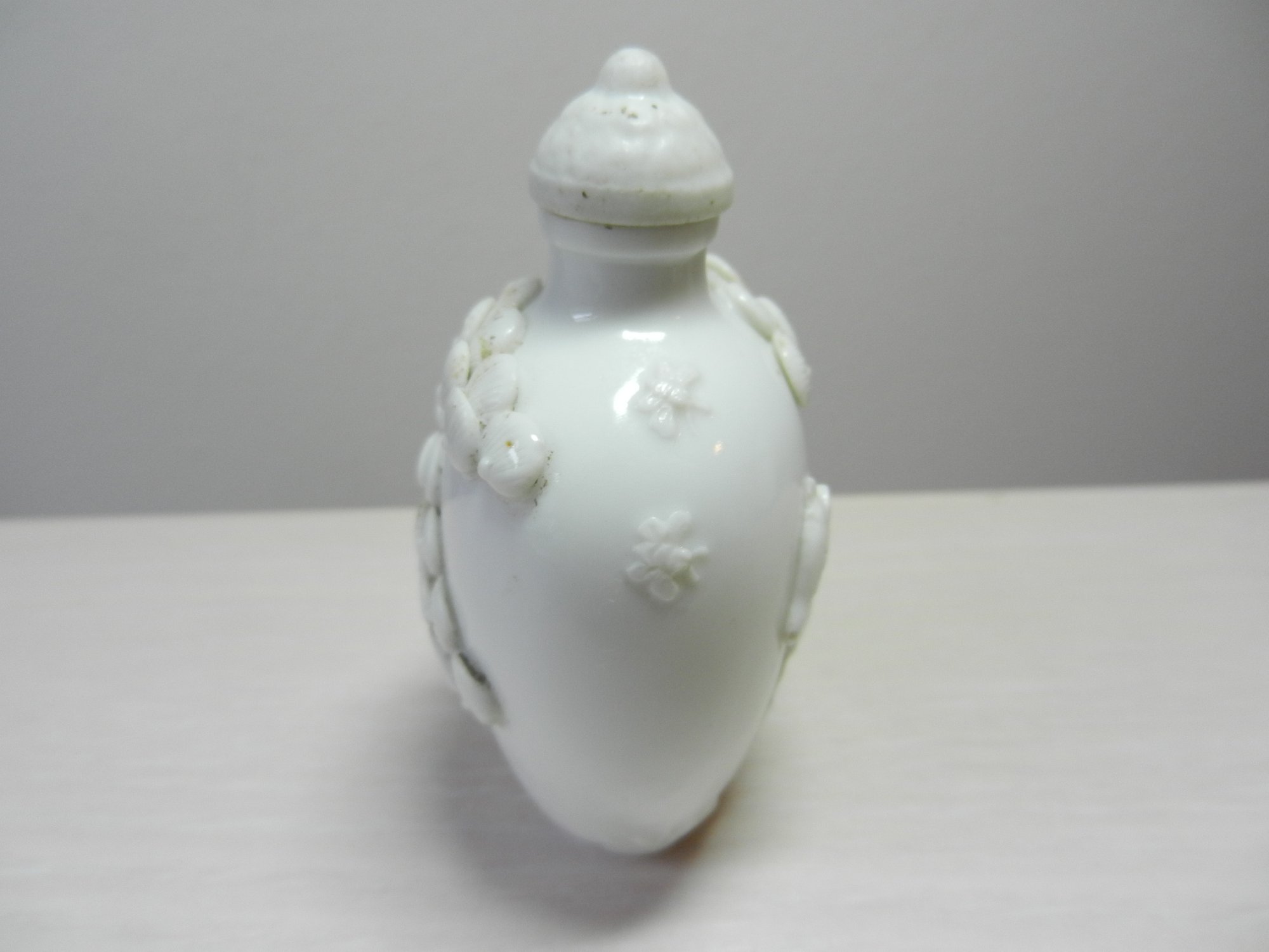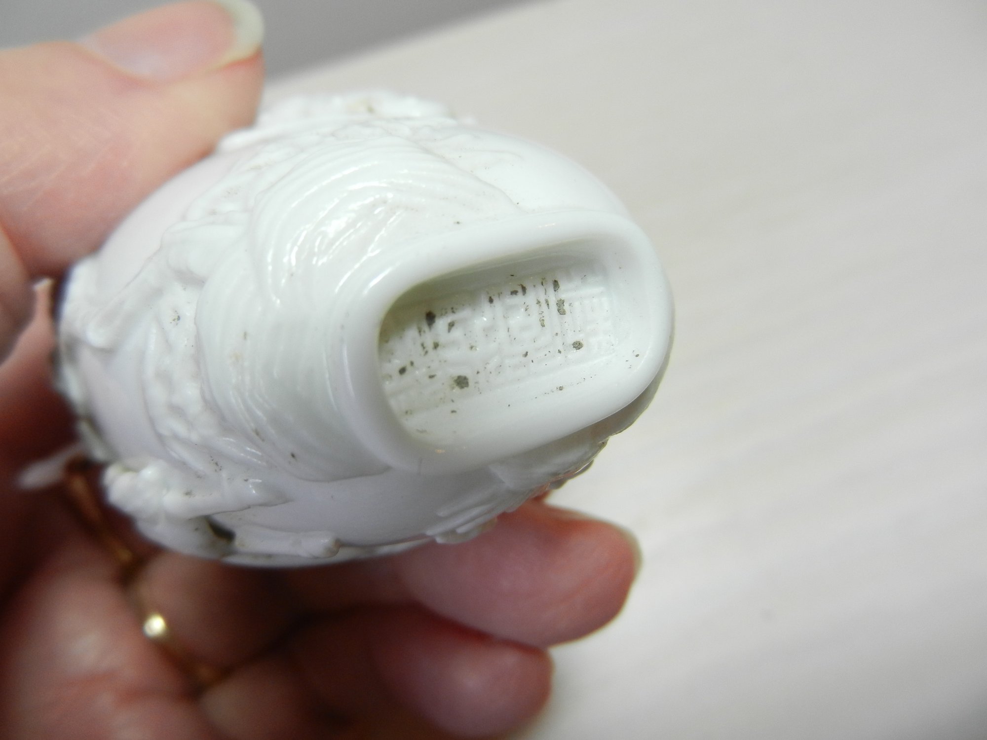 Vintage white snuff bottle with raised monkey on horse and base mark (DP28)
