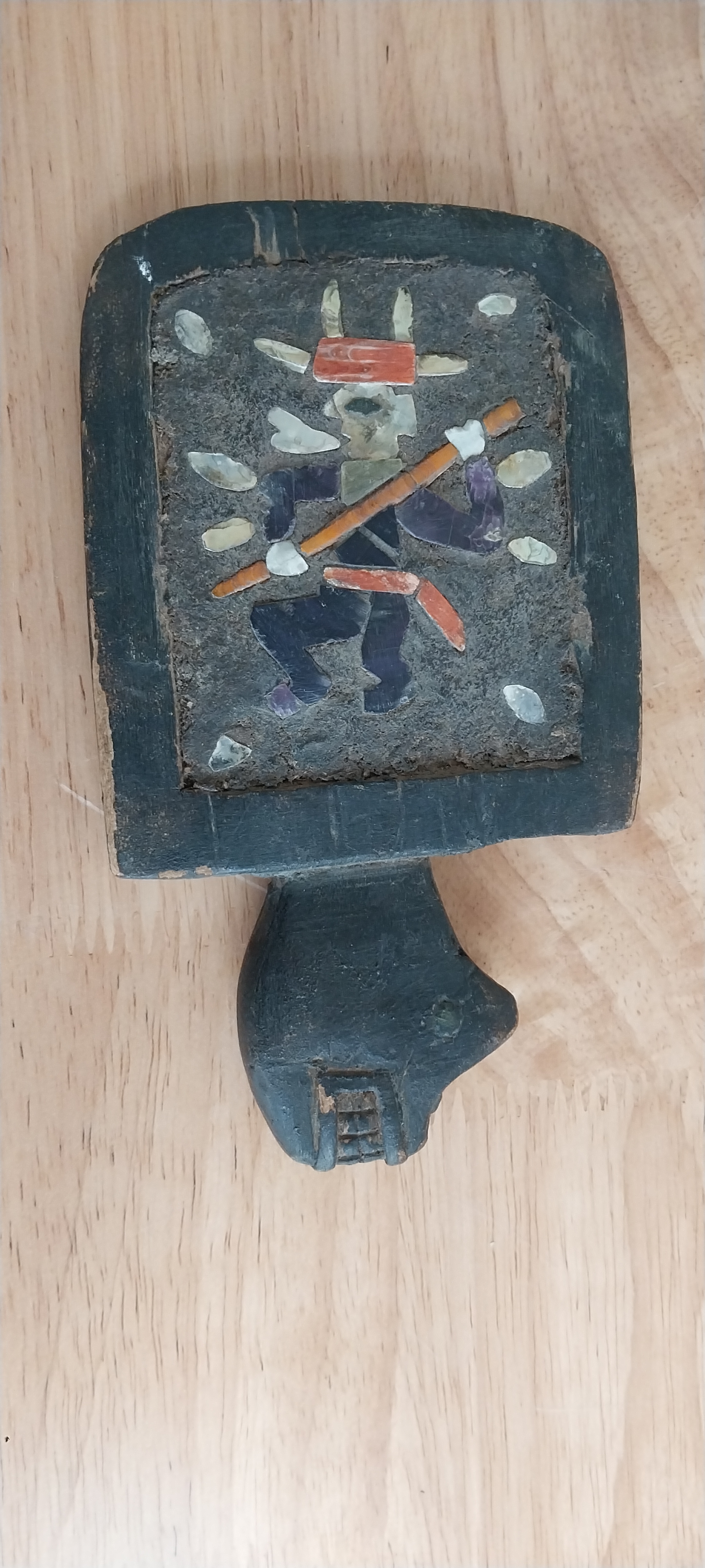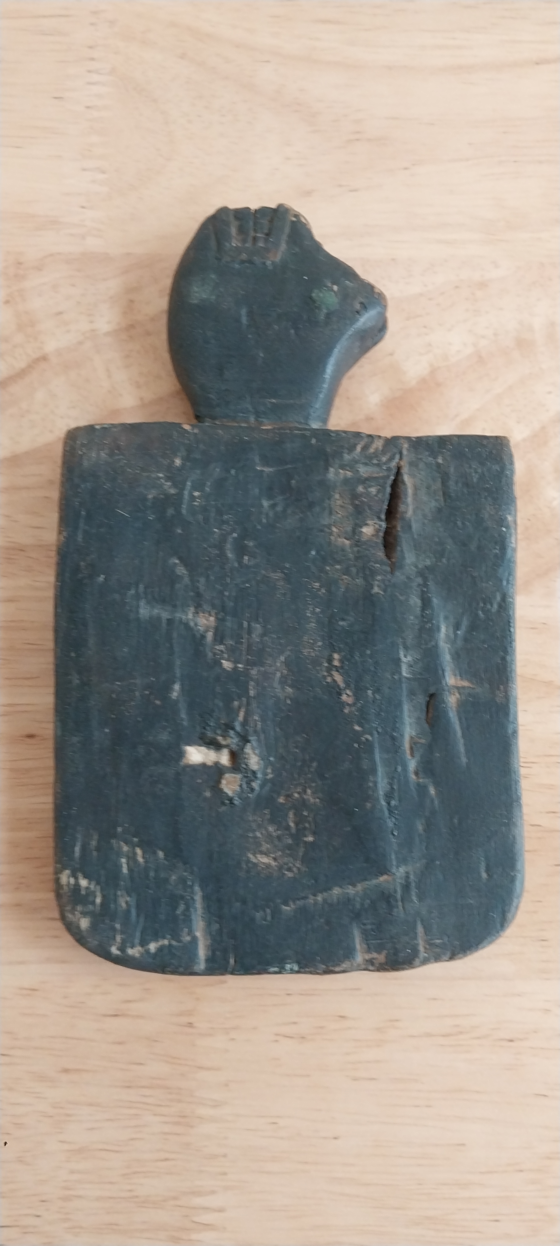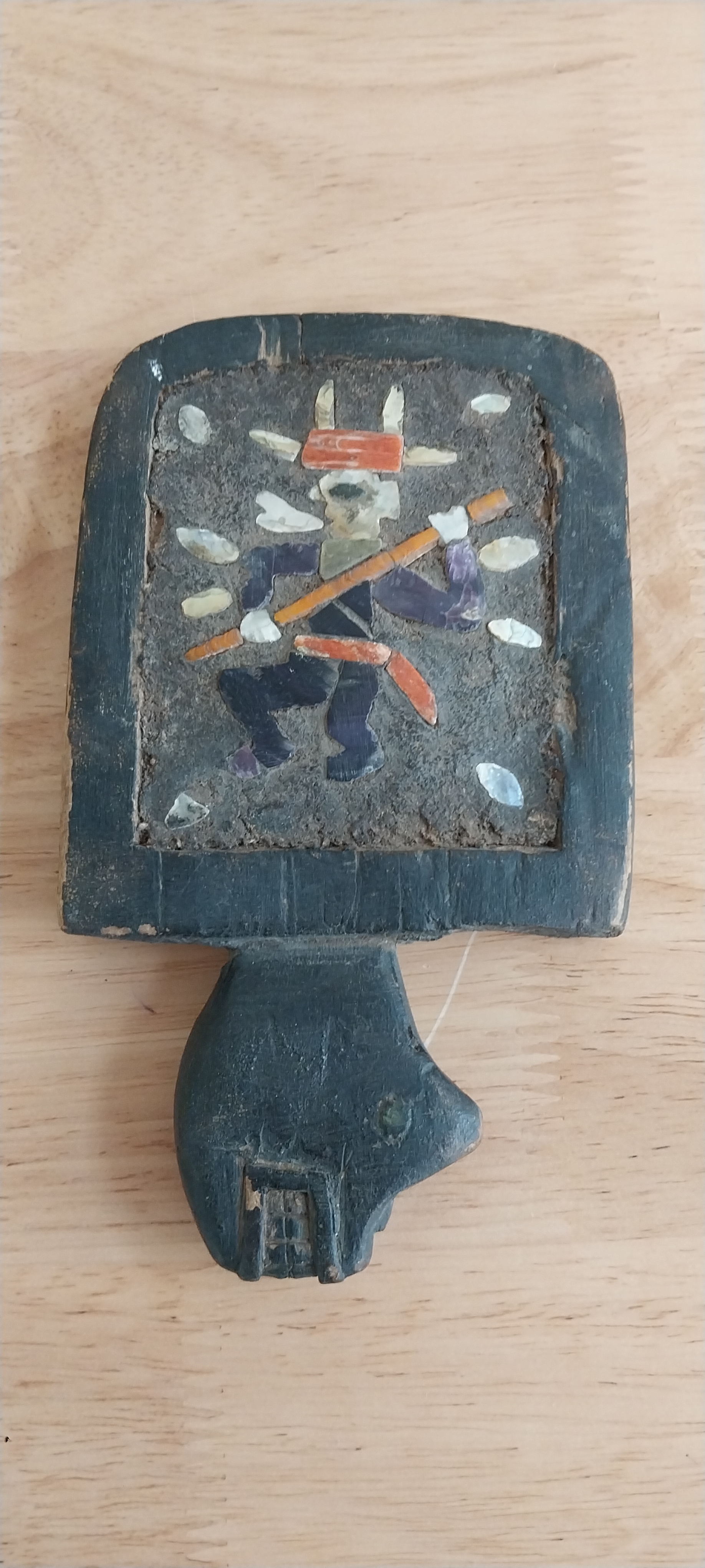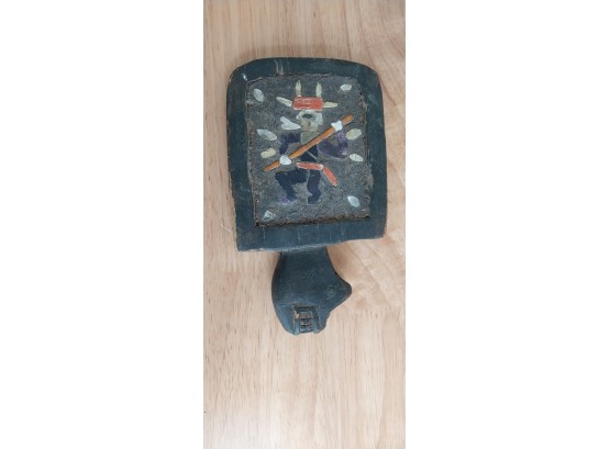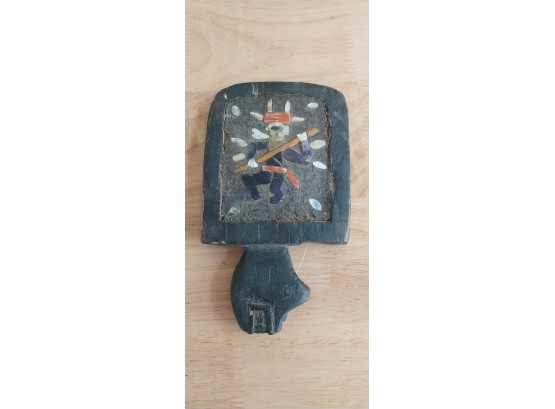 Unknown origin this is a small paddle depicting a man with pole inset on a wooden creature. May have been a piece to a larger item.