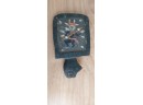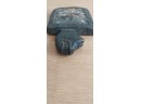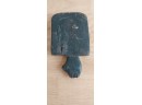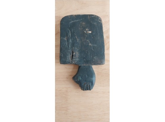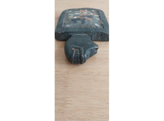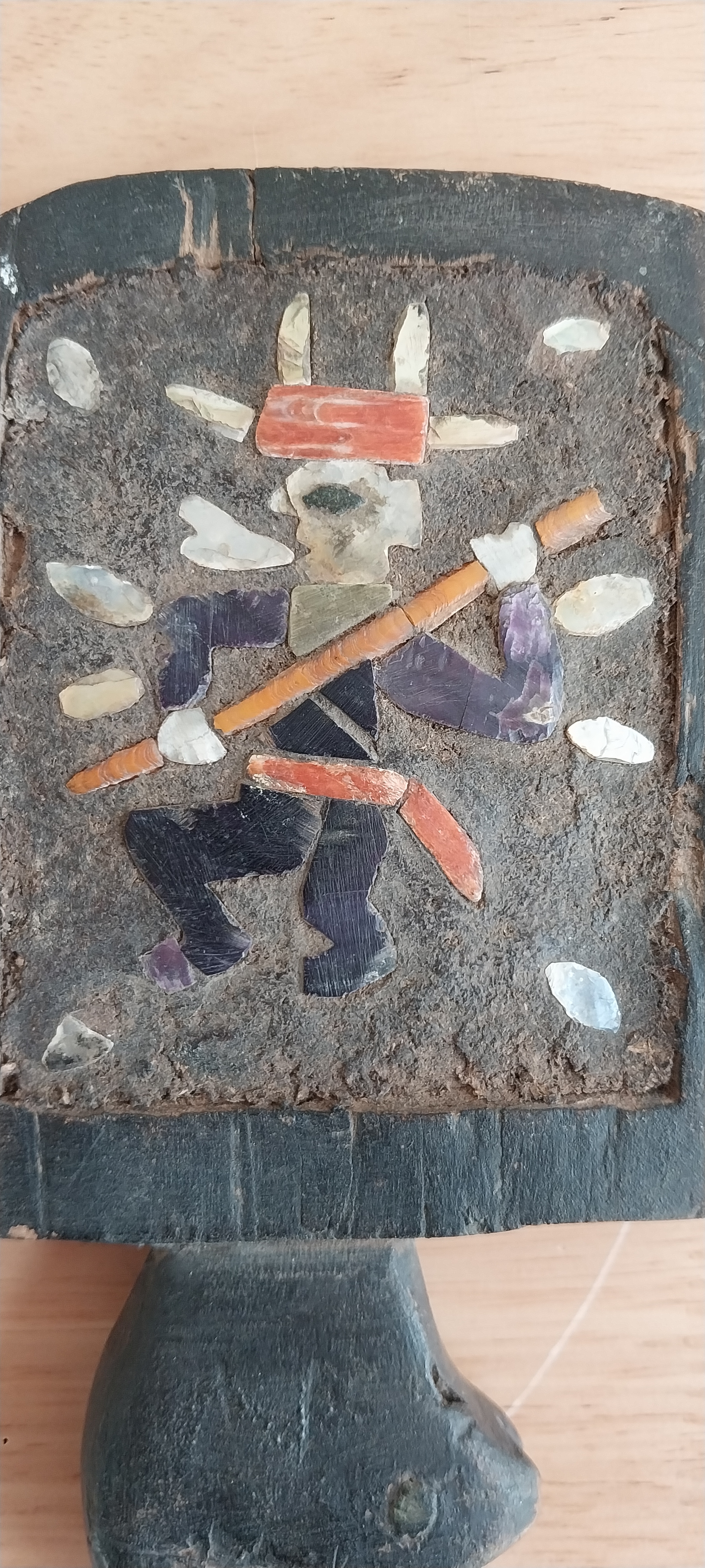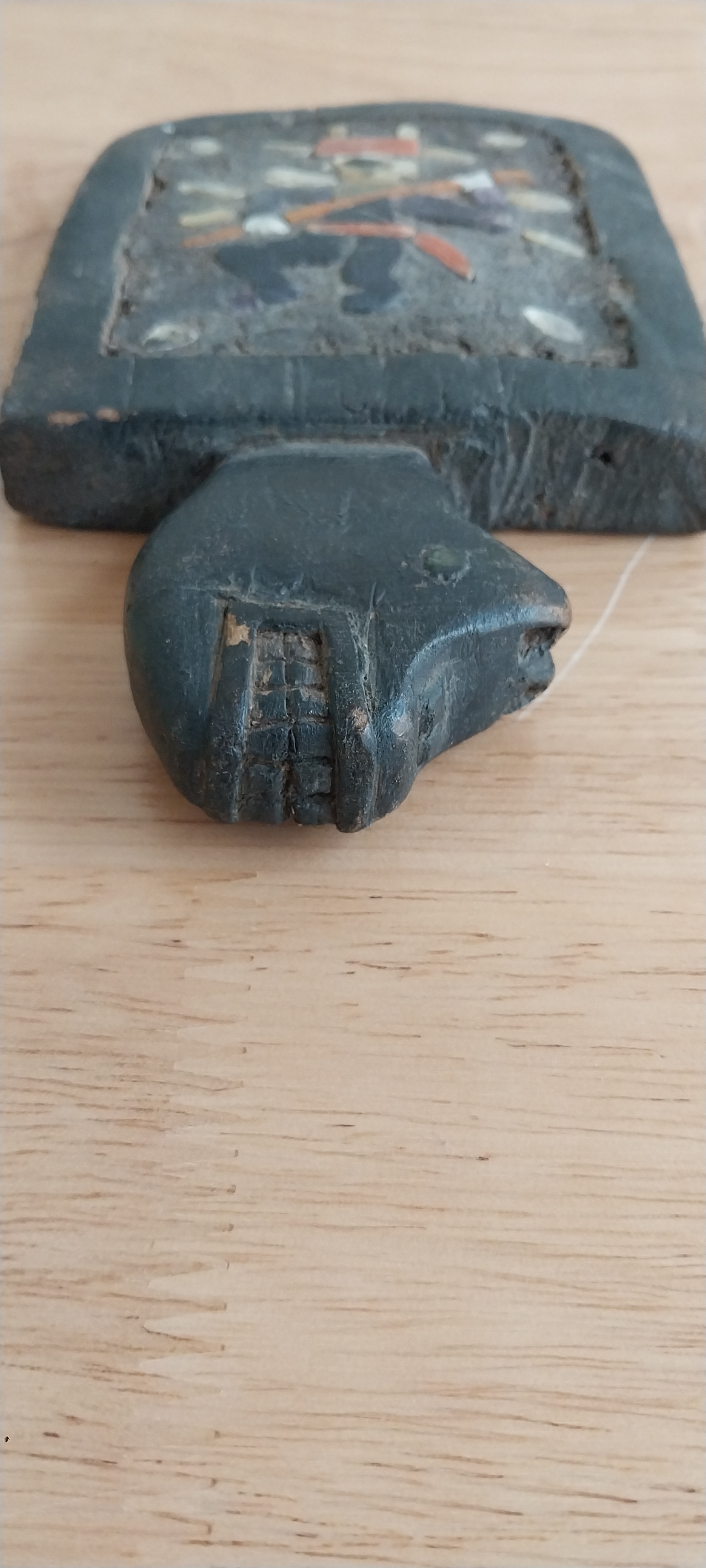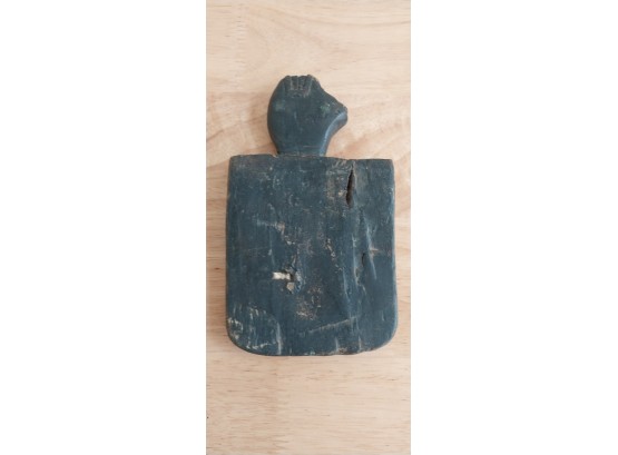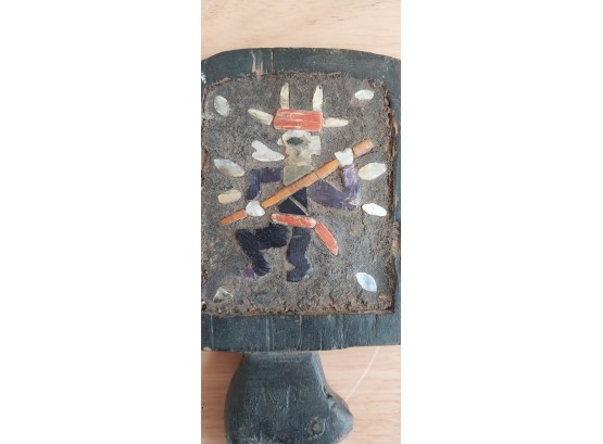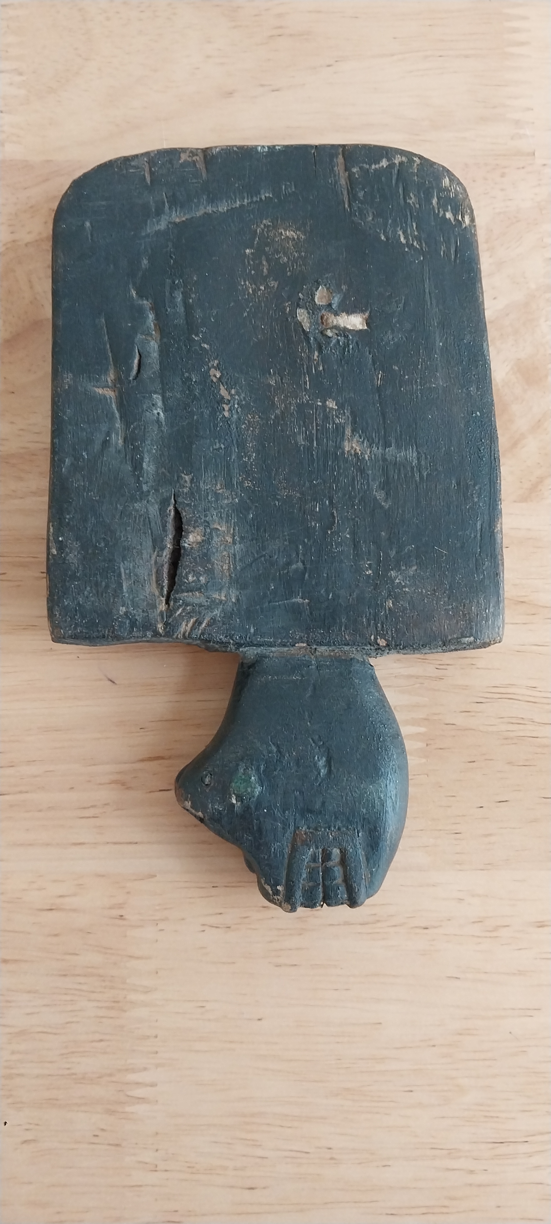 Unknown origin this is a small paddle depicting a man with pole inset on a wooden creature. May have been a piece to a larger item.