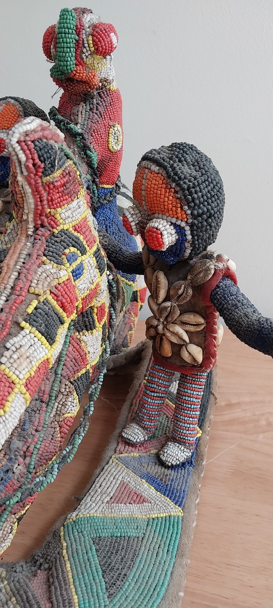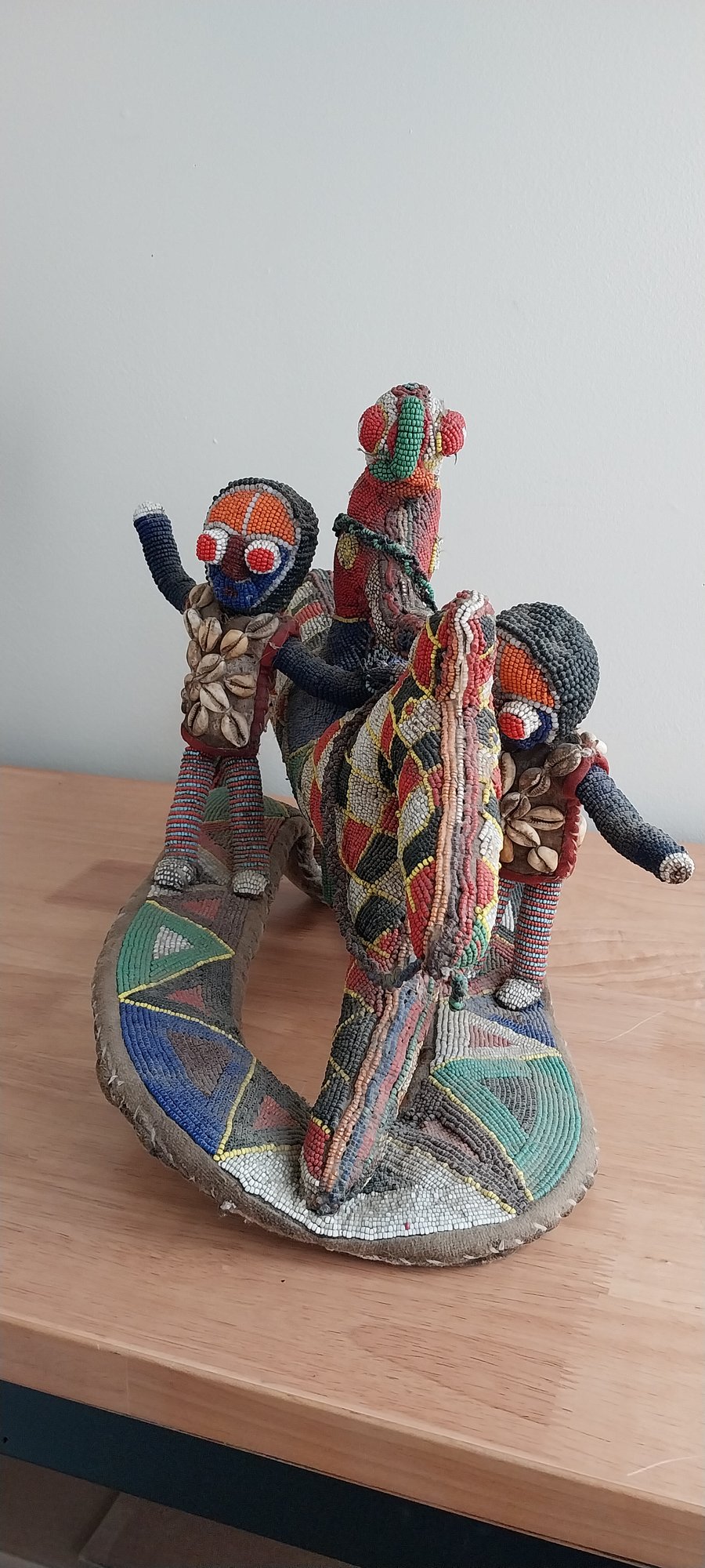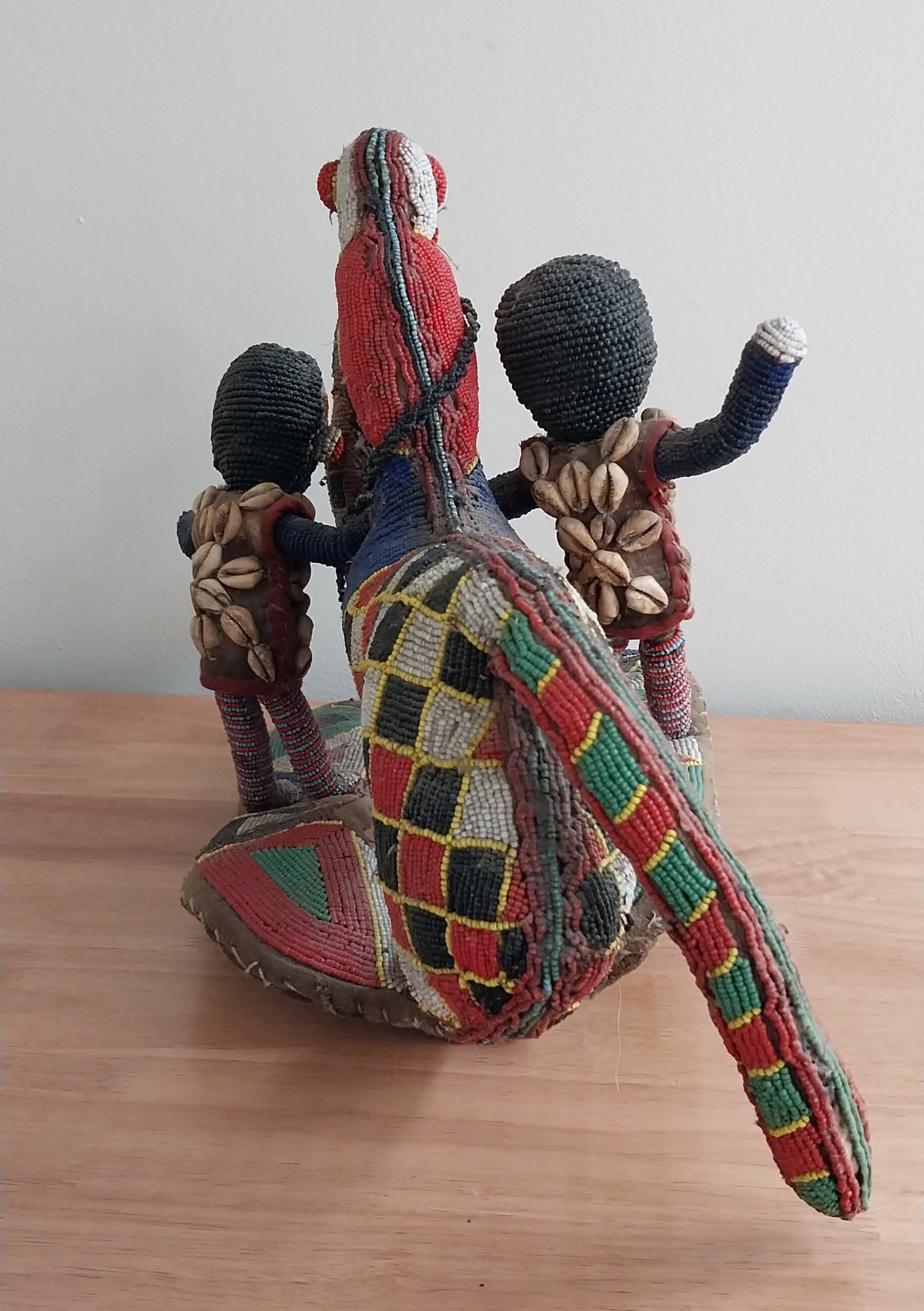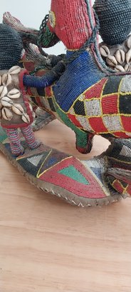 Nigerian Yoruba beaded statue atop leather and fabric mount.