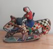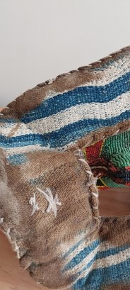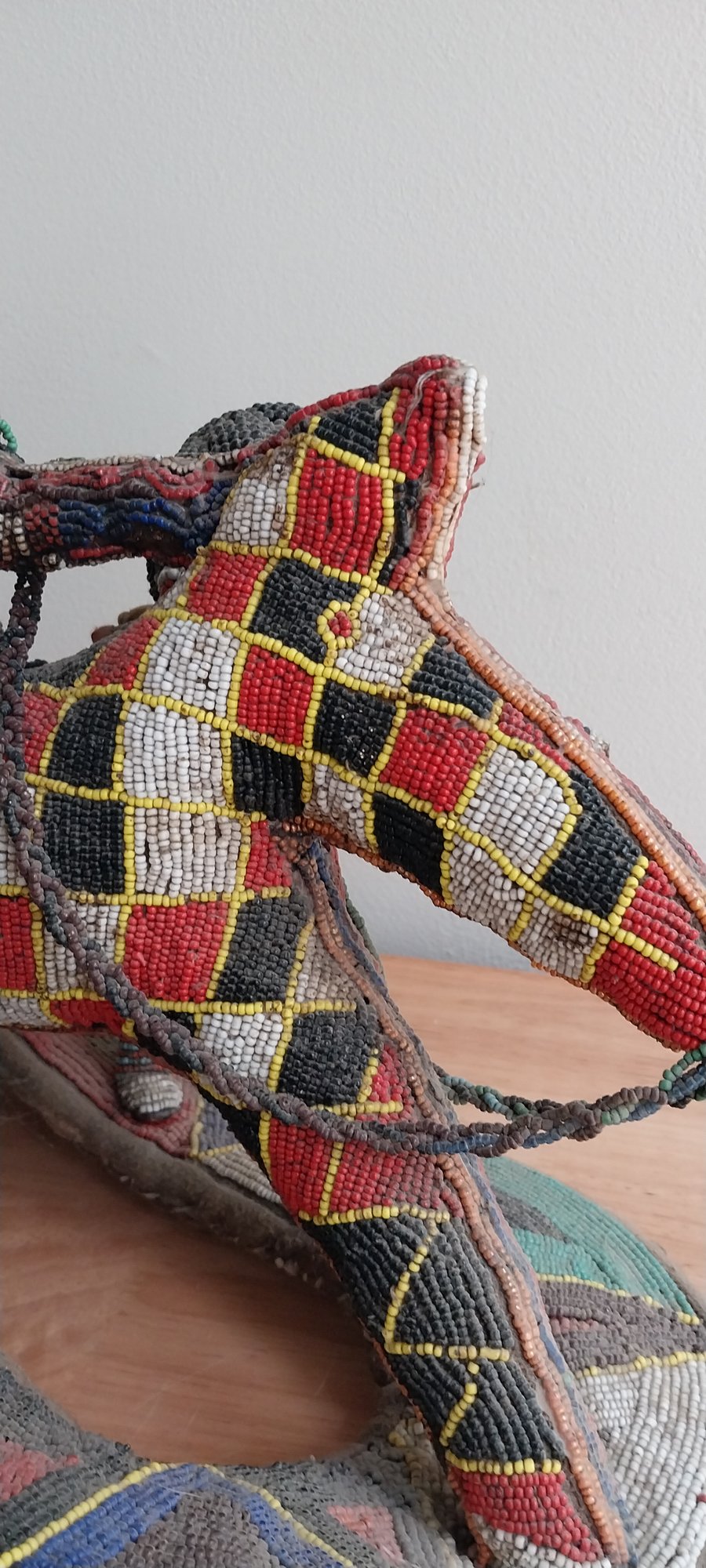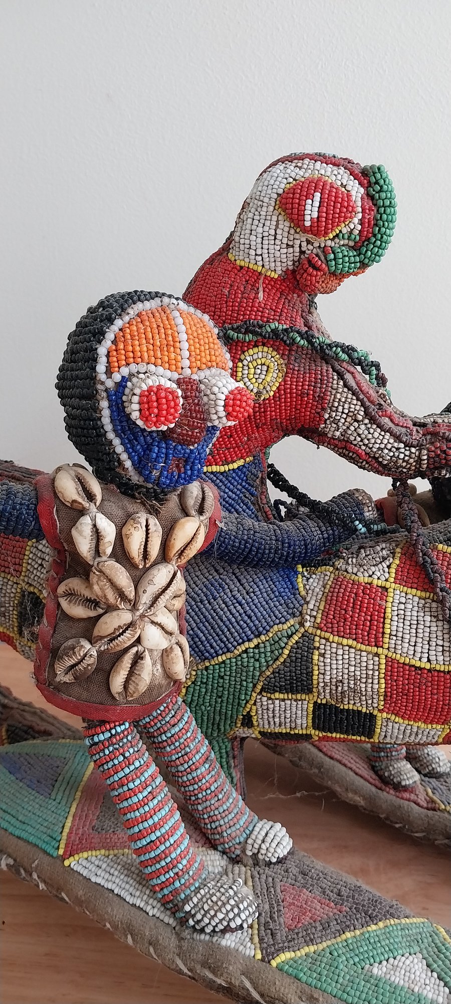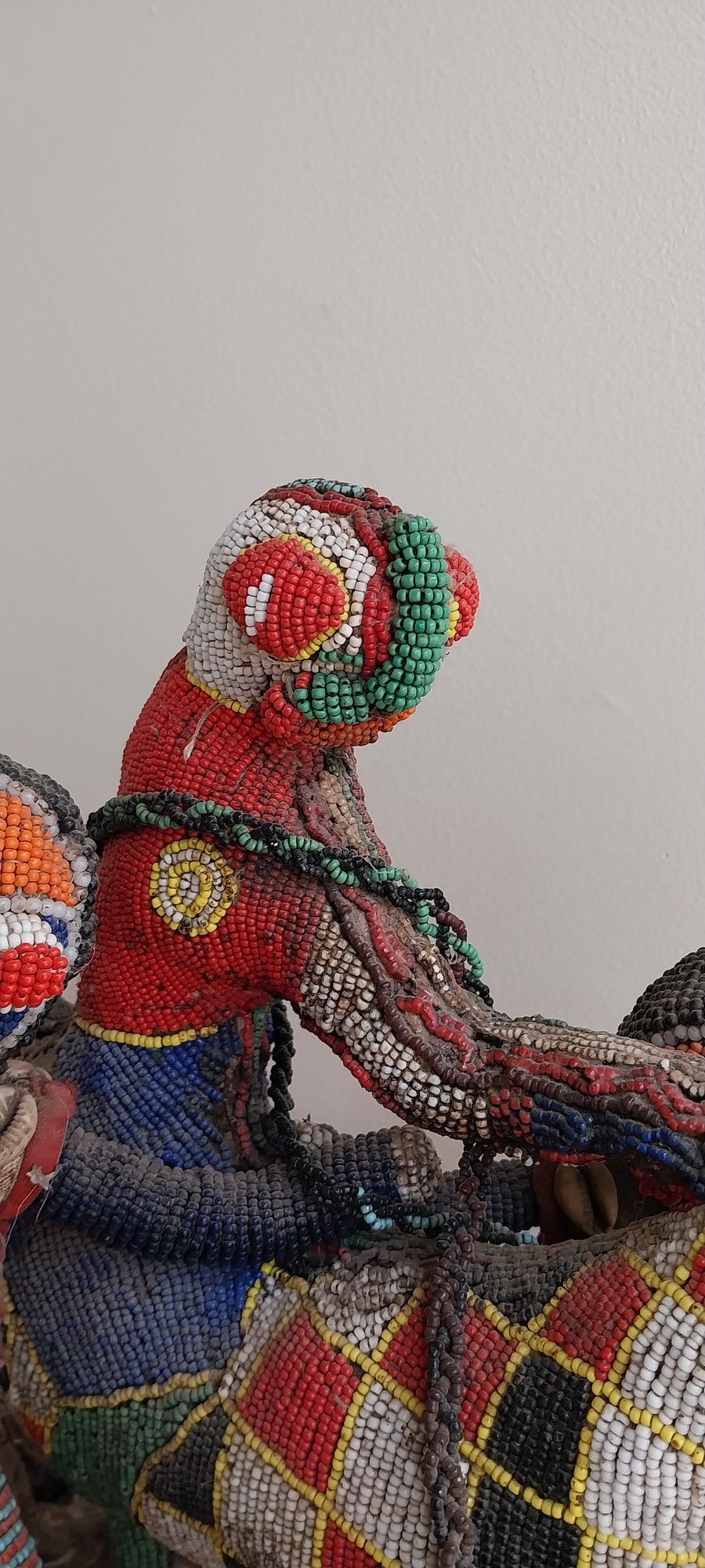 Nigerian Yoruba beaded statue atop leather and fabric mount.