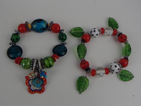The large blue bead on the fantastic glass bracelet is not glass, possibly wood.